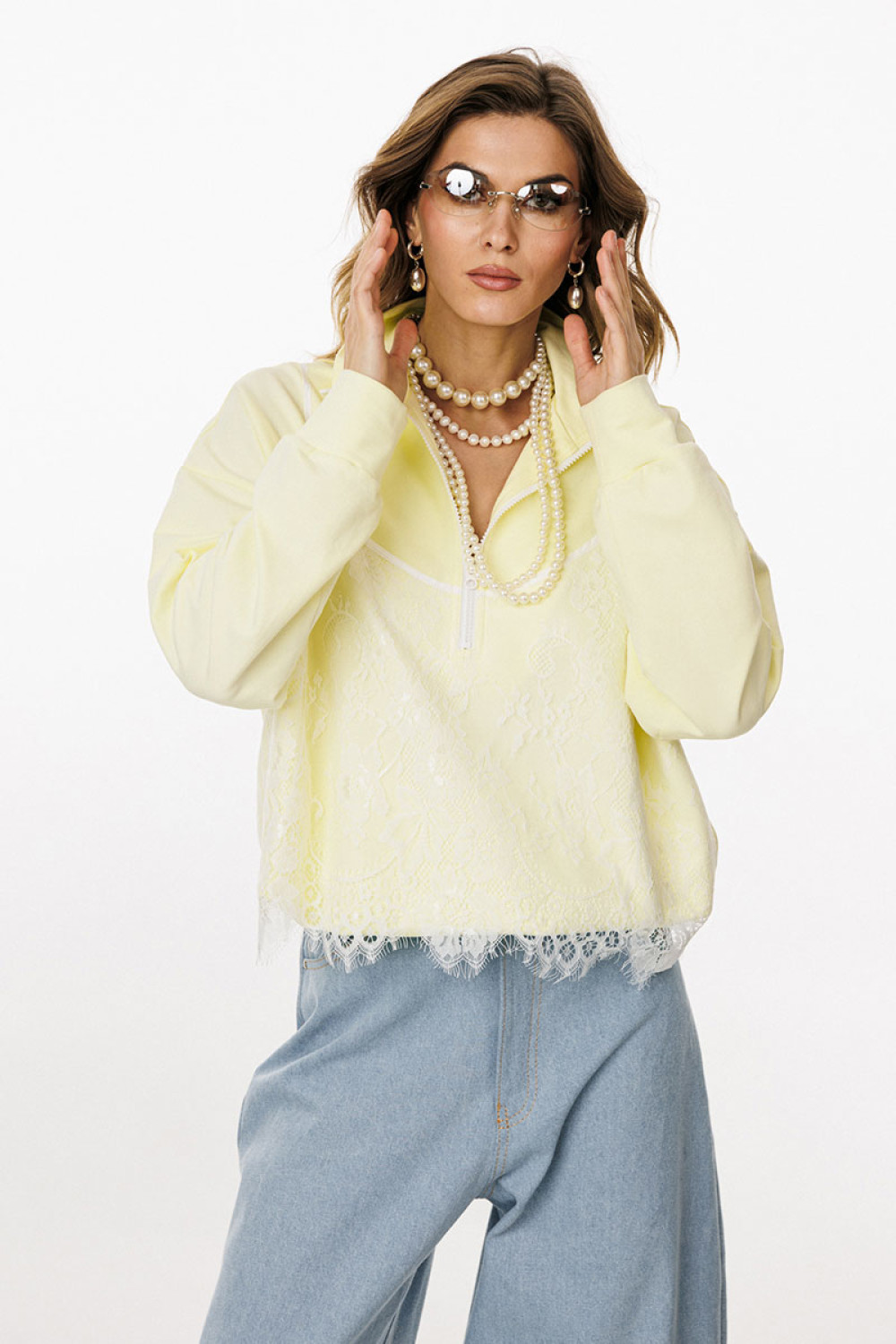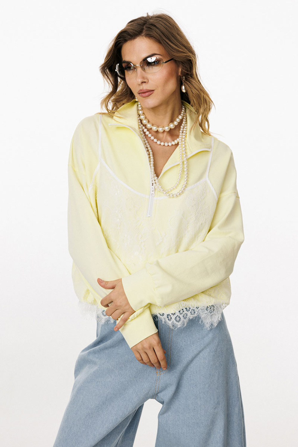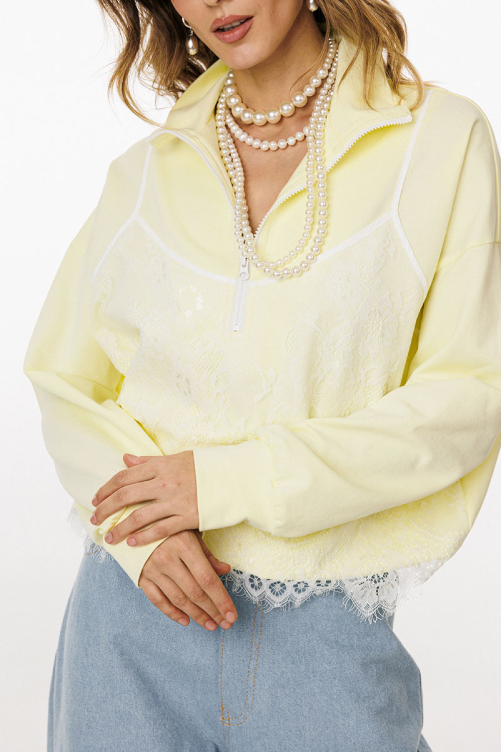 Джемпер выполнен из трикотажного полотна. Джемпер прямого силуэта, покроя oversize. Длиной до линии бедер. По переду обработана застёжка на тракторную молнию от линии груди до верха. Горловина округлой формы, обработана воротником стойкой. Плечевой шов удлинен. Рукав рубашечного покроя, одношовный. Низ рукава обработан притачной манжетой. По низу джемпера обработана эластичная тесьма с фиксаторами. Джемпер декорирован по переду кружевом, имитирующим перед топа на бретелях.