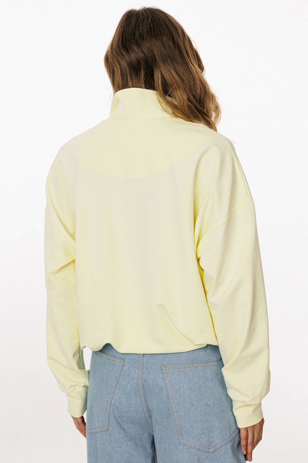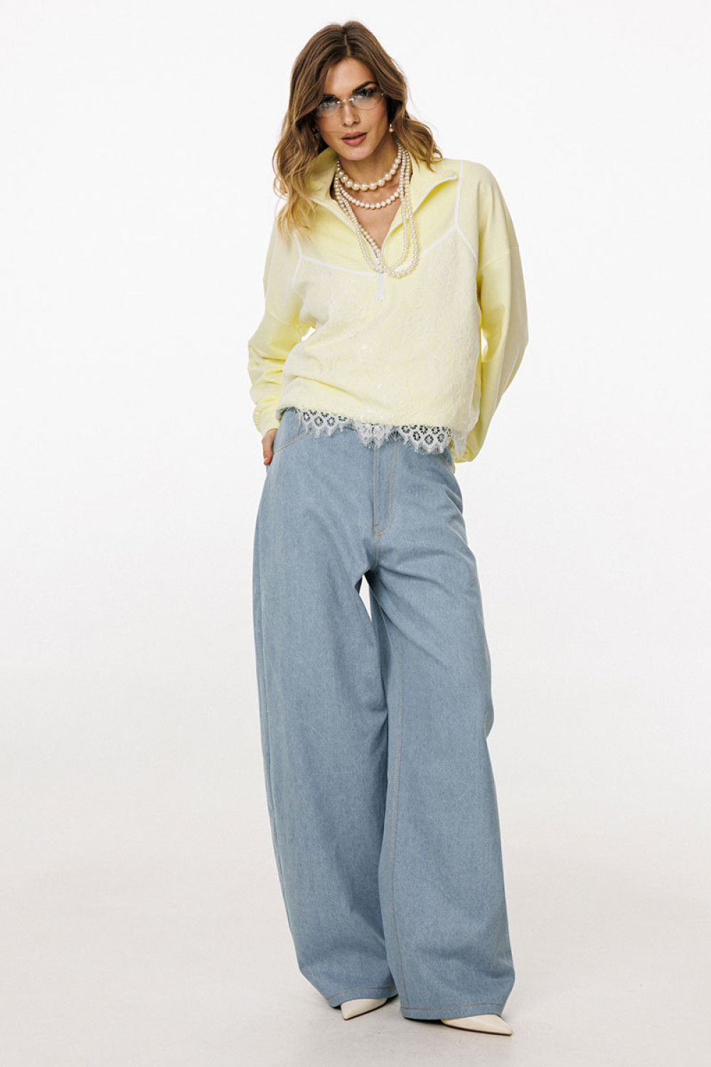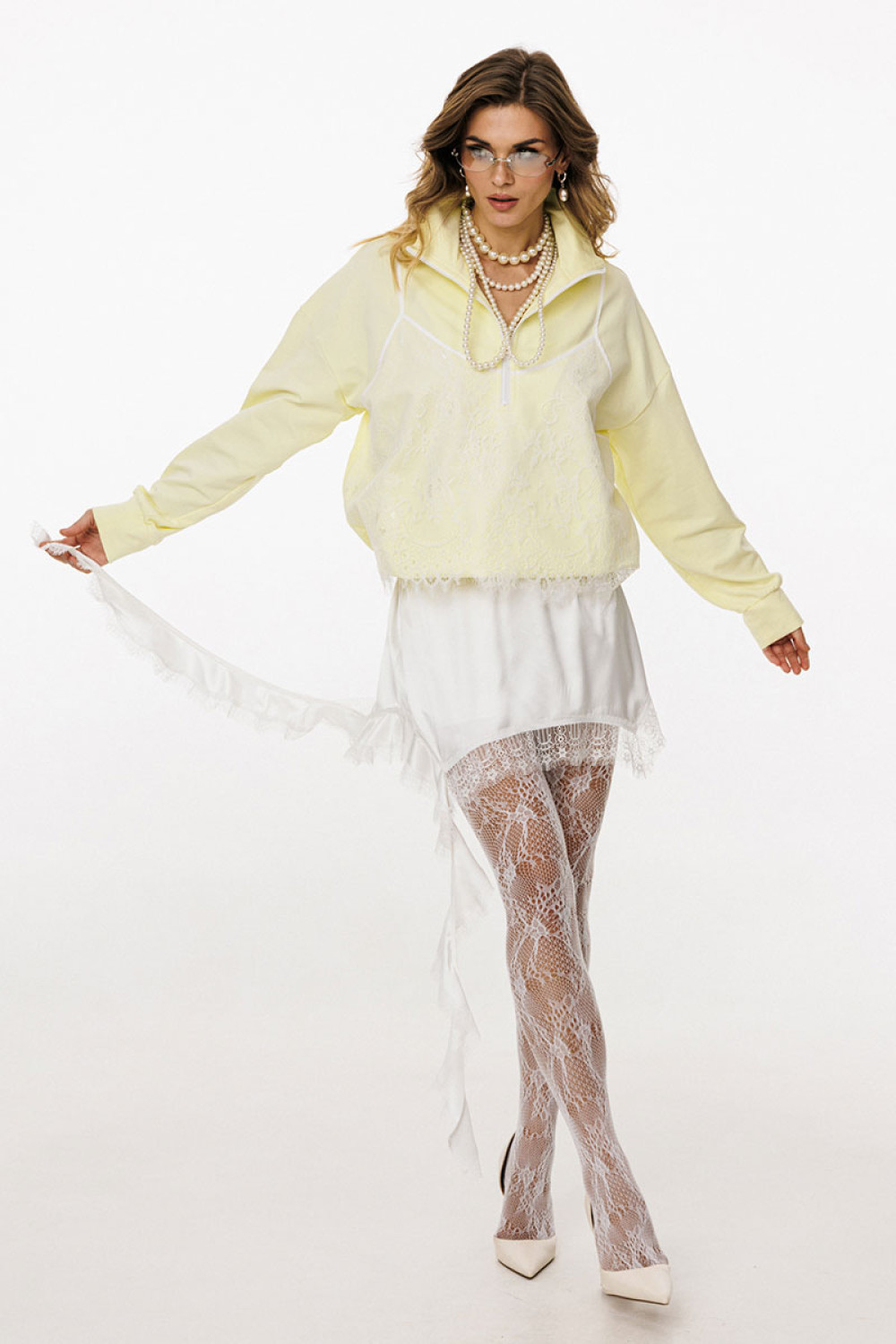 Джемпер выполнен из трикотажного полотна. Джемпер прямого силуэта, покроя oversize. Длиной до линии бедер. По переду обработана застёжка на тракторную молнию от линии груди до верха. Горловина округлой формы, обработана воротником стойкой. Плечевой шов удлинен. Рукав рубашечного покроя, одношовный. Низ рукава обработан притачной манжетой. По низу джемпера обработана эластичная тесьма с фиксаторами. Джемпер декорирован по переду кружевом, имитирующим перед топа на бретелях.