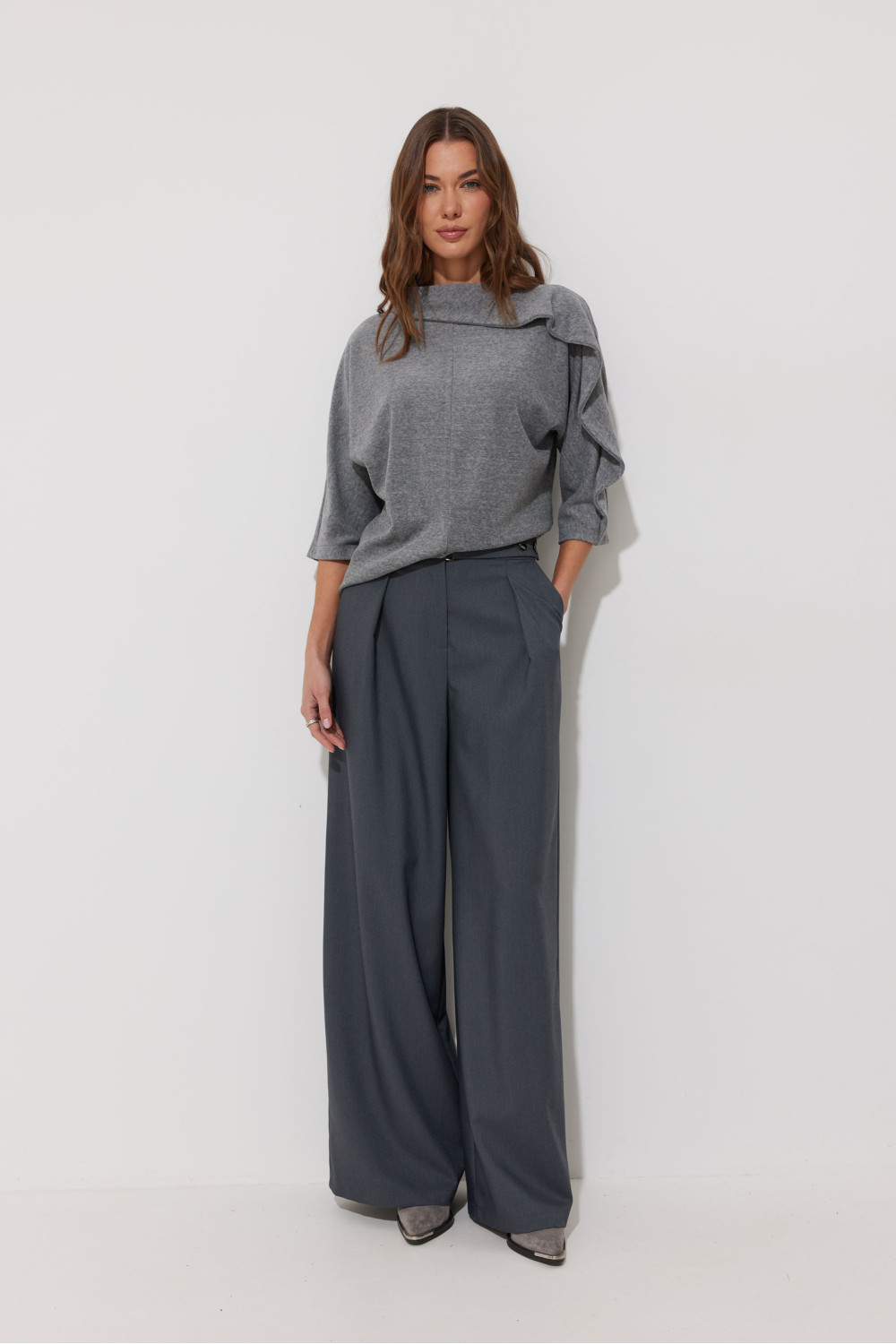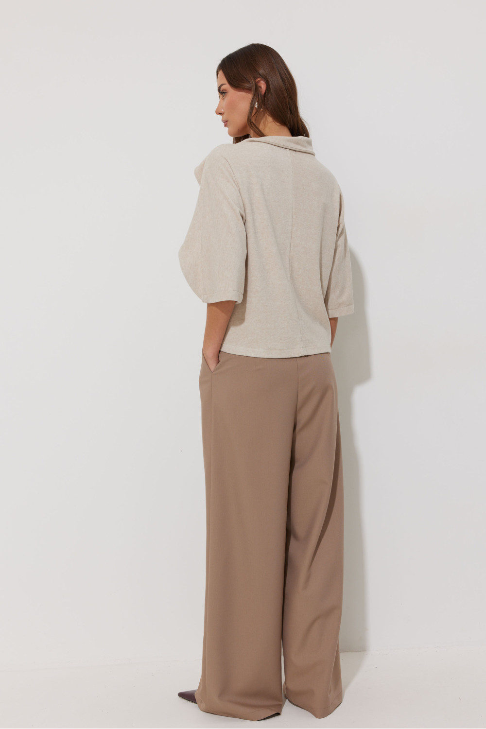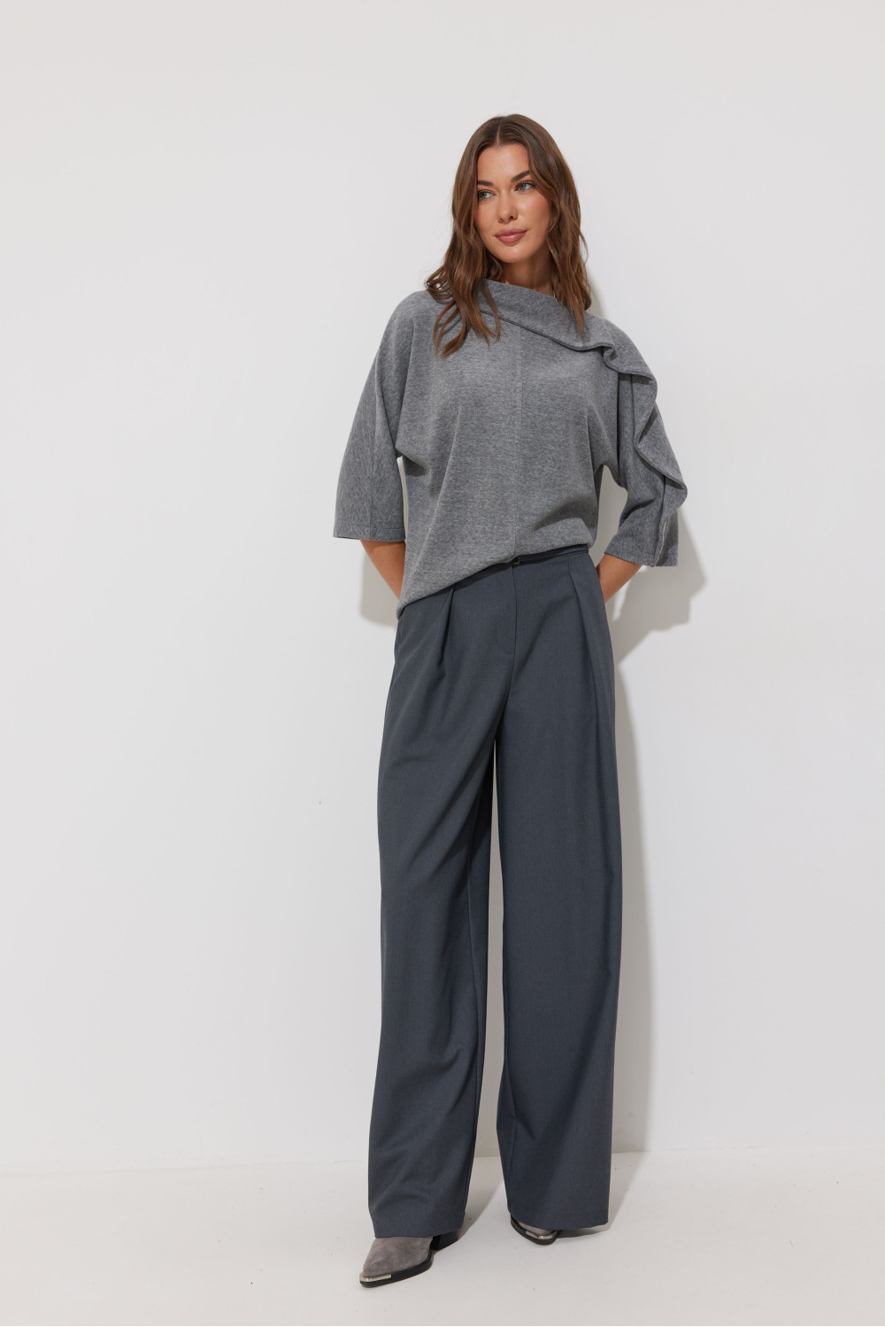Джемпер из трикотажного полотна, прямого, слегка расширенного силуэта. С вырезом горловины «лодочка». По горловине асимметричный воротник, переходящий в подрез на рукаве. Рукав цельнокроеный, длина немного ниже линии локтя. Перед и спинка со средним швом.