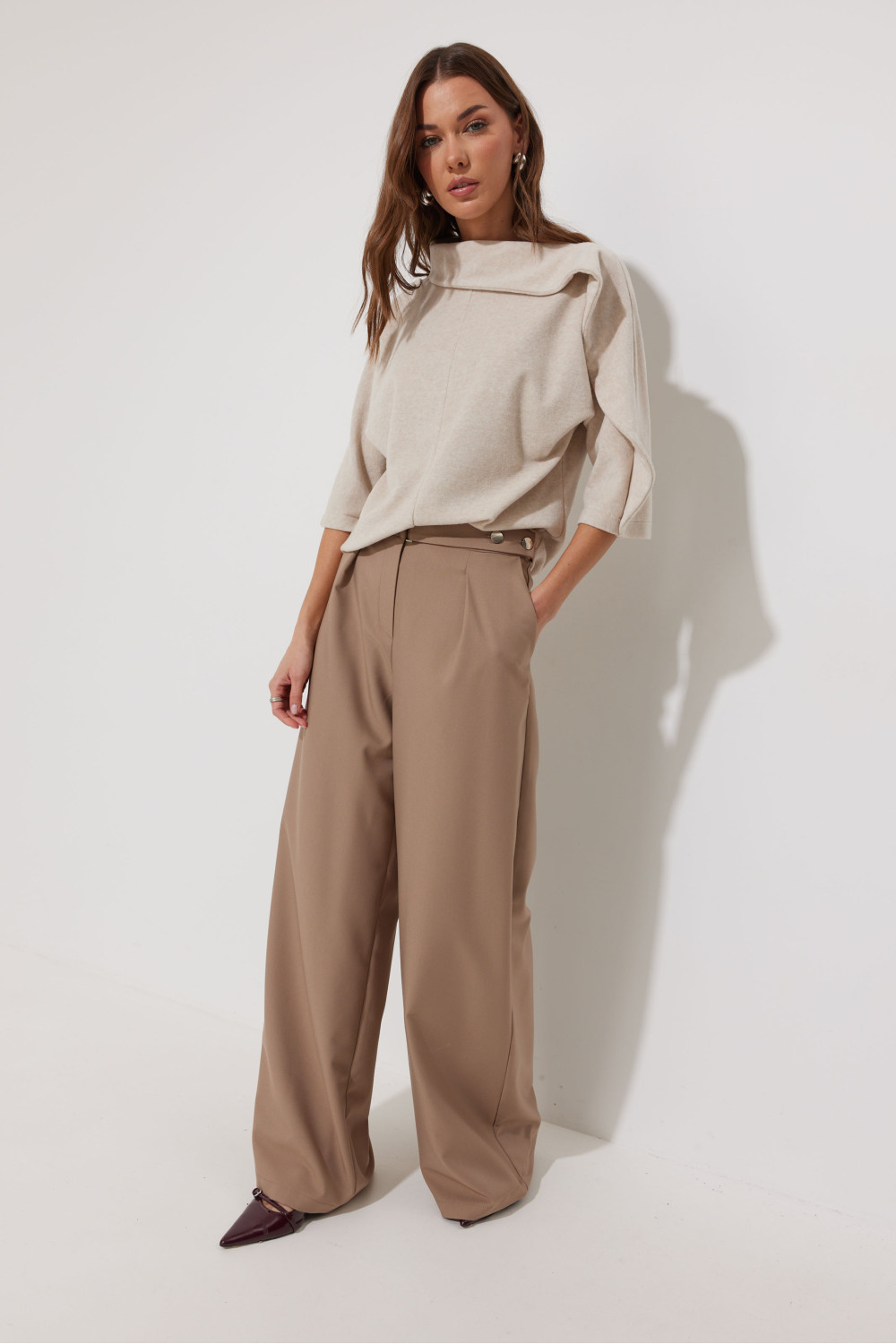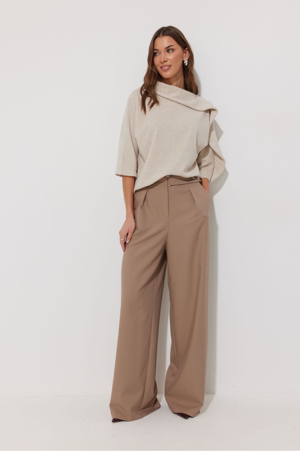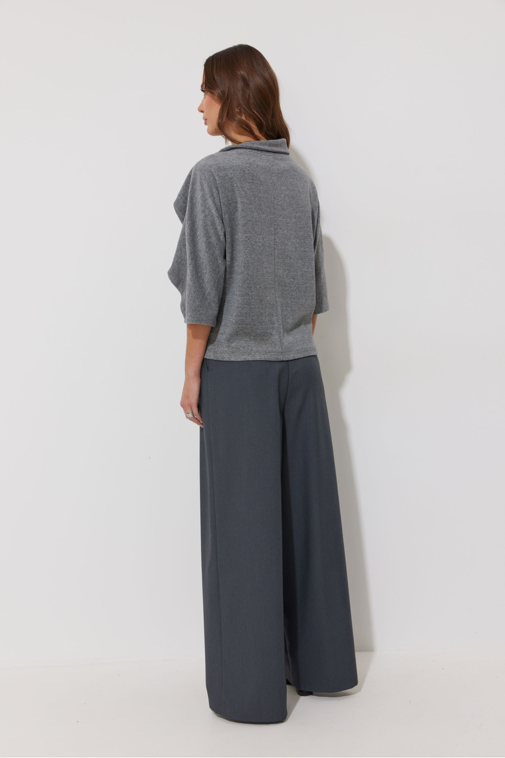 Джемпер из трикотажного полотна, прямого, слегка расширенного силуэта. С вырезом горловины «лодочка». По горловине асимметричный воротник, переходящий в подрез на рукаве. Рукав цельнокроеный, длина немного ниже линии локтя. Перед и спинка со средним швом.