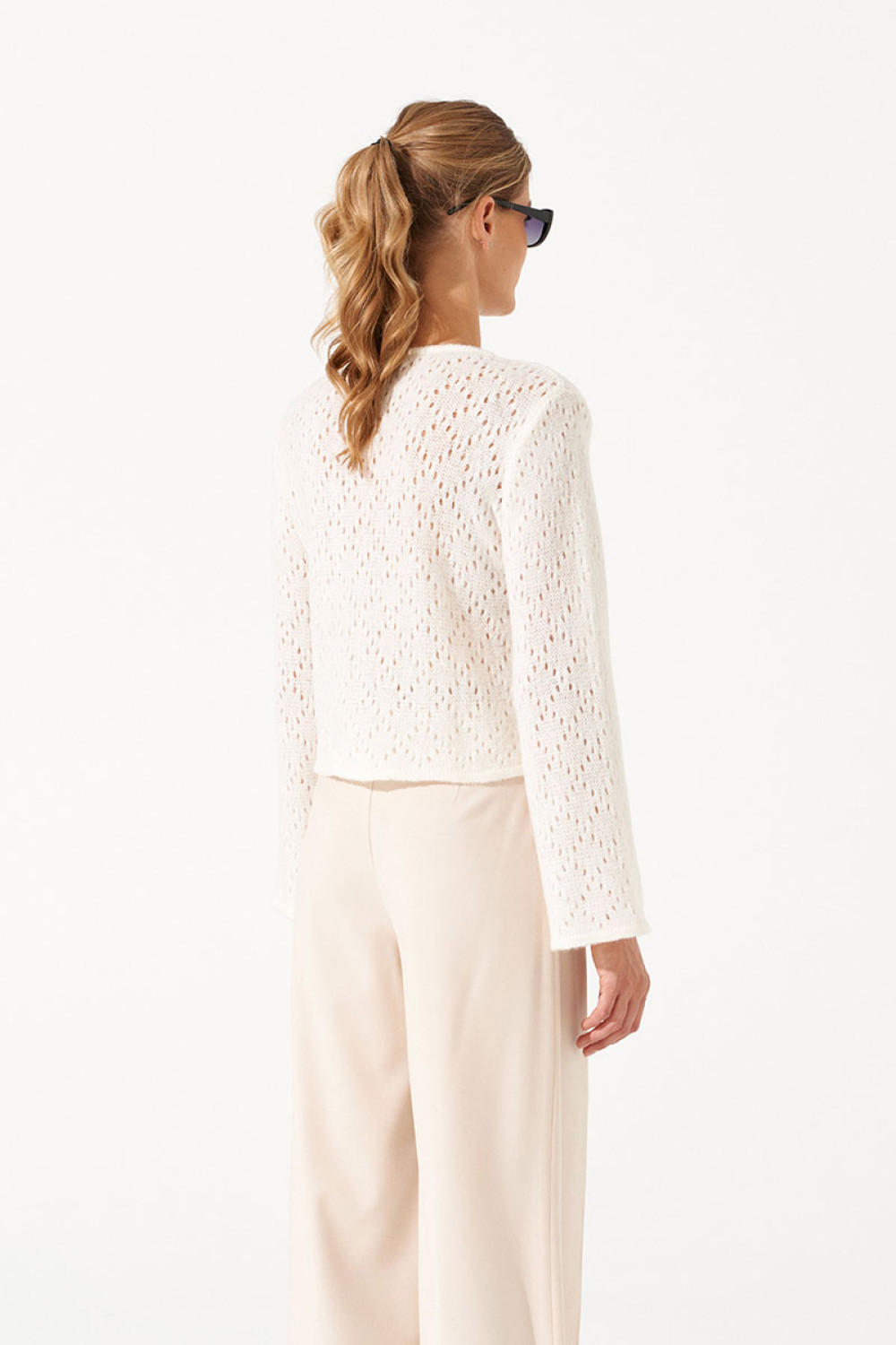 Дизайн: жакет с длинными рукавами, застёжкой на пуговицы и ажурными вставками на груди. Такие детали придают изделию оригинальность и женственность;