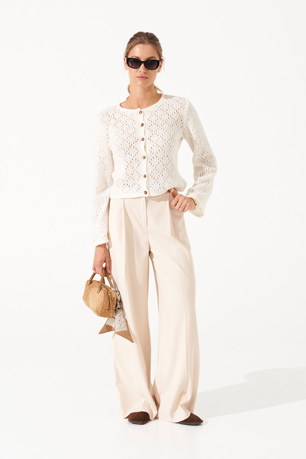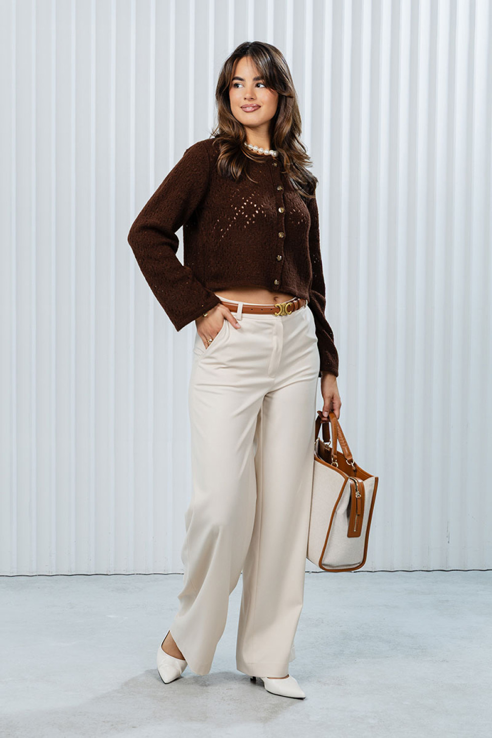 Жакет отлично сочетается с белыми брюками, как на фото, джинсами или юбками. Для завершения образа подойдут туфли на каблуке, лодочки или стильные ботинки. Дополните образ минималистичными аксессуарами, такими как жемчужное ожерелье или тонкий браслет.