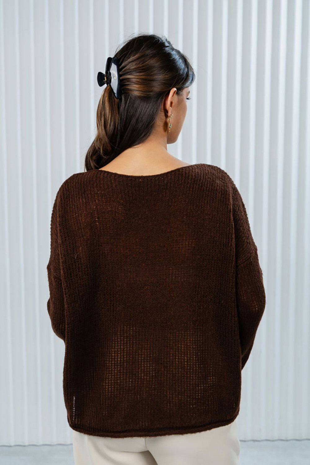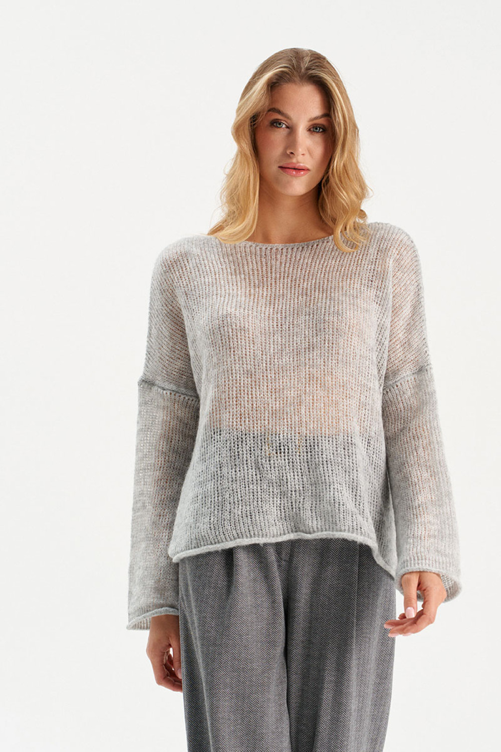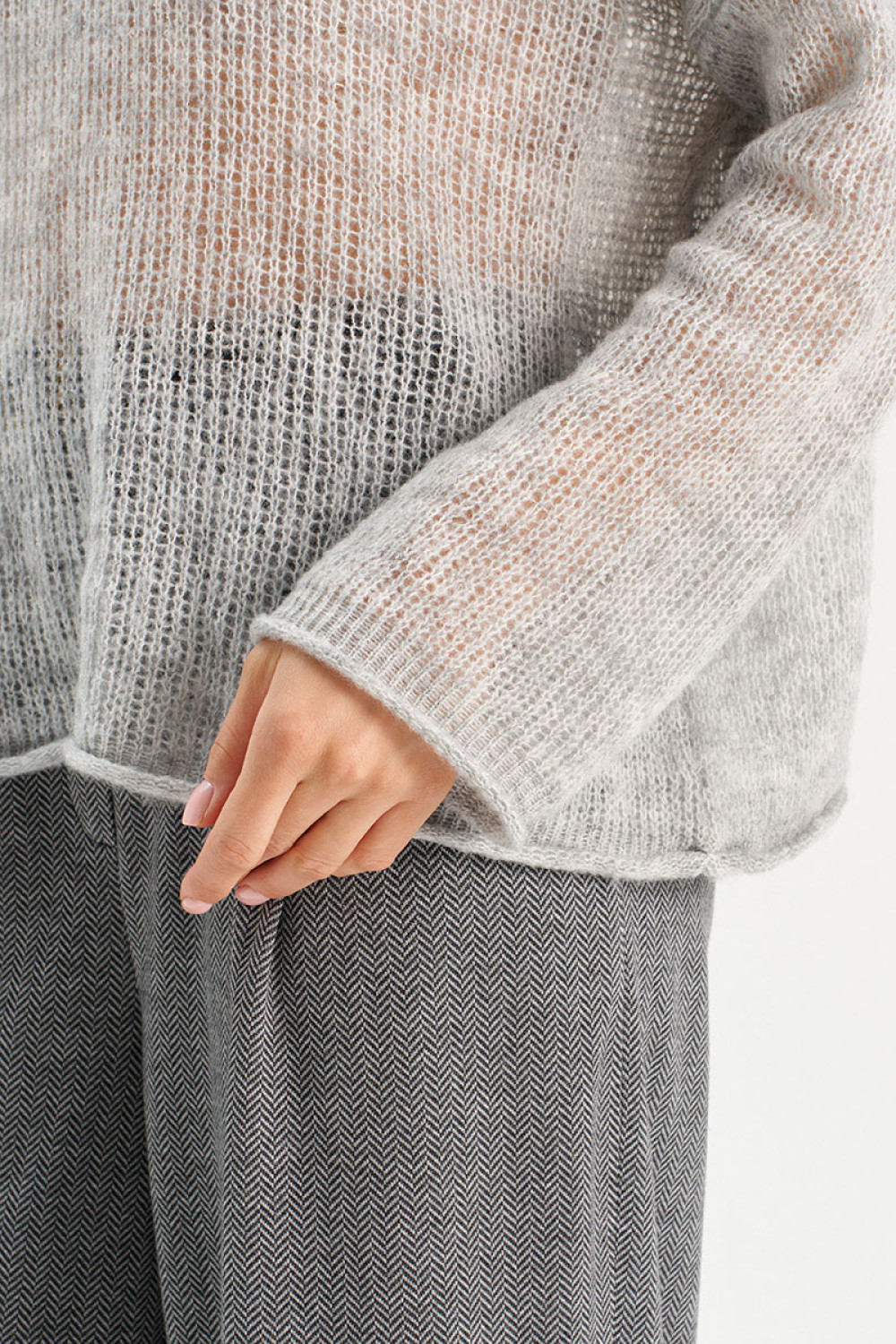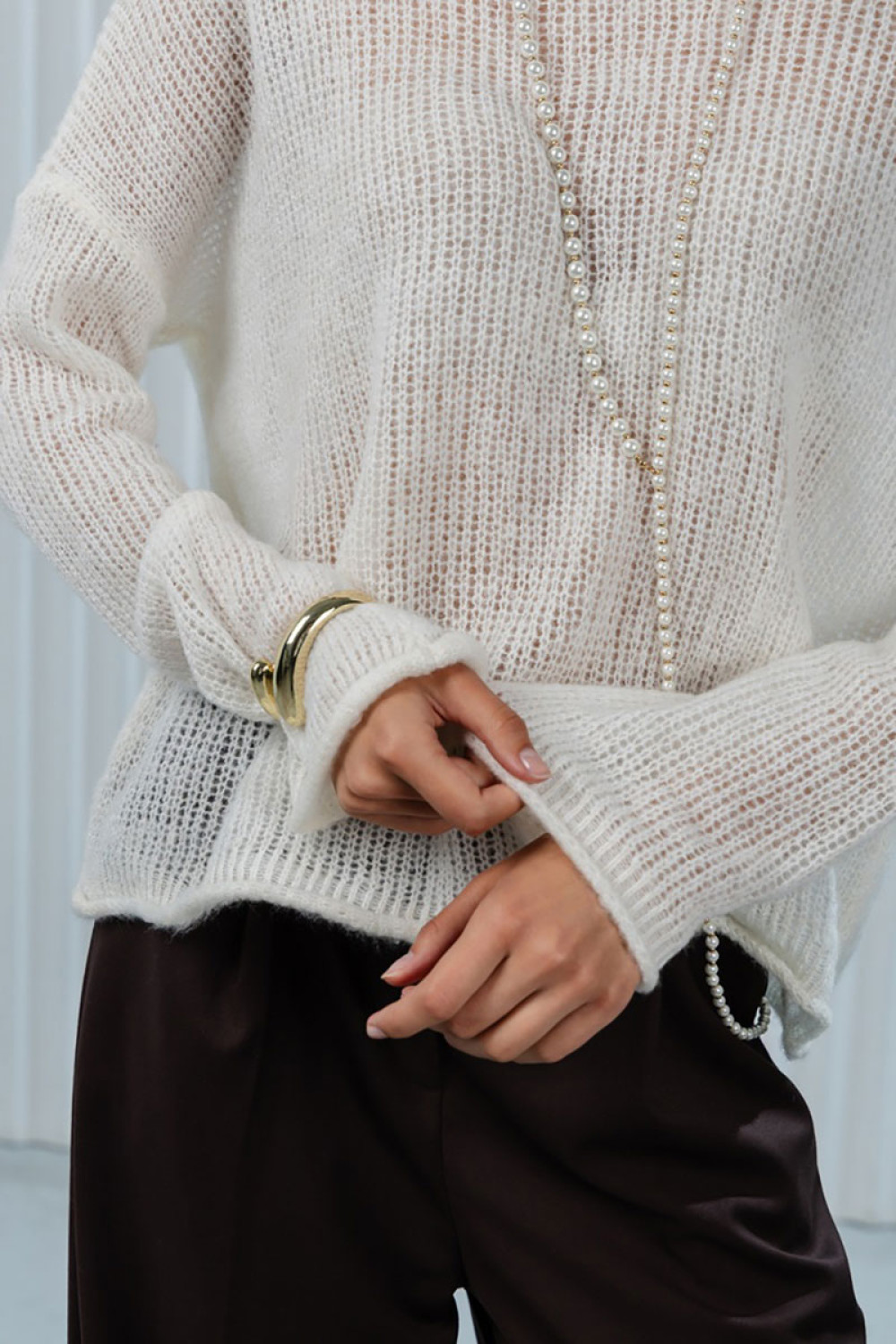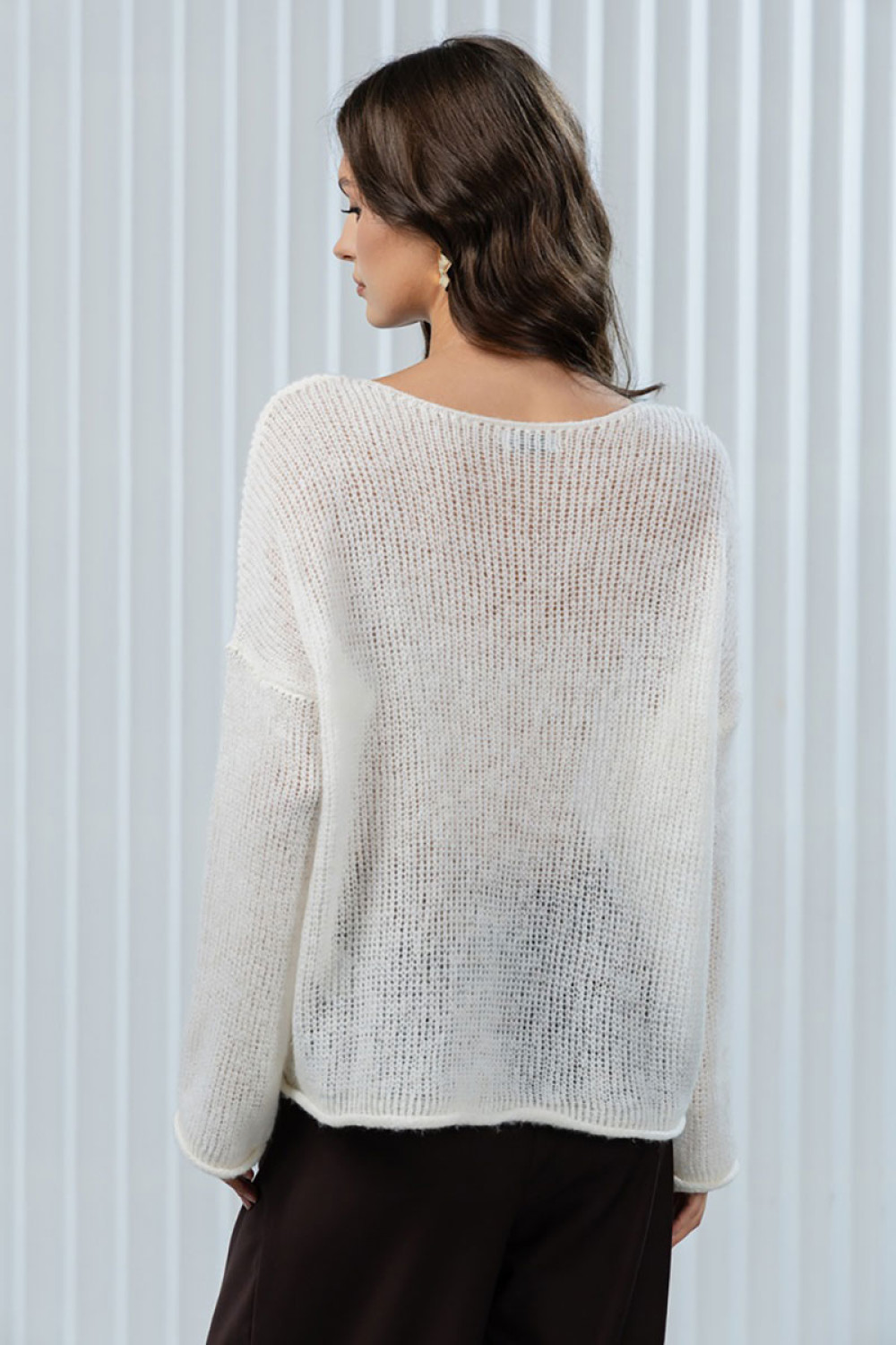 Ажурный вязаный узор — добавляет изысканности и лёгкости, делая джемпер универсальным для разных стилей.