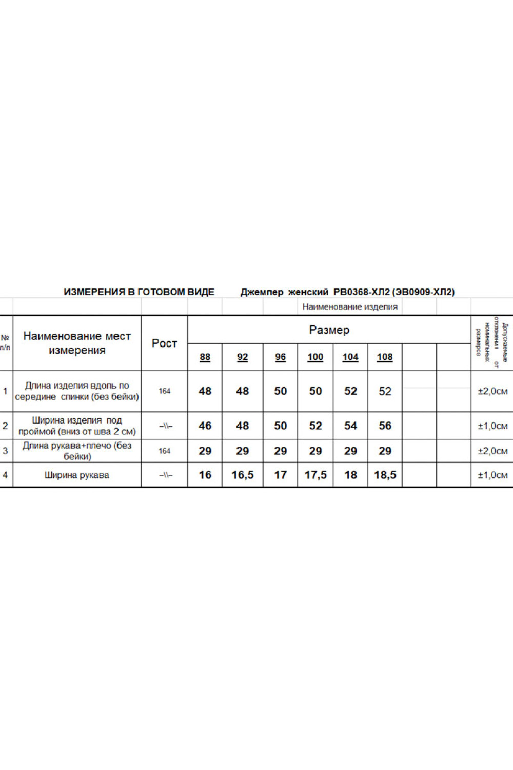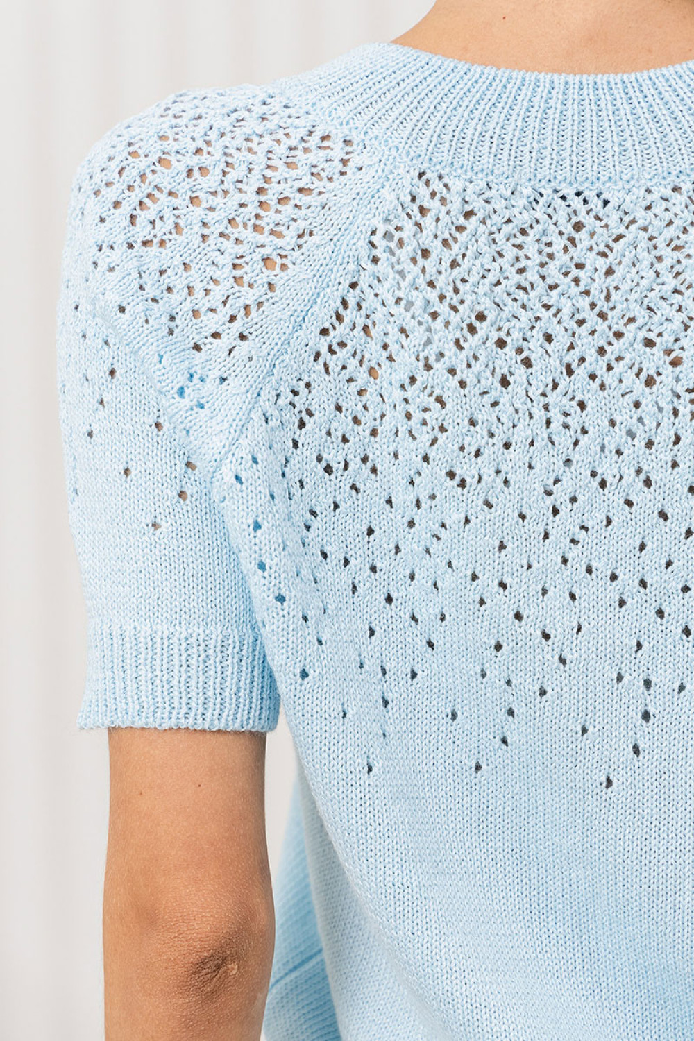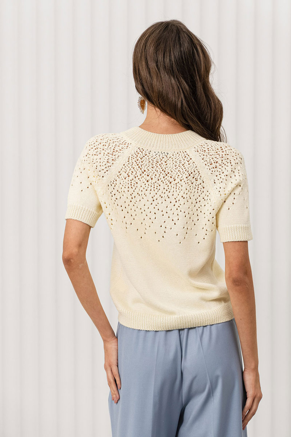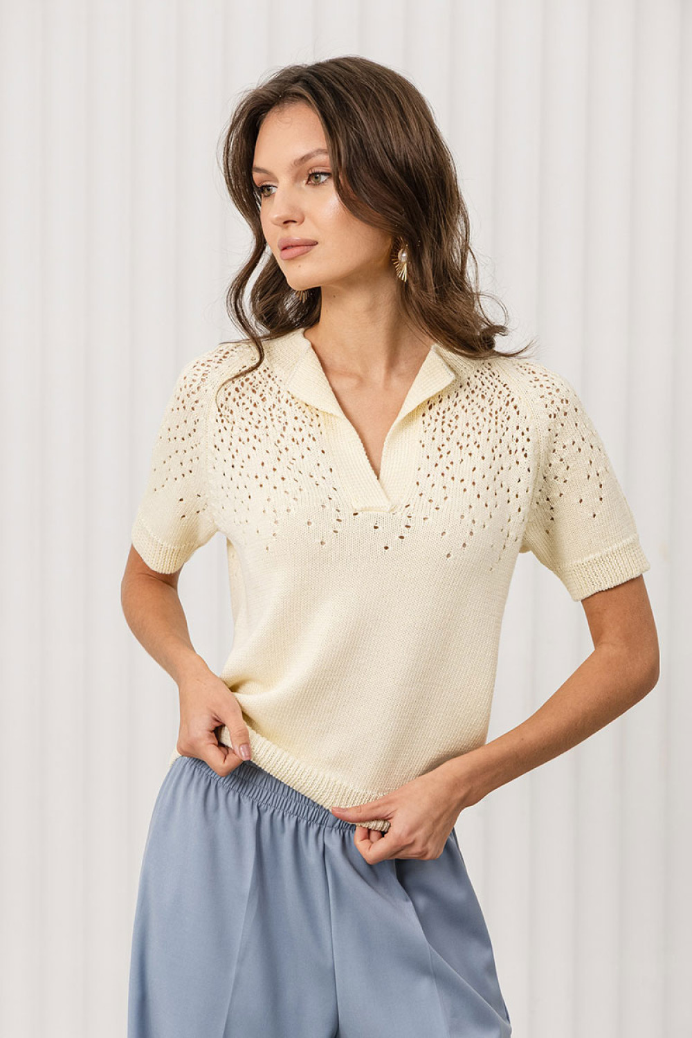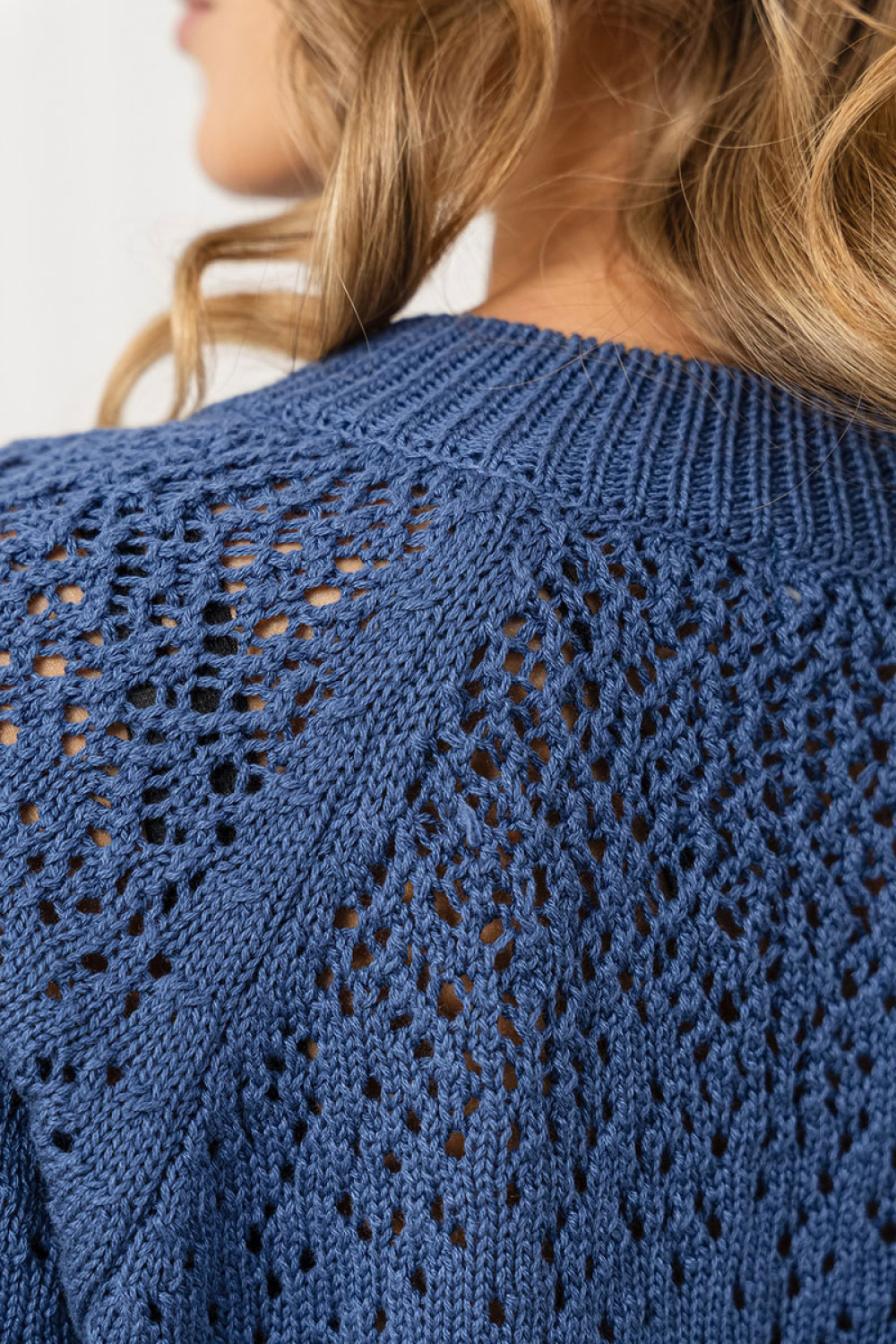 Джемпер прямого силуэта связан из пряжи, в состав которой входит 50% хлопка, 50% ПАН. Джемпер очень мягкий и приятный к телу, вывязан переплетением кулирная гладь, переходящая к плечевому поясу в ажур. Рукав реглан, длиной до локтя. Круглая горловина и разрез по переду обработаны накеттлеванной бейкой. Низ изделия, низ рукава и бейка горловины связаны переплетением ластик 1*1.