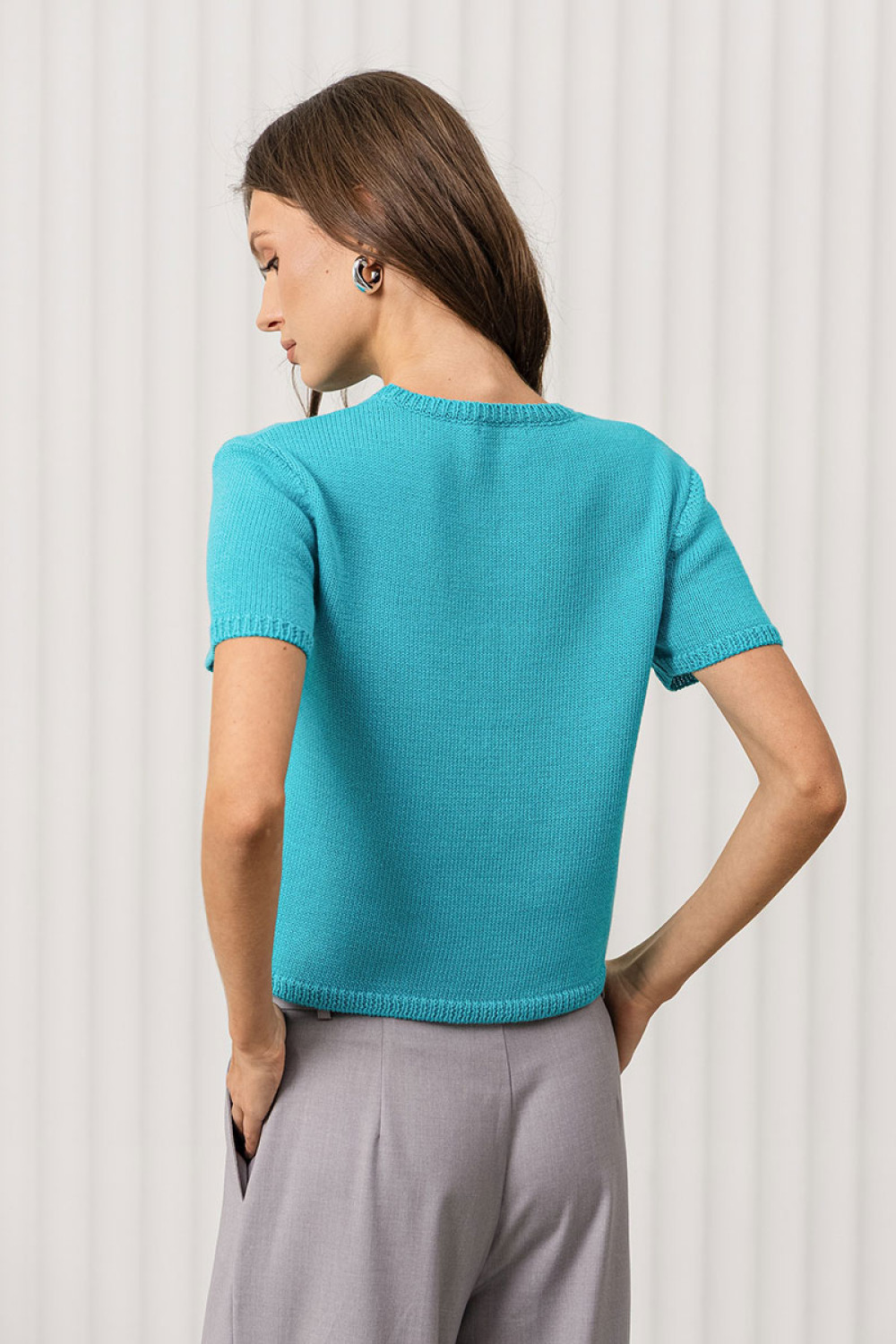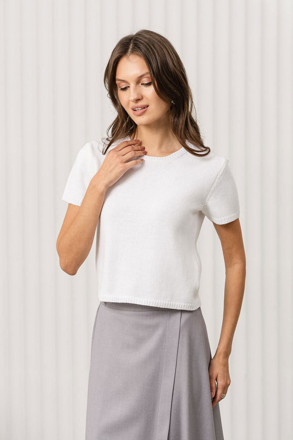 Дизайн: джемпер с короткими рукавами и круглым вырезом горловины. Лаконичный крой и мягкая текстура придают изделию женственность и универсальность;