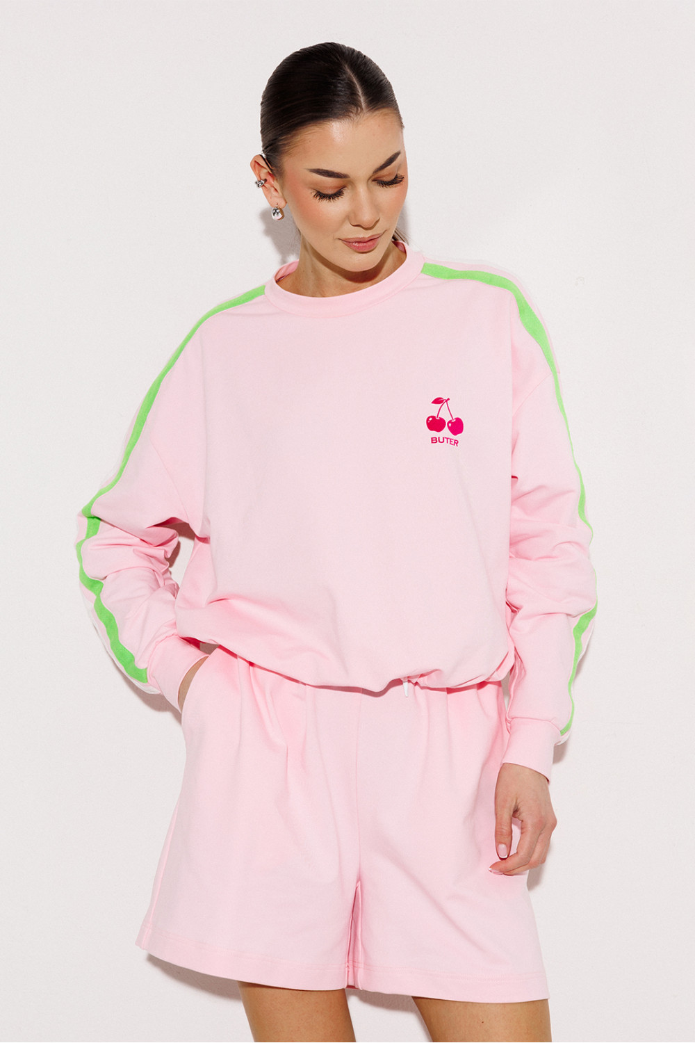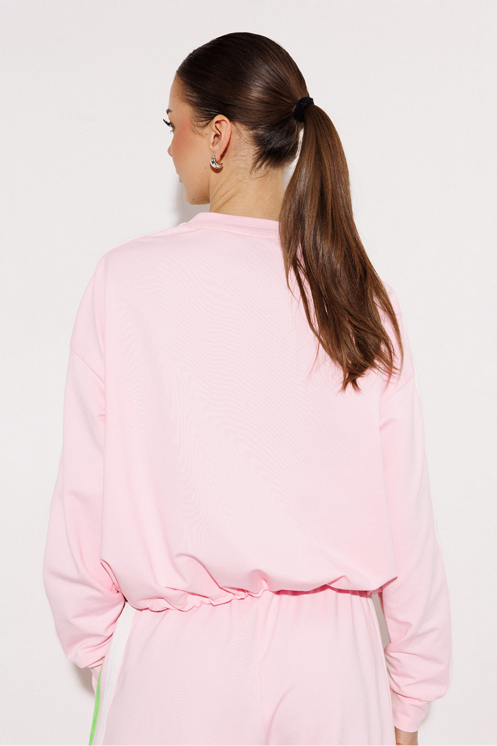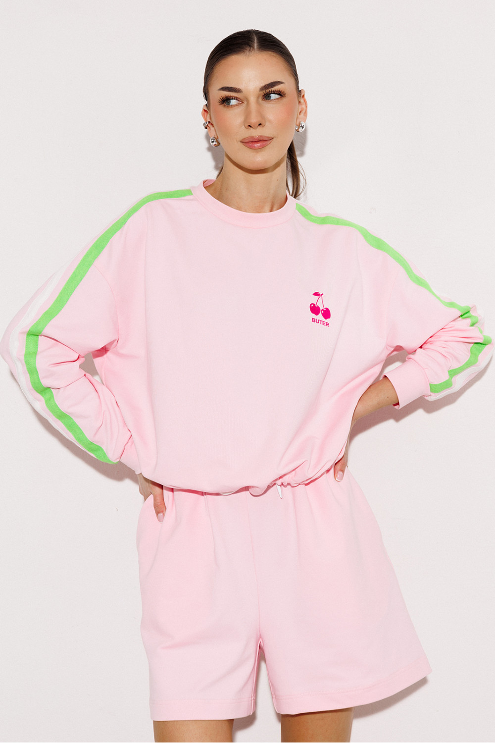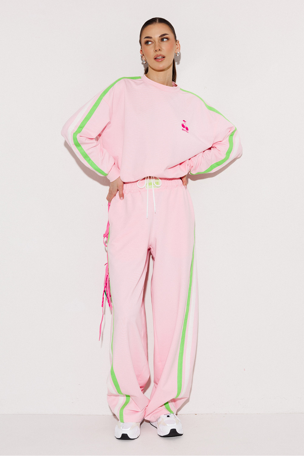 Джемпер трикотажный прямого силуэта с втачным рукавом и спущенной линией плеча, с манжетой по низу рукава. По плечу и рукаву вставка с 2-мя настроченными лампасами. Полочка с печатью "Cherry". По горловине притачная планка. В подгибку низа втянут шнурок благодаря чему изделие можно затянуть.