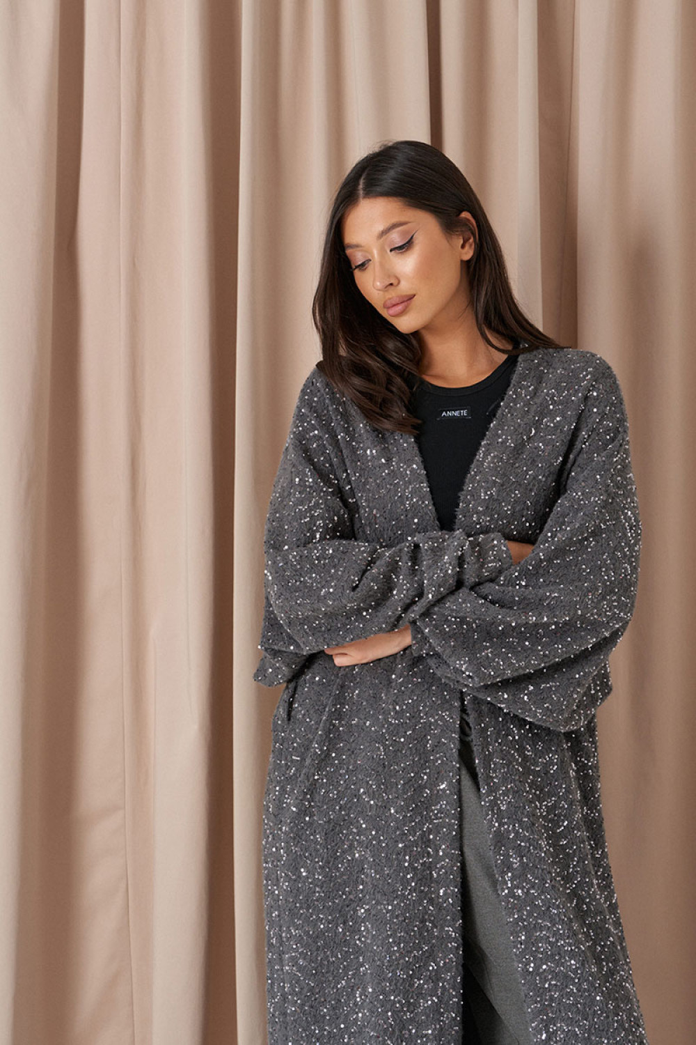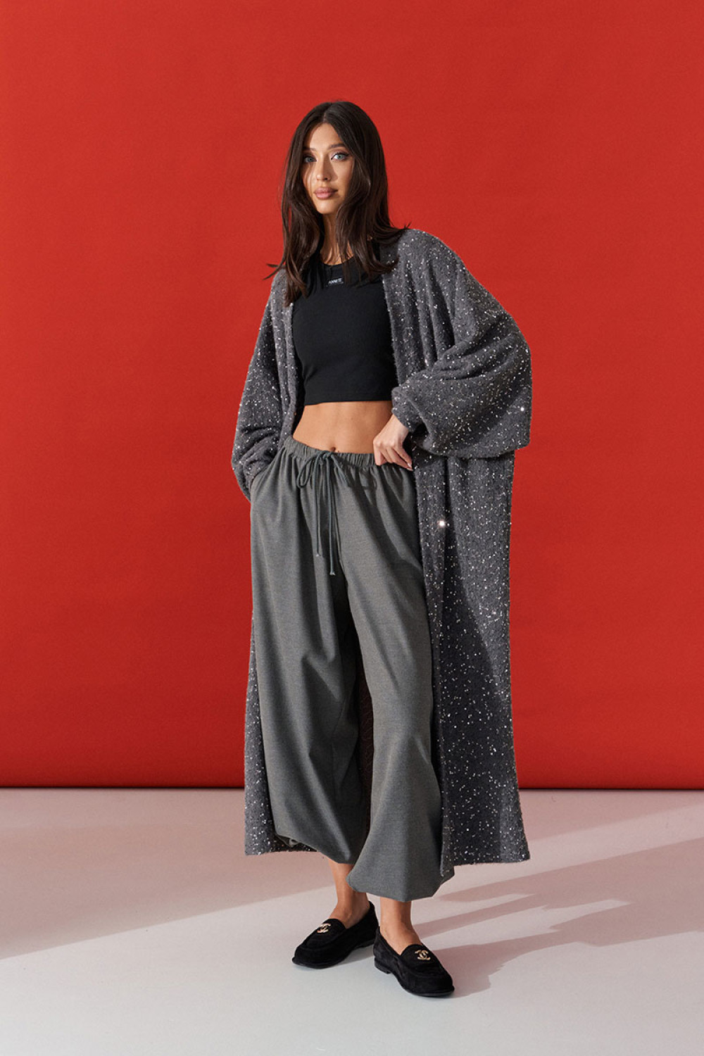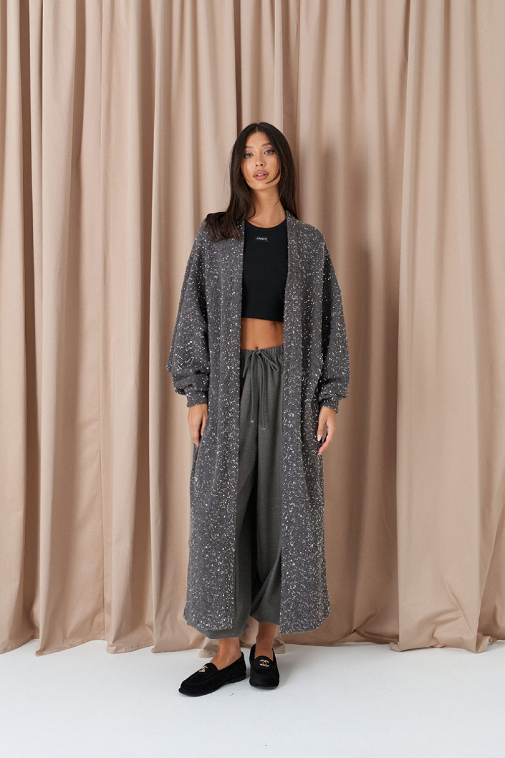 Джемпер удлинённый (кардиган). Выполнен из мягкой пушистой ткани серого цвета с пайетками. Без подкладки. Вырез горловины V-образный. Рукав втачной, спущенный, с манжетой. Застёжки в изделии нет. На уровне линии талии нашиты шлёвки. В комплекте пояс из основной ткани.
