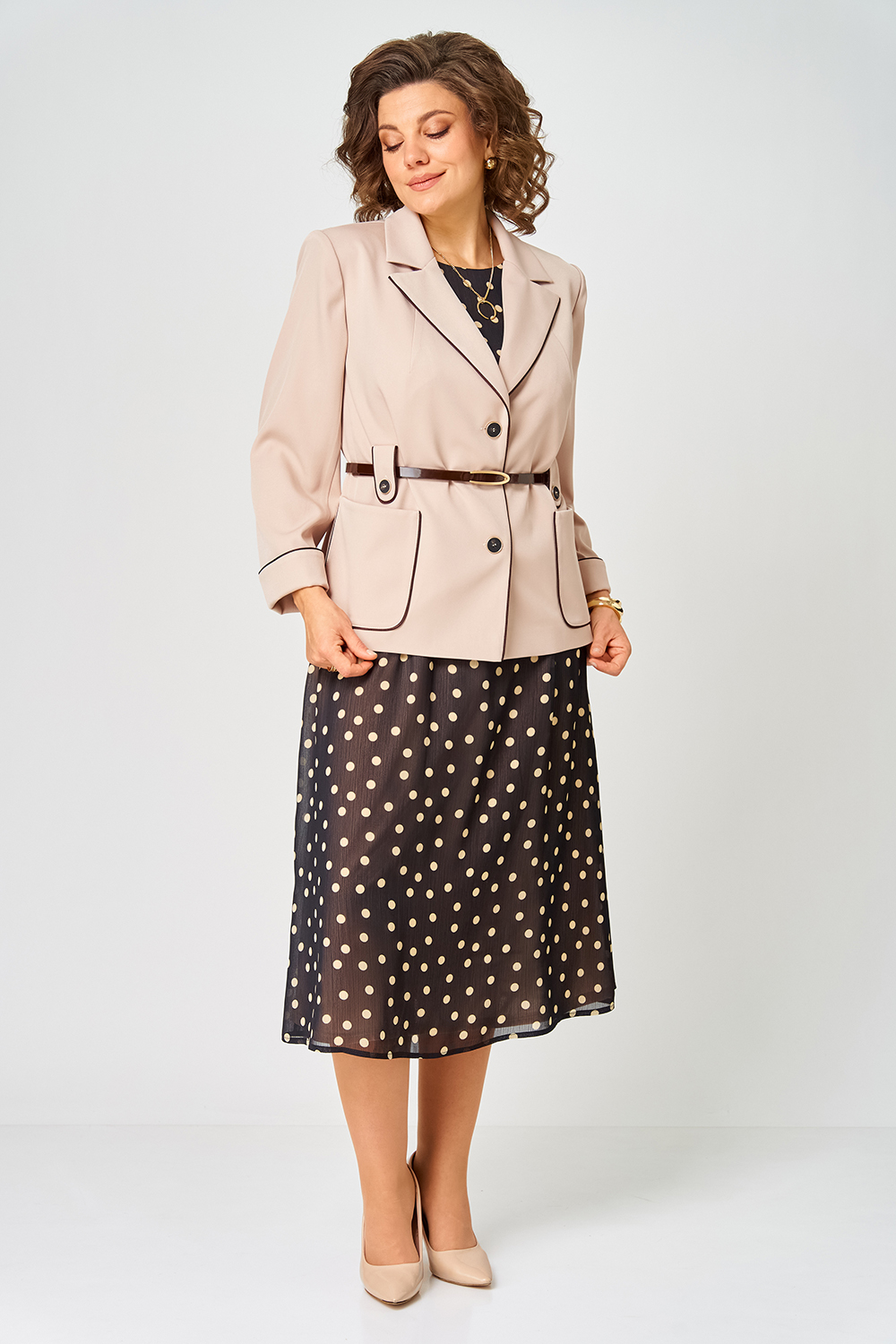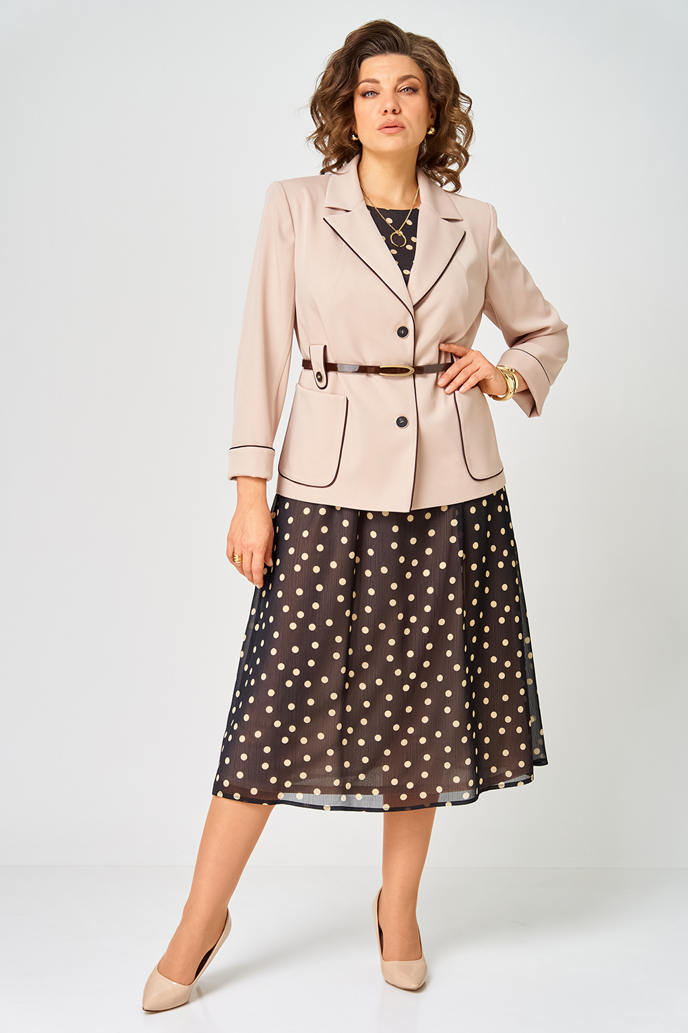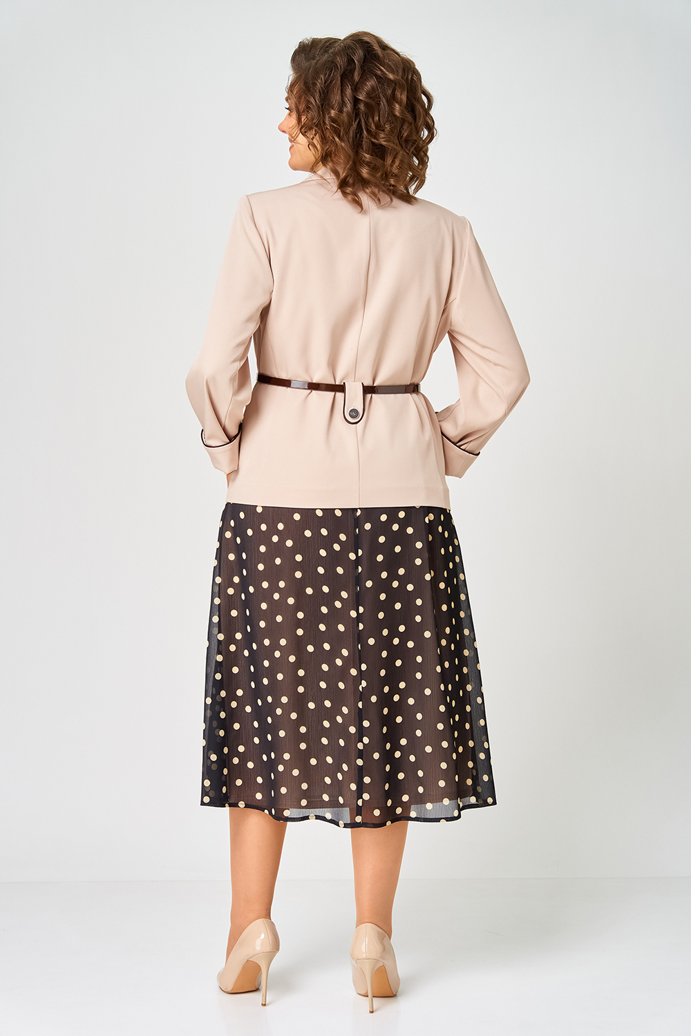 Жакет прямой, частично на подкладке (перед). Воротник пиджачный, частично вставлен кант. Застёжка центральная на 3 петли и пуговицы. По переду 2 накладных кармана, шлёвки, декорированных кантом. Рукав втачной двушовный, с отложной манжетой с кантом. Спинка со средним швом, рельефами. Пояс в комплекте. Платье выполнено из шифона на подкладке. Силуэт платья расширенн к низу.
