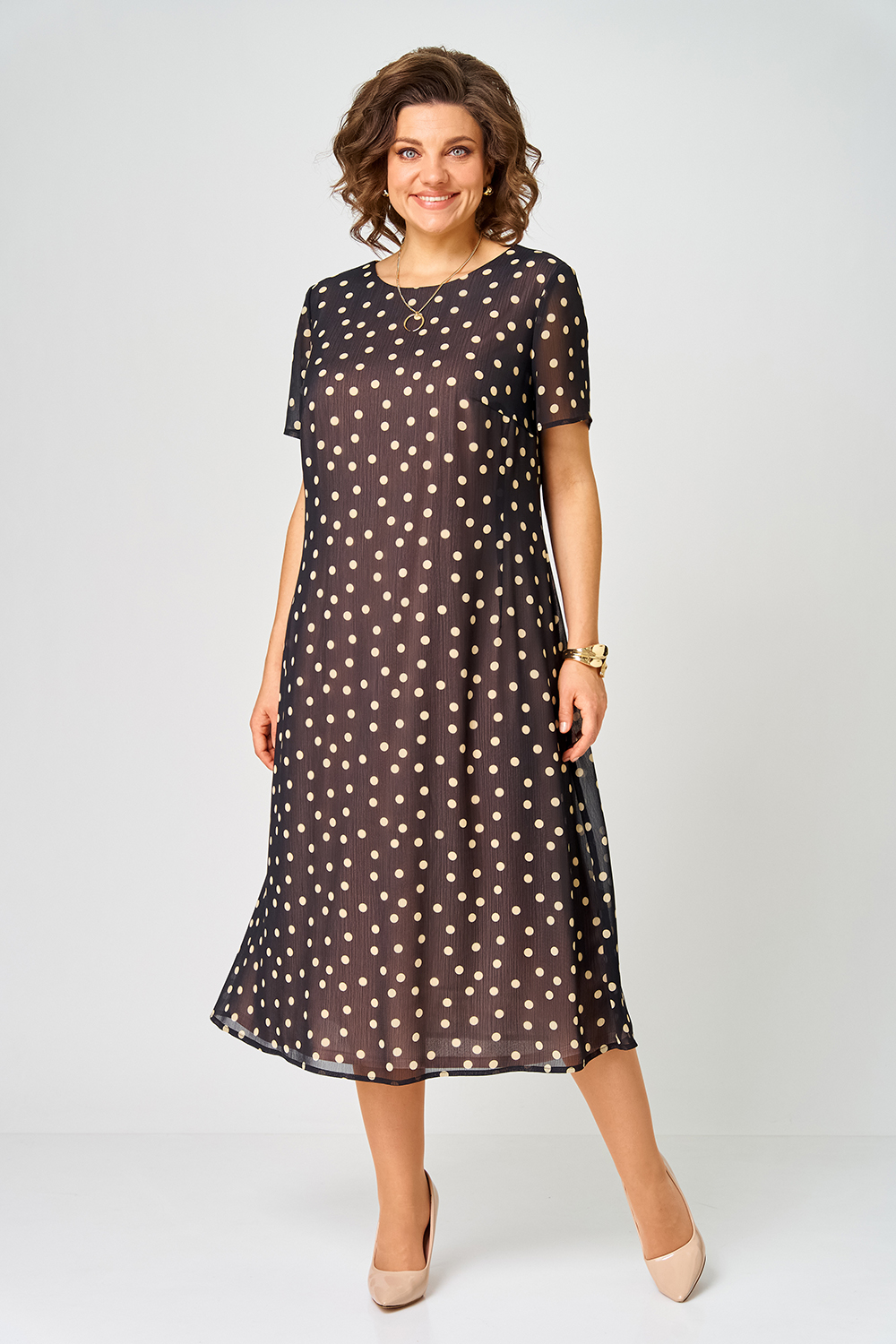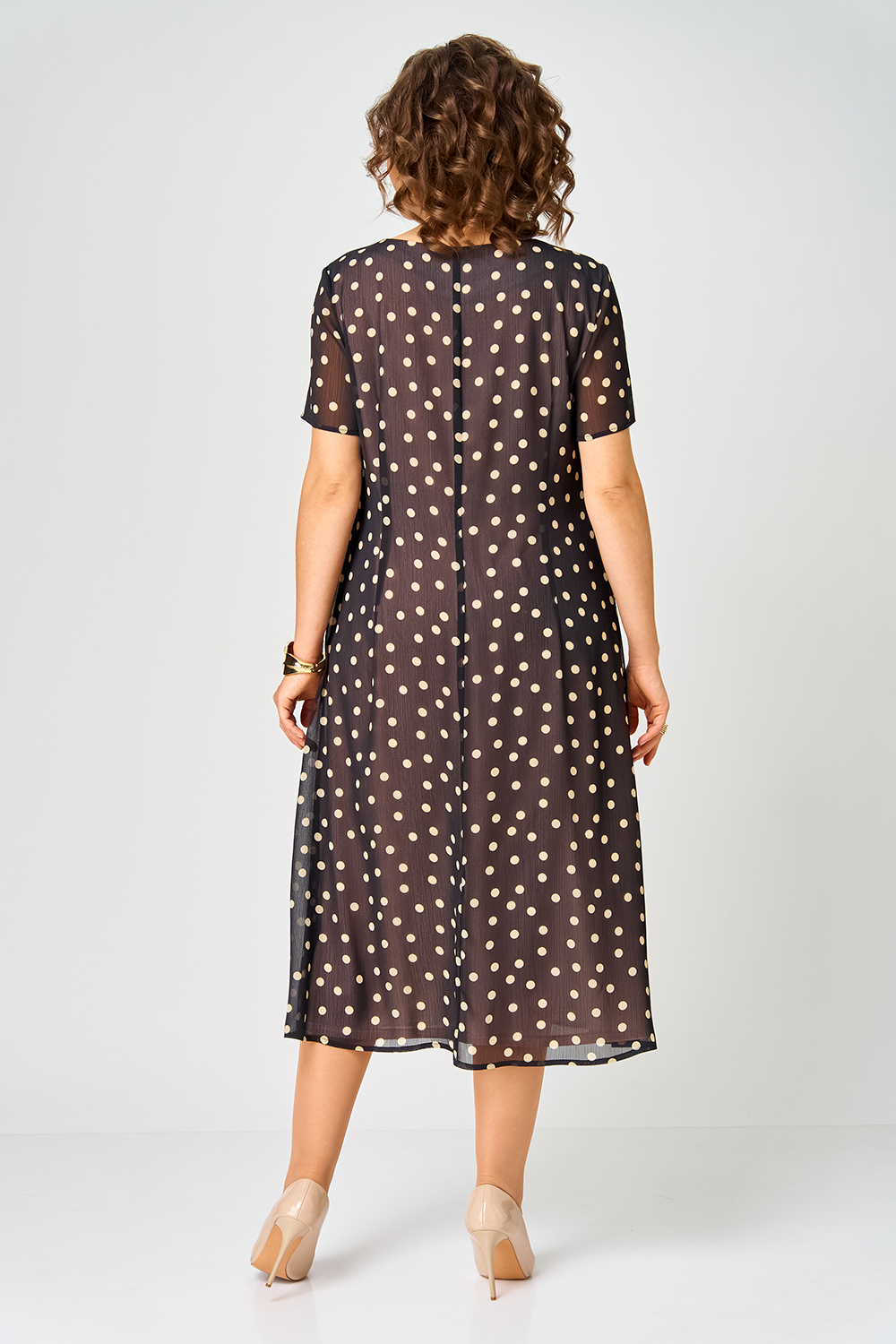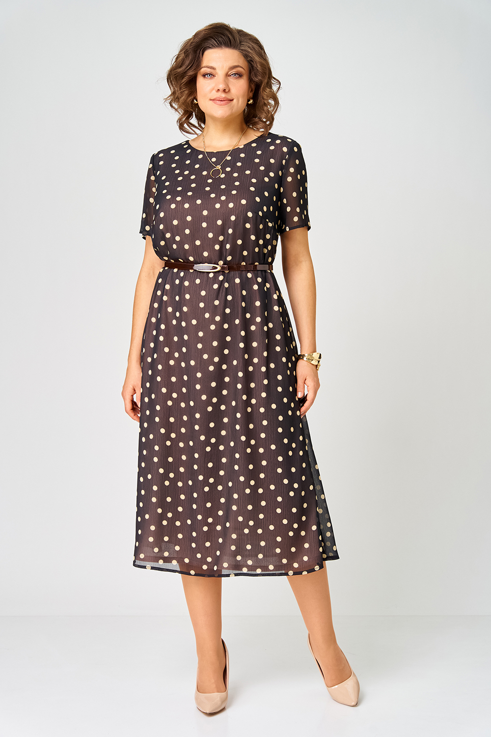 Жакет прямой, частично на подкладке (перед). Воротник пиджачный, частично вставлен кант. Застёжка центральная на 3 петли и пуговицы. По переду 2 накладных кармана, шлёвки, декорированных кантом. Рукав втачной двушовный, с отложной манжетой с кантом. Спинка со средним швом, рельефами. Пояс в комплекте. Платье выполнено из шифона на подкладке. Силуэт платья расширенн к низу.