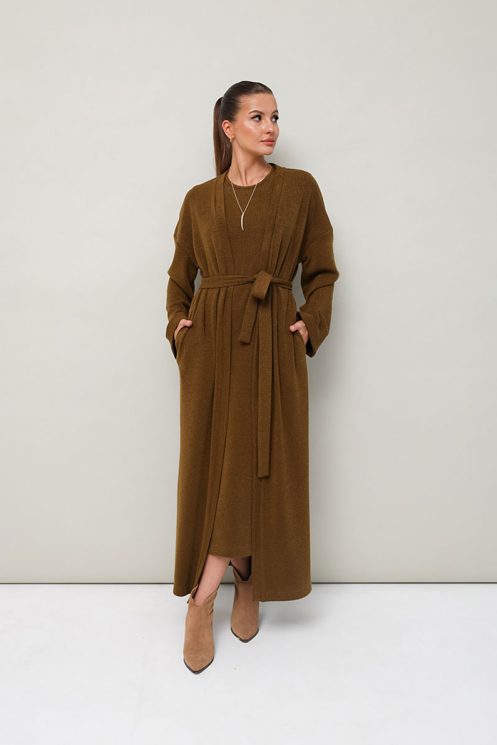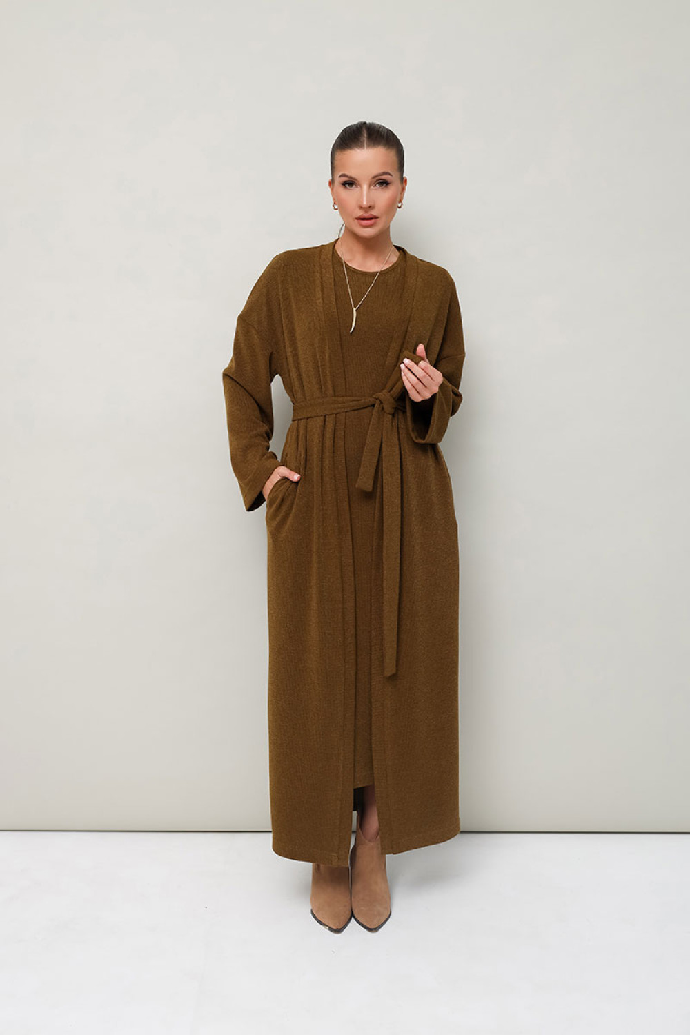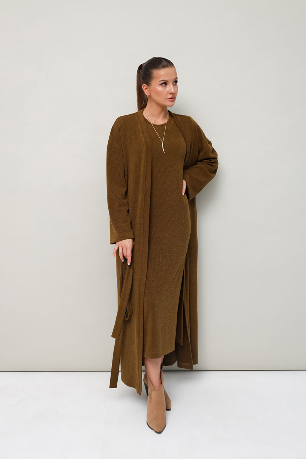 Женский комплект, состоящий из кардигана и платья, выполнен из мягкого уютного трикотажного полотна.
