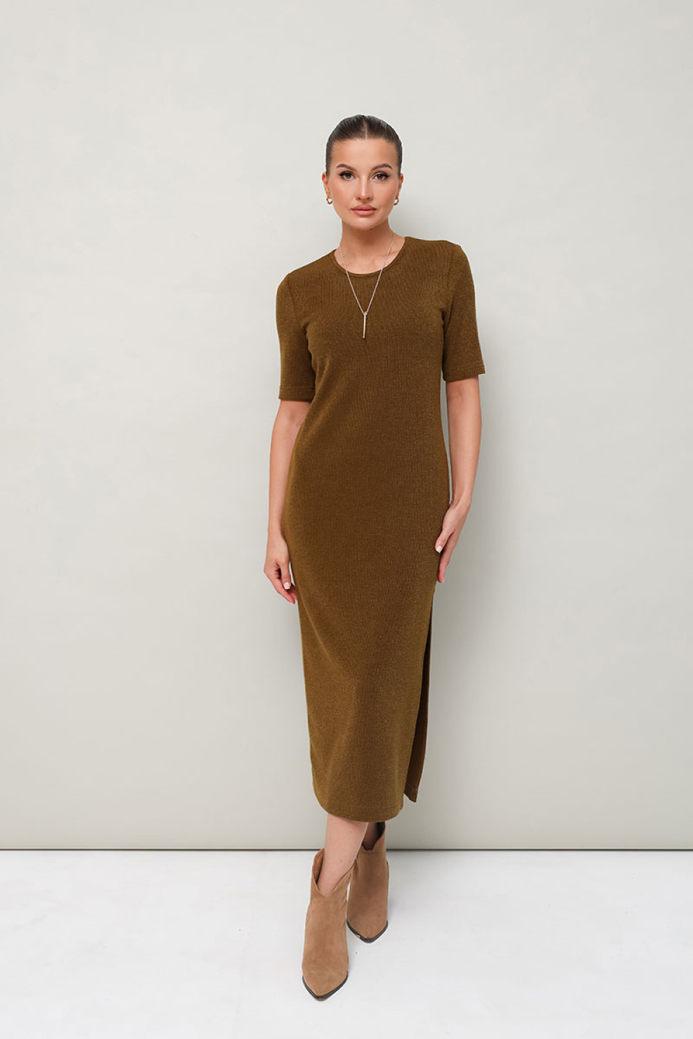 Трикотажное платье полуприлегающего силуэта в длине миди. Округлый вырез горловины. Рукава втачные в длине до локтя. В левом боковом шве обработан высокий разрез.