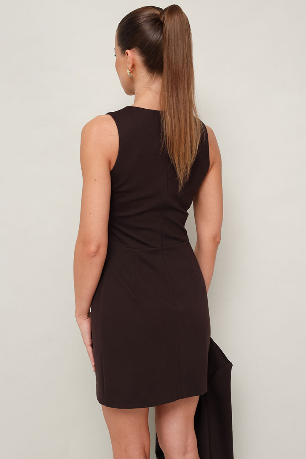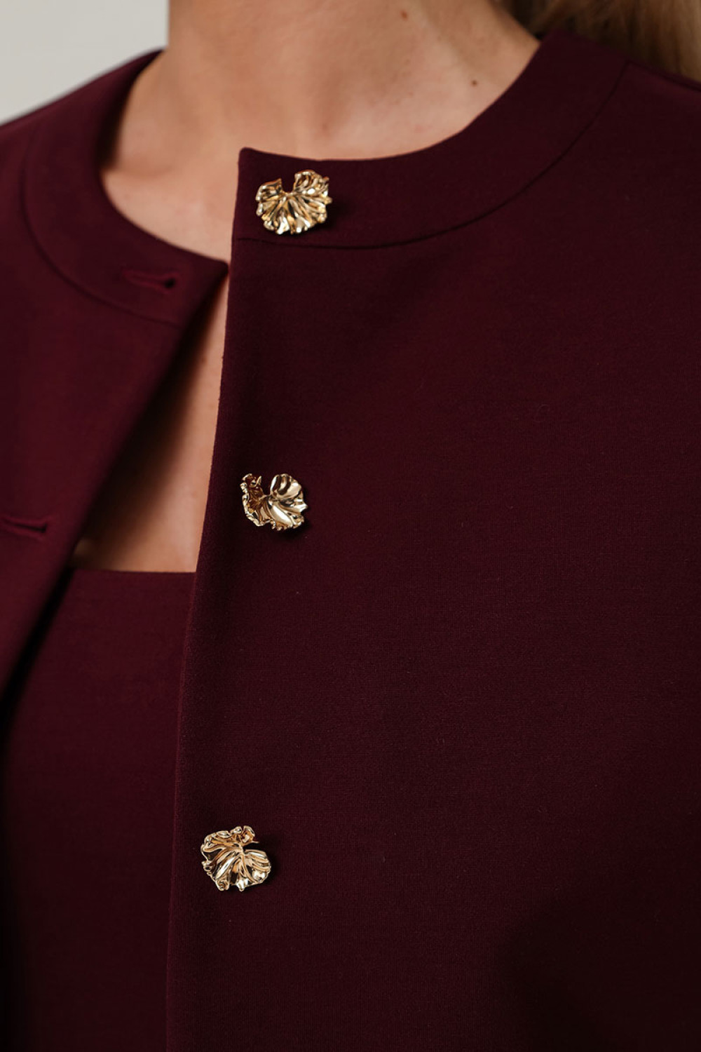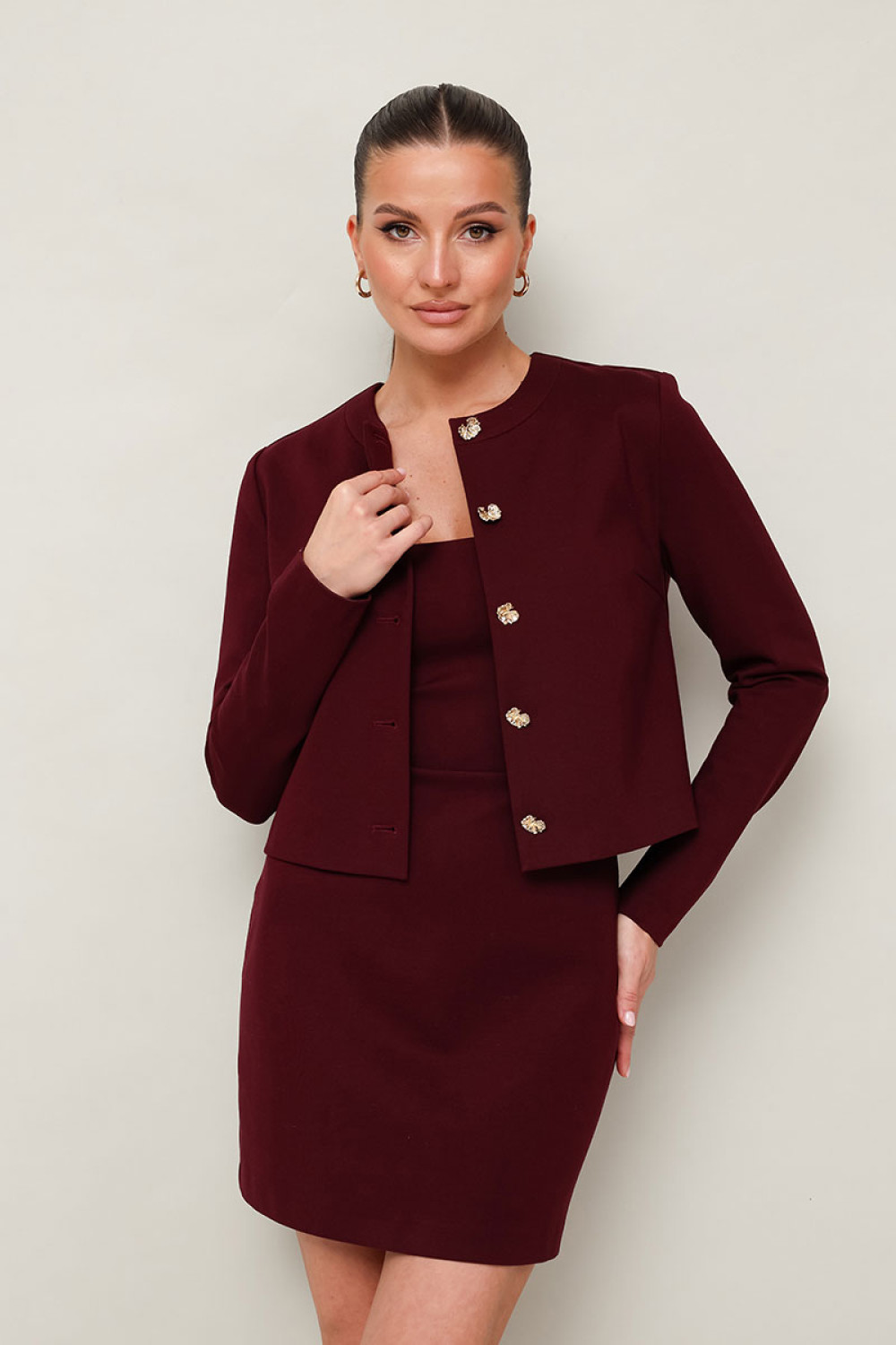 Стильный 2-предметный комплект, состоящий из платья и жакета, выполненный из трикотажа нейлона. Платье прилегающего силуэта, отрезное по линии талии в длине мини. Горловина оформлена вырезом каре. Застёжка в среднем шве по спинке на потайную молнию. Жакет полуприлегающего силуэта, с центральной застёжкой на петли и акцентные пуговицы. Длинные втачные рукава. Спинка со средним швом.