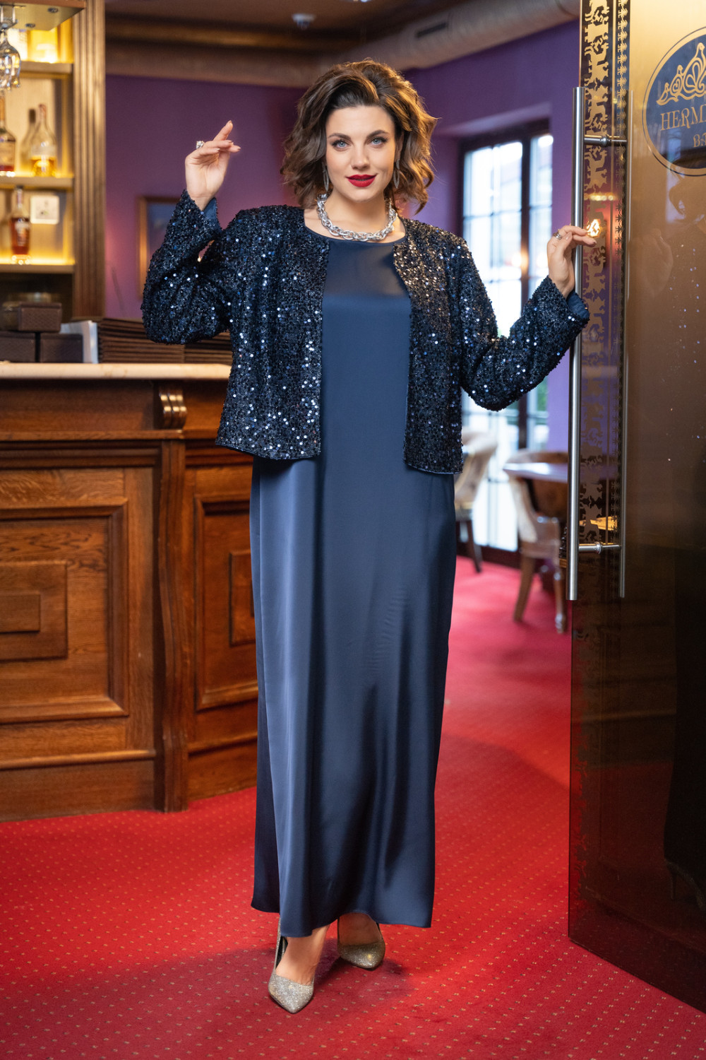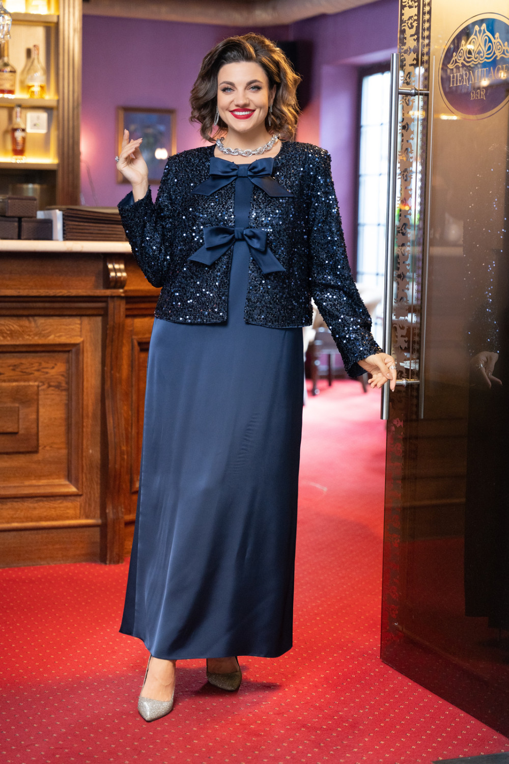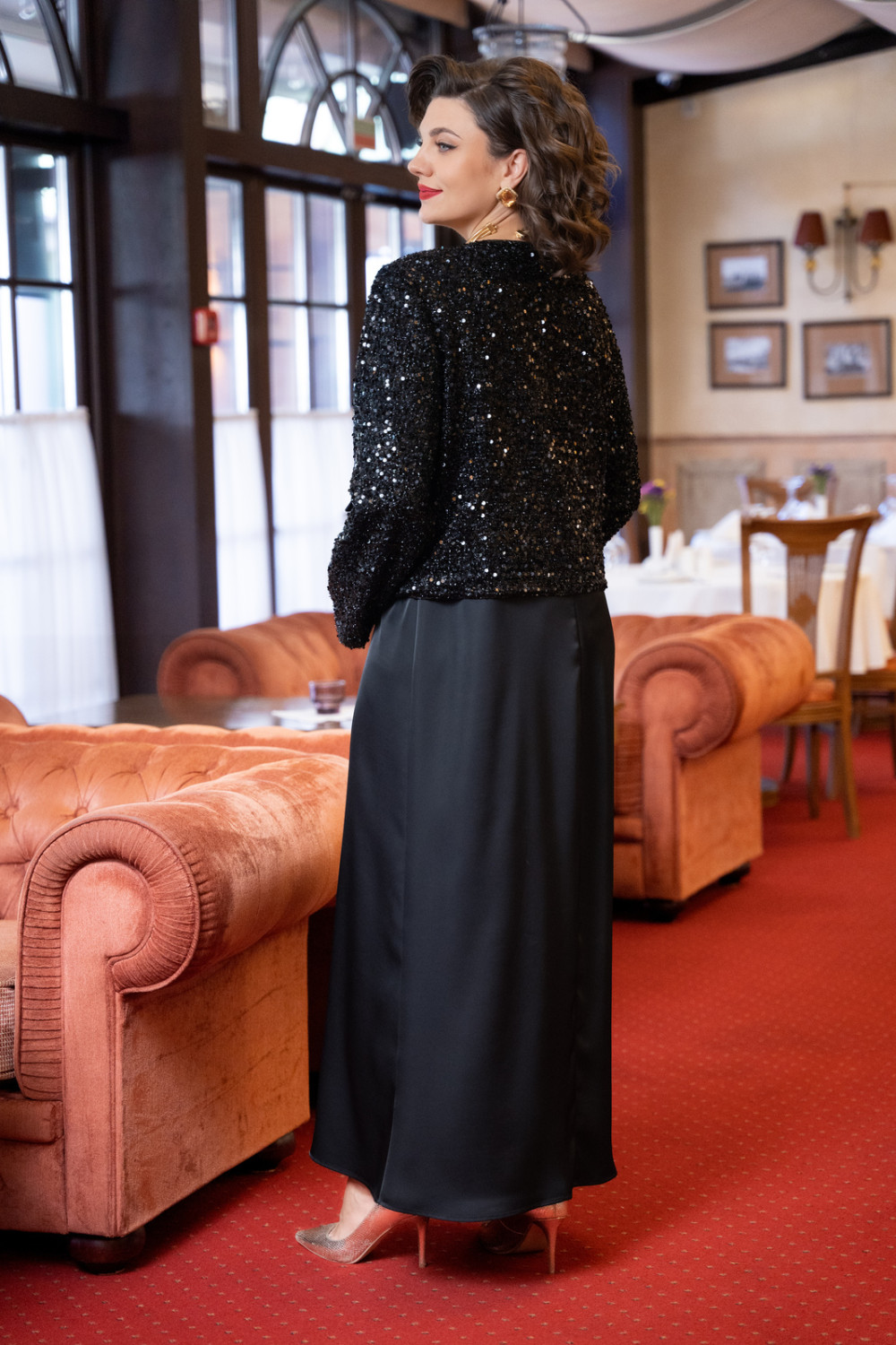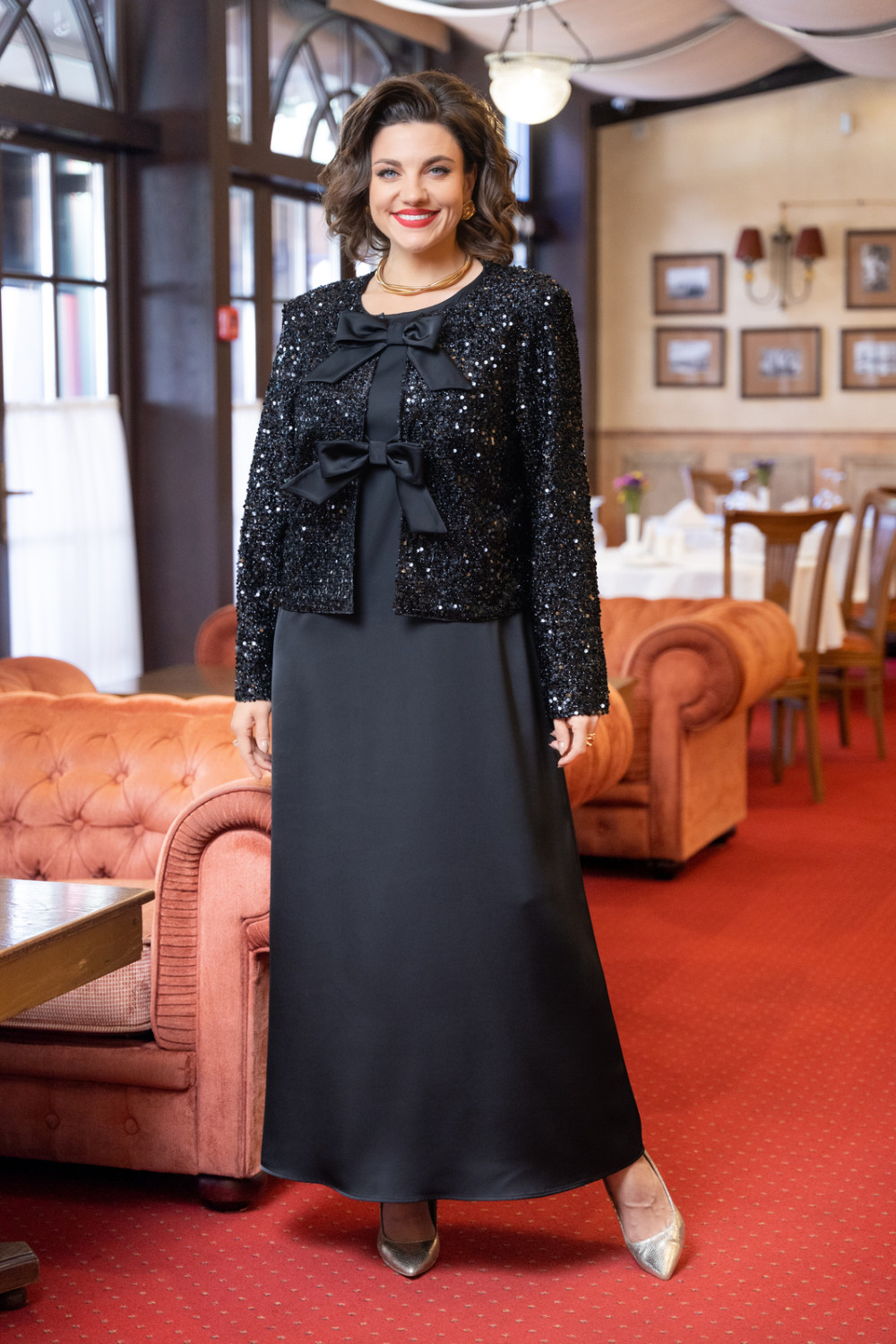 Комплект женский состоит из укороченного жакета из полотна с пайетками и атласного платья. Жакет прямого силуэта свободного покроя с естественной линией плеча на подкладке из атласной ткани. Горловина округлой формы. БАНТЫ СЪЁМНЫЕ! Застежка на съемные декоративные авторские банты с применением потайного крепления на небольшие кнопки, для возможности создания различных образов, как с бантами, так и без них. Платье женское свободного покроя расширенное к низу. Горловина округлой формы. Спинка со средним швом и застежкой на тесьму-молнию. Рукав цельнокроеный типа "летучая мышь".
