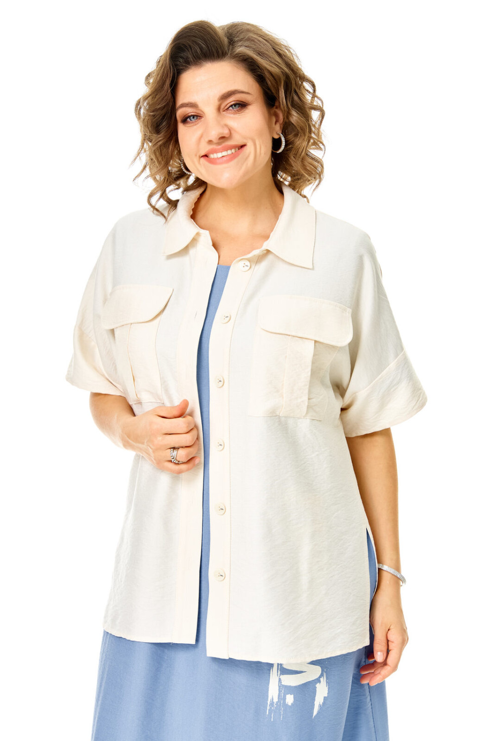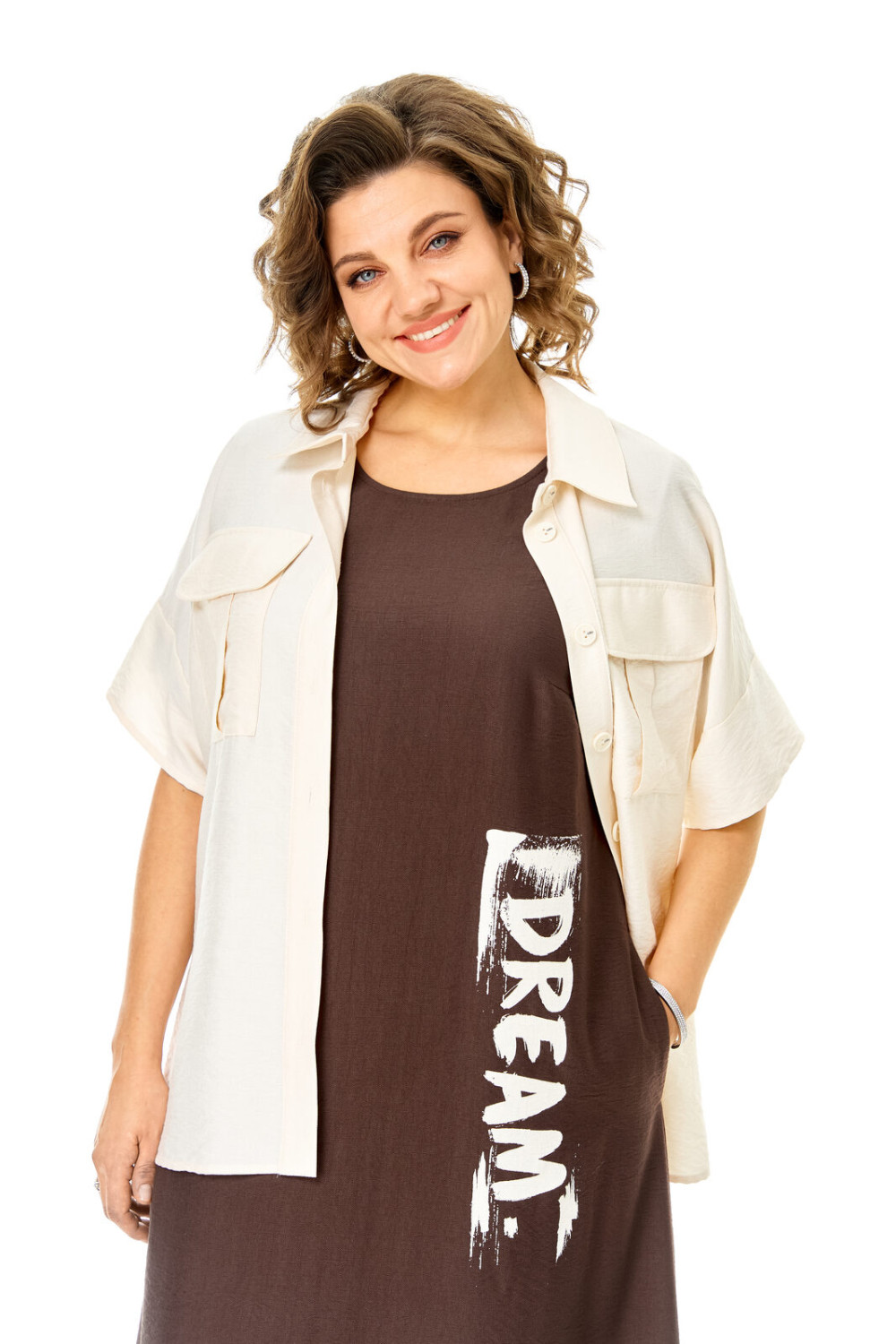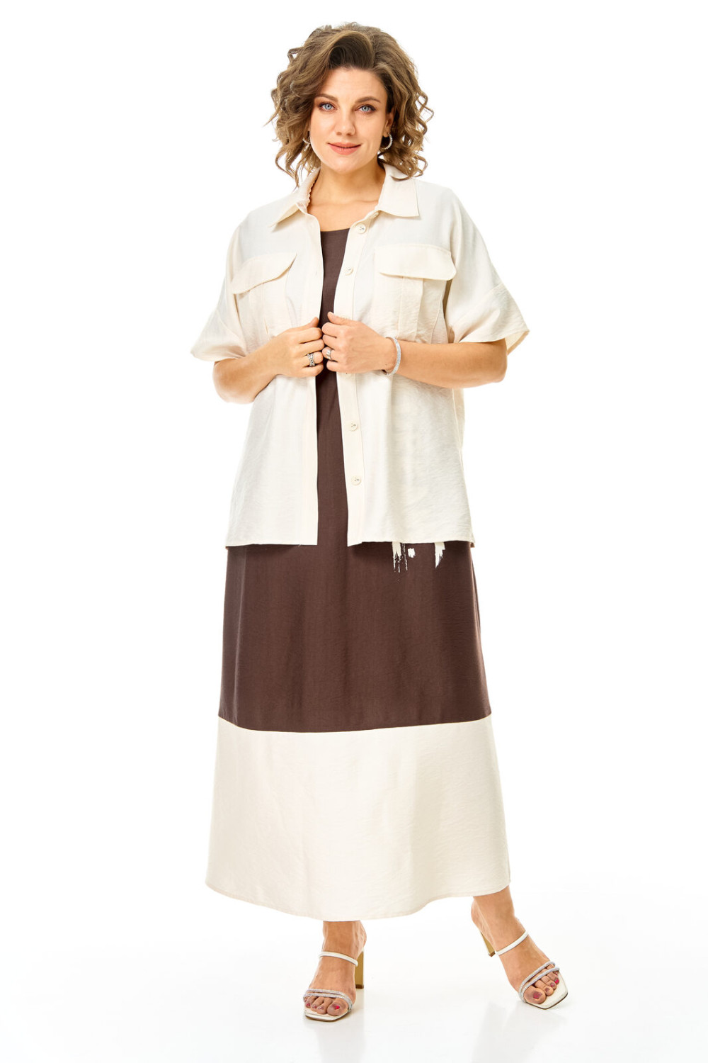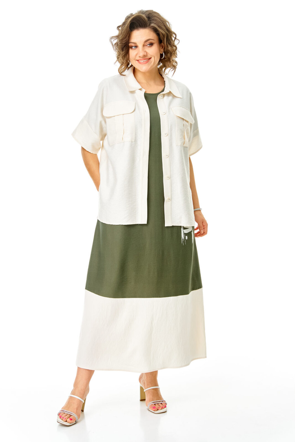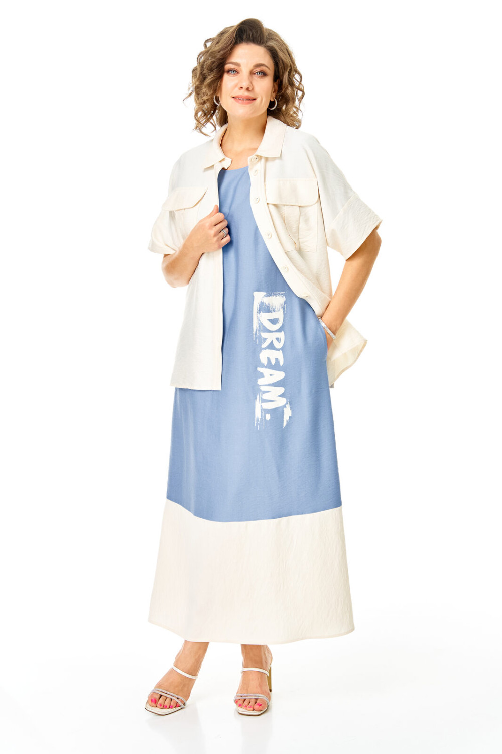 Комплект женский состоит из блузы и платья. Блуза прямого свободного покроя со спущенной линией плеча.По переду обработана планка. Застежка центральная бортовая на петли-пуговицы.Воротник блузочный отложной. Рукав короткий до линии локтя.По переду имеются накладные карманы с бантовыми складками и клапанами. В боковых швах обработаны разрезы.Платье женское А-образного силуэта с естественной линией плеча. Горловина округлой формы. В среднем шве спинки застежка на тесьму-молнию. Перед и спинка с отрезной нижней частью контрастного цвета. В боковых швах обработаны карманы. Рукав короткий одношовный. По переду нанесен авторский принт в цвет нижней части платья.
