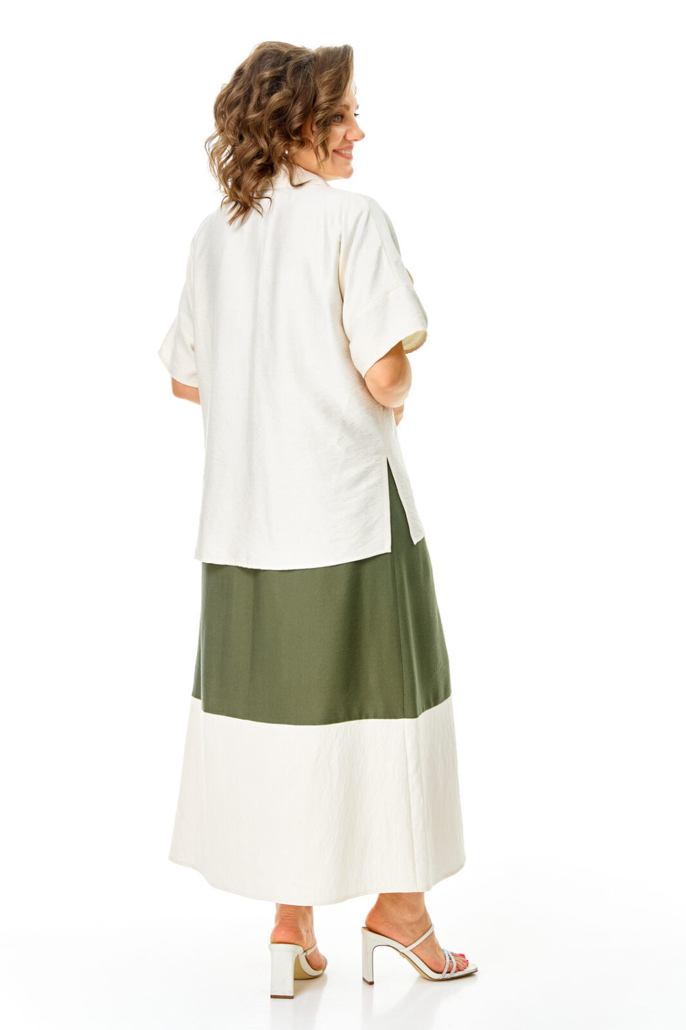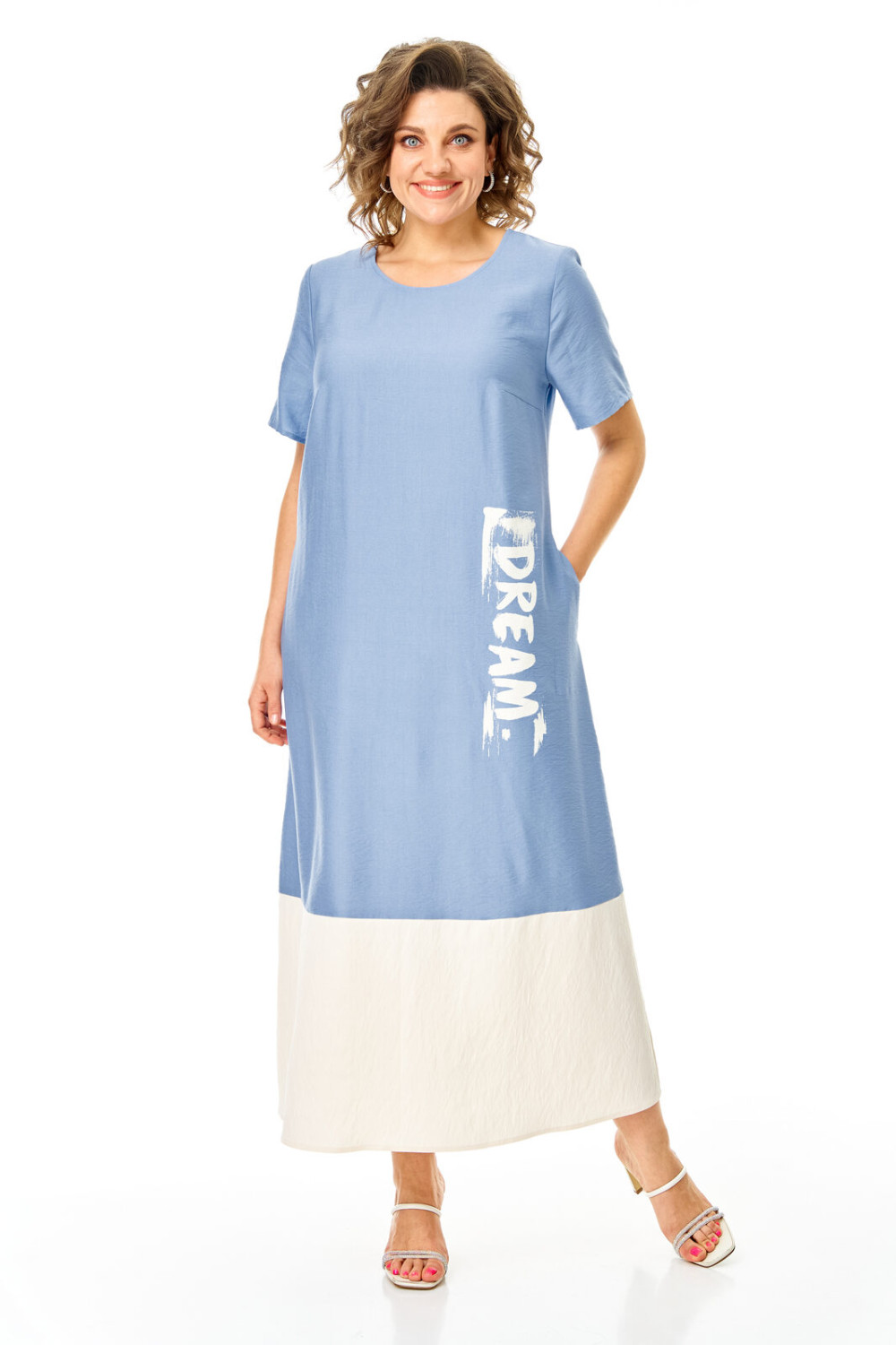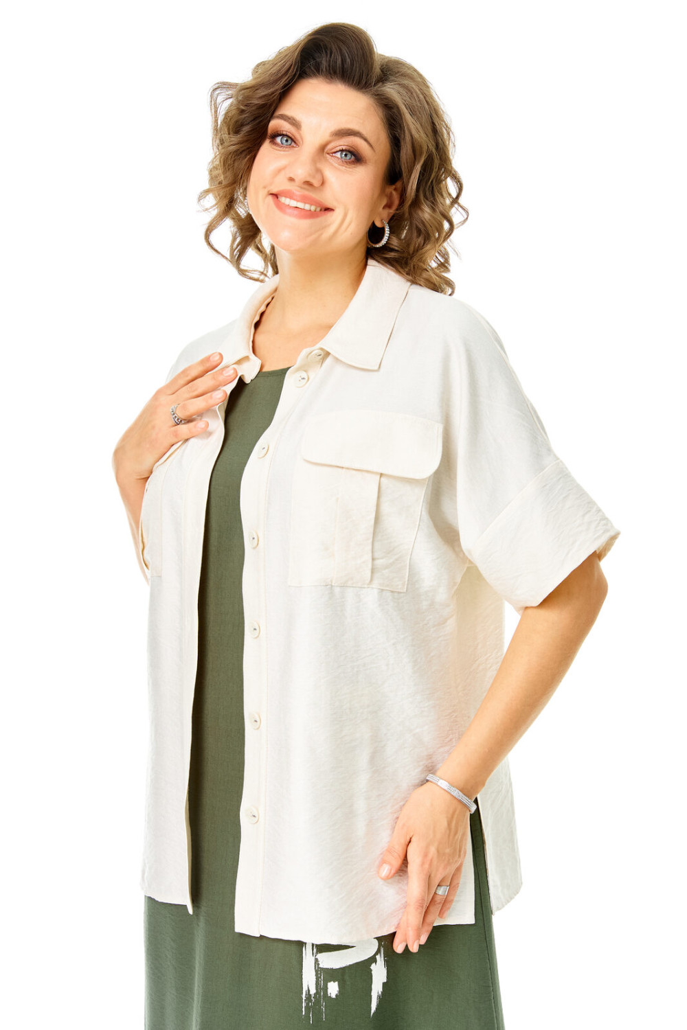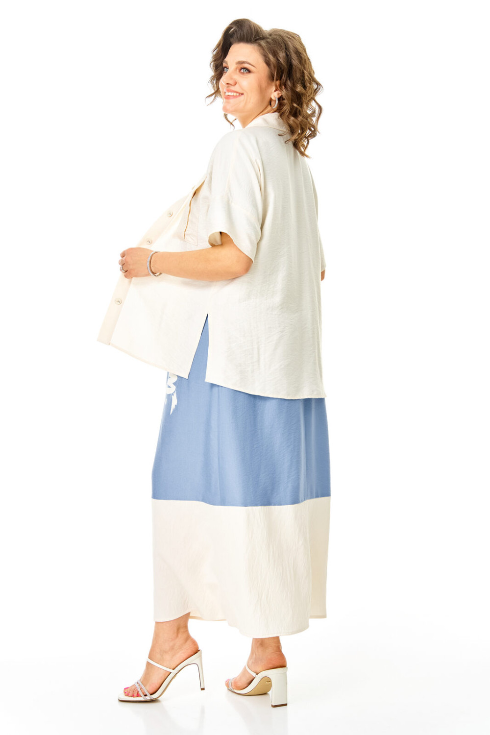Комплект женский состоит из блузы и платья. Блуза прямого свободного покроя со спущенной линией плеча.По переду обработана планка. Застежка центральная бортовая на петли-пуговицы.Воротник блузочный отложной. Рукав короткий до линии локтя.По переду имеются накладные карманы с бантовыми складками и клапанами. В боковых швах обработаны разрезы.Платье женское А-образного силуэта с естественной линией плеча. Горловина округлой формы. В среднем шве спинки застежка на тесьму-молнию. Перед и спинка с отрезной нижней частью контрастного цвета. В боковых швах обработаны карманы. Рукав короткий одношовный. По переду нанесен авторский принт в цвет нижней части платья.