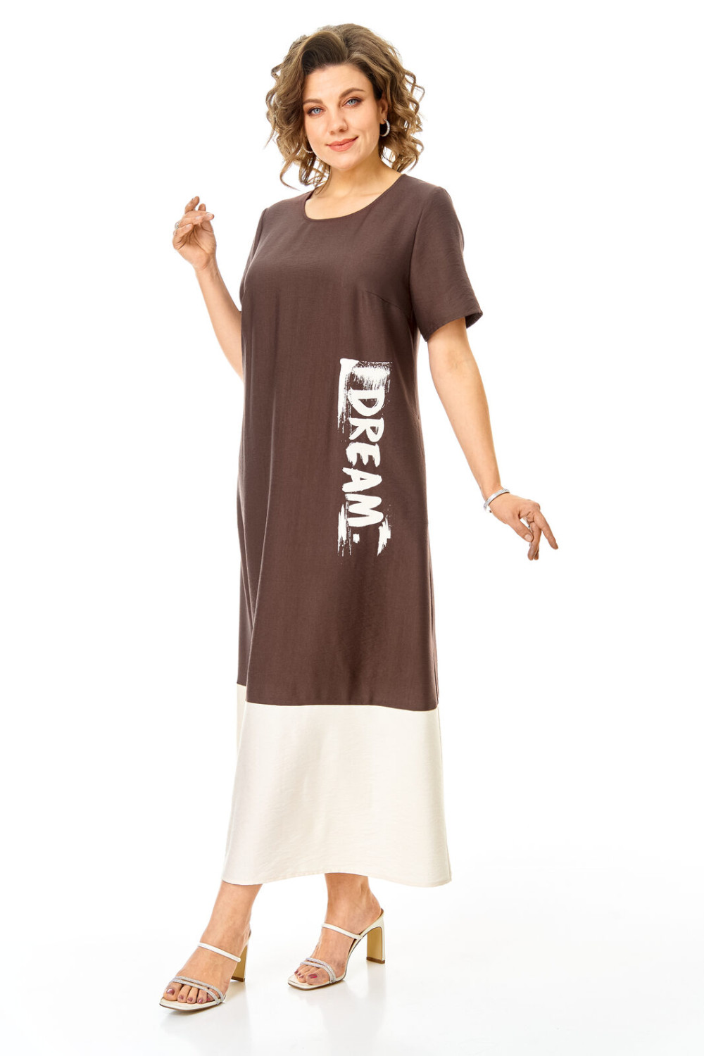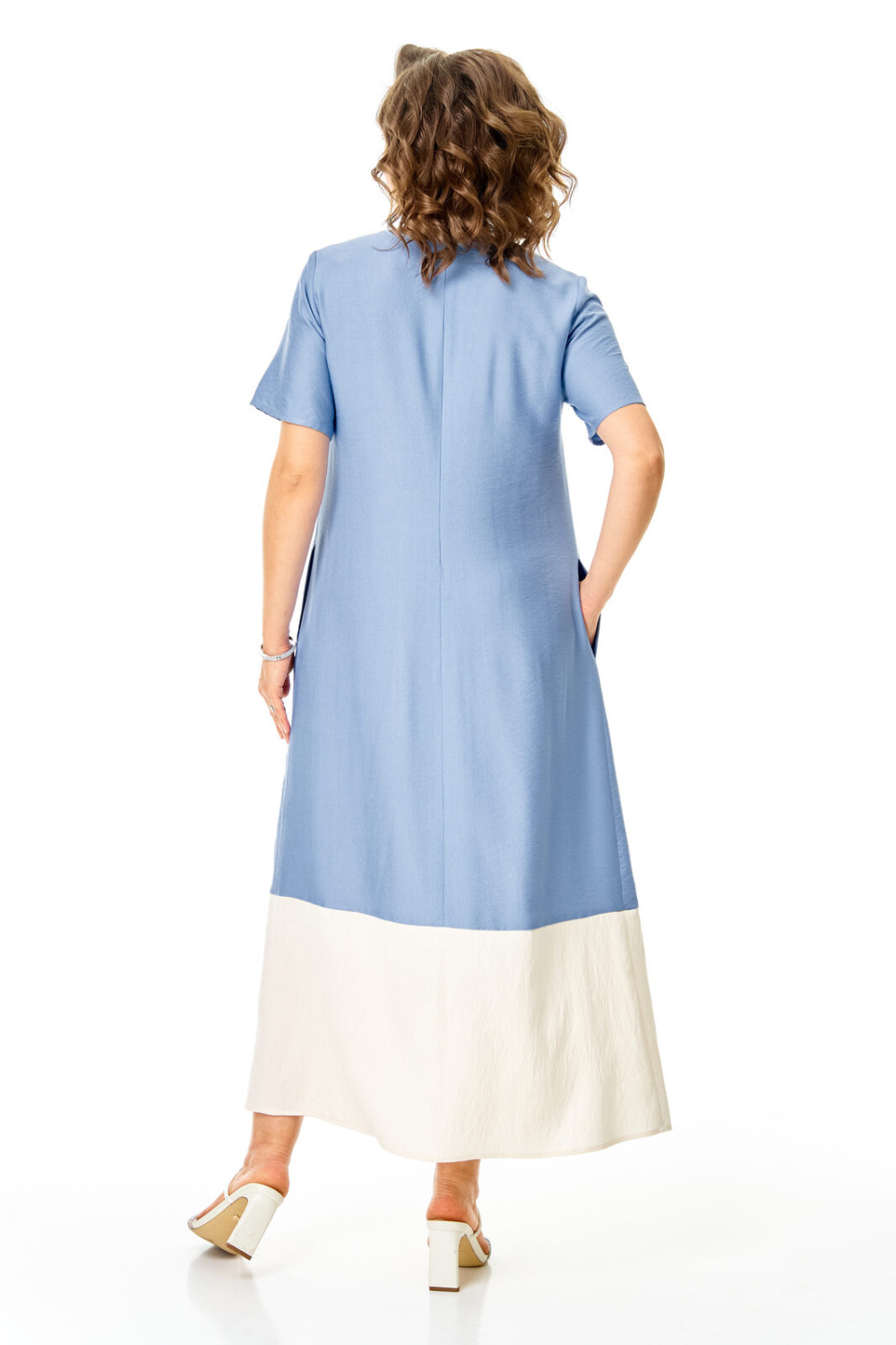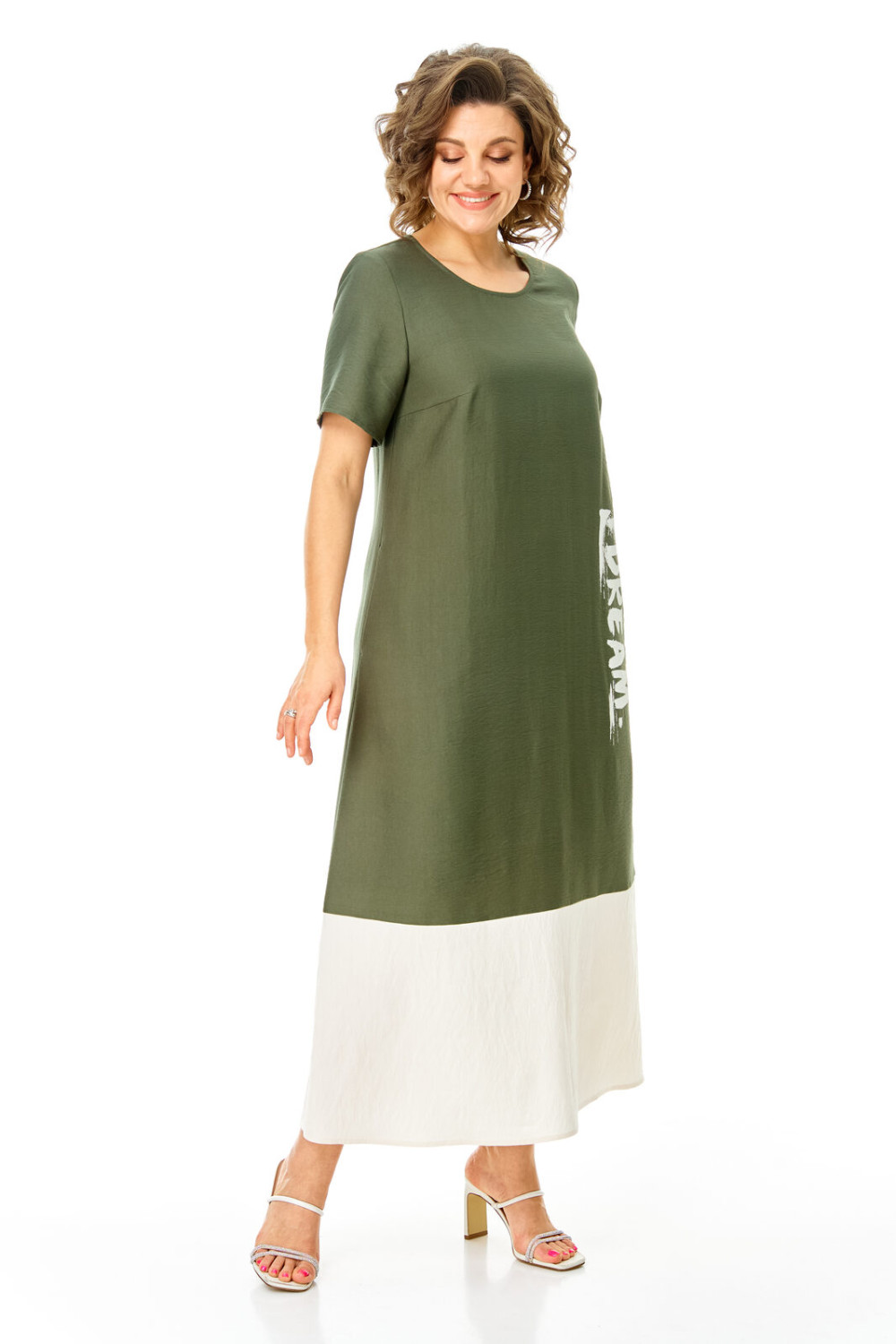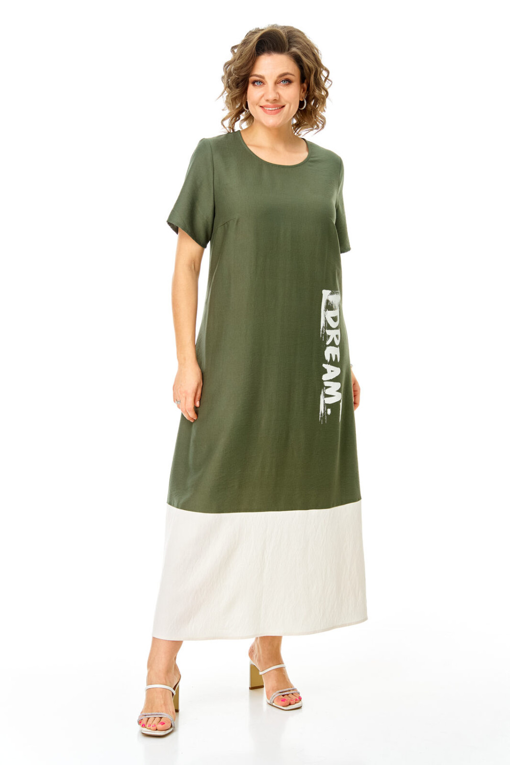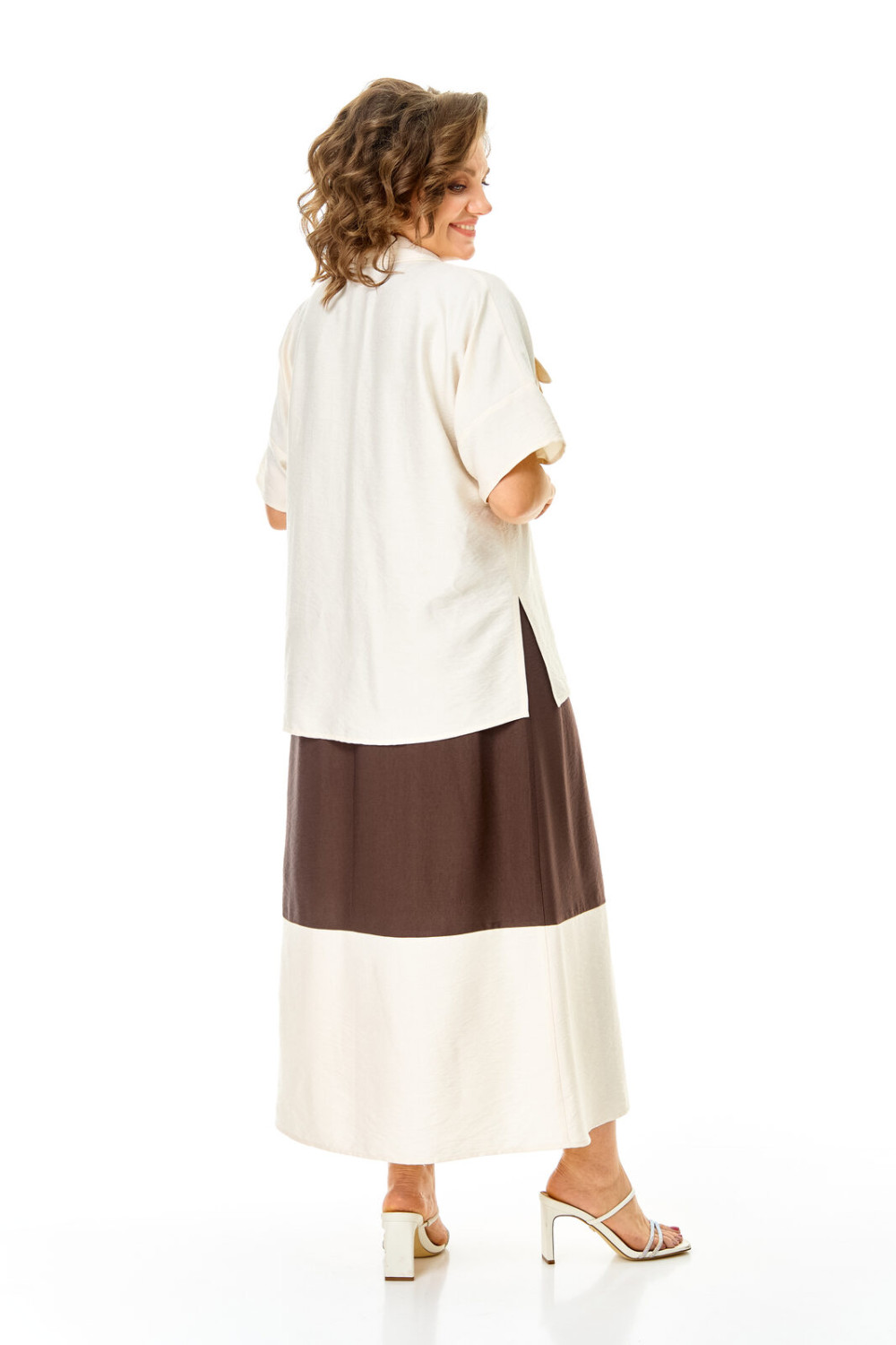 Комплект женский состоит из блузы и платья. Блуза прямого свободного покроя со спущенной линией плеча.По переду обработана планка. Застежка центральная бортовая на петли-пуговицы.Воротник блузочный отложной. Рукав короткий до линии локтя.По переду имеются накладные карманы с бантовыми складками и клапанами. В боковых швах обработаны разрезы.Платье женское А-образного силуэта с естественной линией плеча. Горловина округлой формы. В среднем шве спинки застежка на тесьму-молнию. Перед и спинка с отрезной нижней частью контрастного цвета. В боковых швах обработаны карманы. Рукав короткий одношовный. По переду нанесен авторский принт в цвет нижней части платья.
