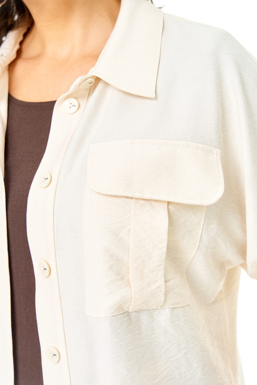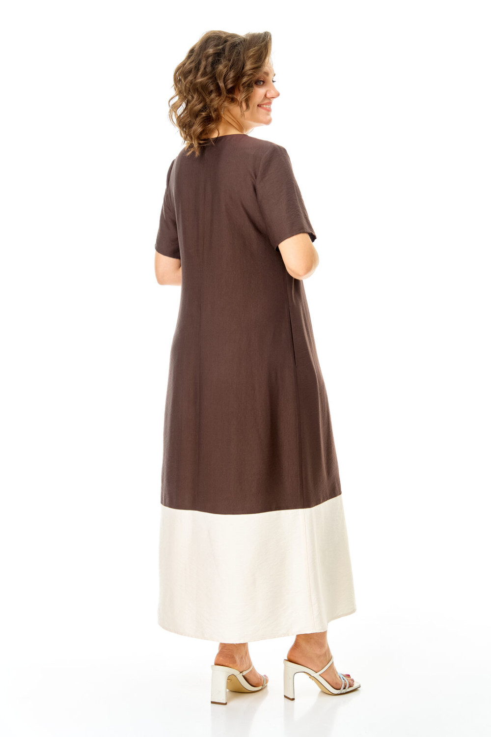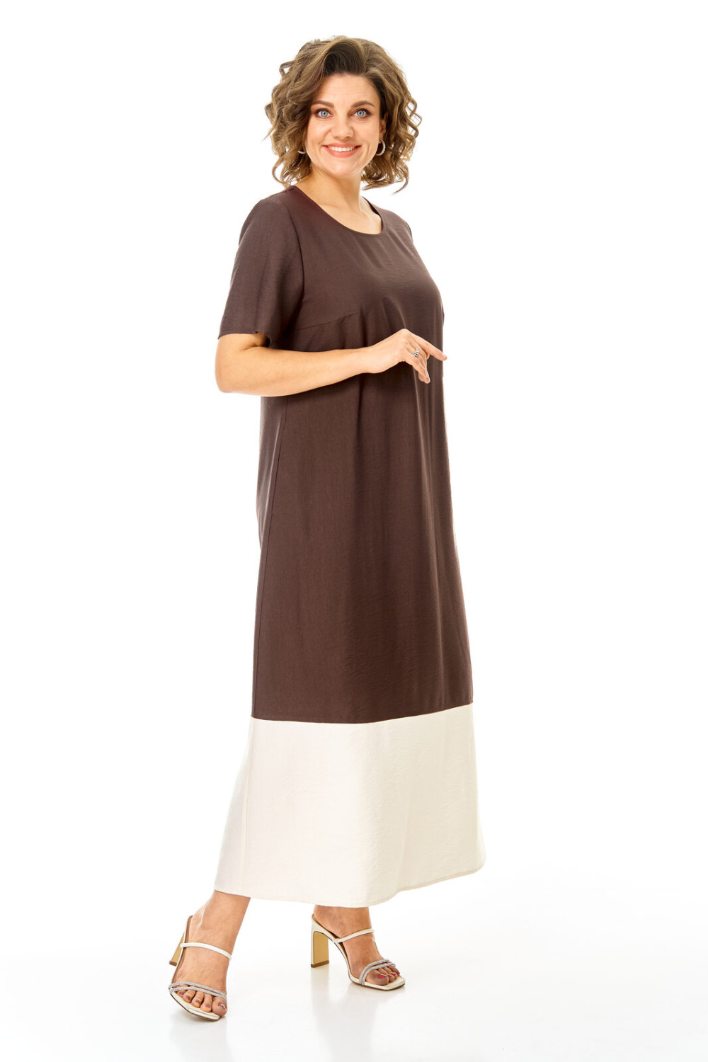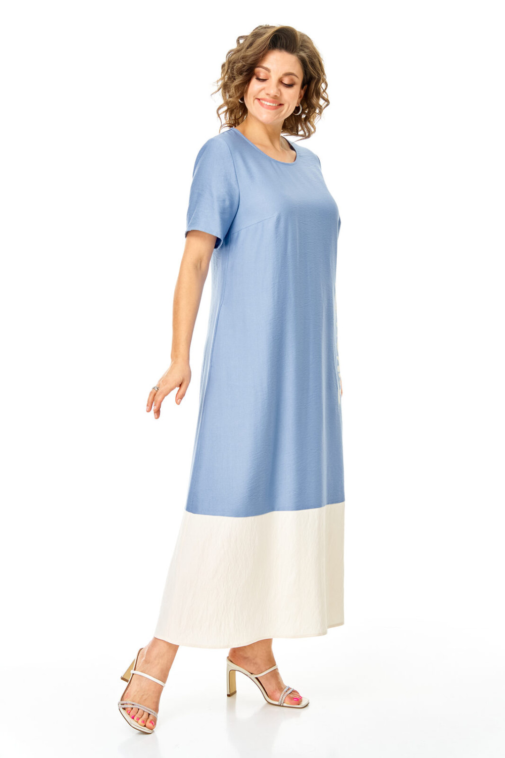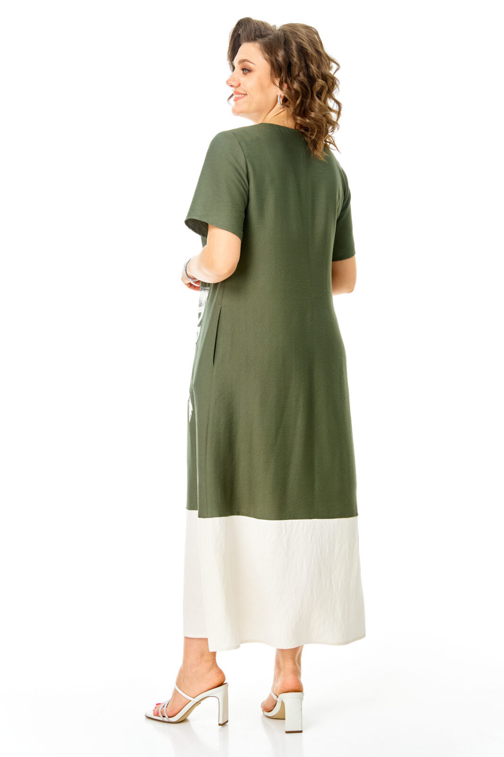 Комплект женский состоит из блузы и платья. Блуза прямого свободного покроя со спущенной линией плеча.По переду обработана планка. Застежка центральная бортовая на петли-пуговицы.Воротник блузочный отложной. Рукав короткий до линии локтя.По переду имеются накладные карманы с бантовыми складками и клапанами. В боковых швах обработаны разрезы.Платье женское А-образного силуэта с естественной линией плеча. Горловина округлой формы. В среднем шве спинки застежка на тесьму-молнию. Перед и спинка с отрезной нижней частью контрастного цвета. В боковых швах обработаны карманы. Рукав короткий одношовный. По переду нанесен авторский принт в цвет нижней части платья.