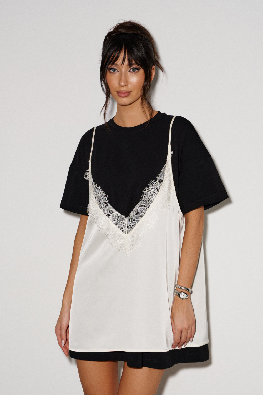 Комплект из двух платьев. Основное платье выполнено из трикотажного полотна чёрного цвета. Вырез горловины круглый. Рукав втачной, спущенный. Верхнее платье свободного кроя, выполнено из струящегося полотна цвета айвори. Платье декорировано кружевом по верху и низу изделия. Вырез декольте V-образный. Бретели регулируемые.