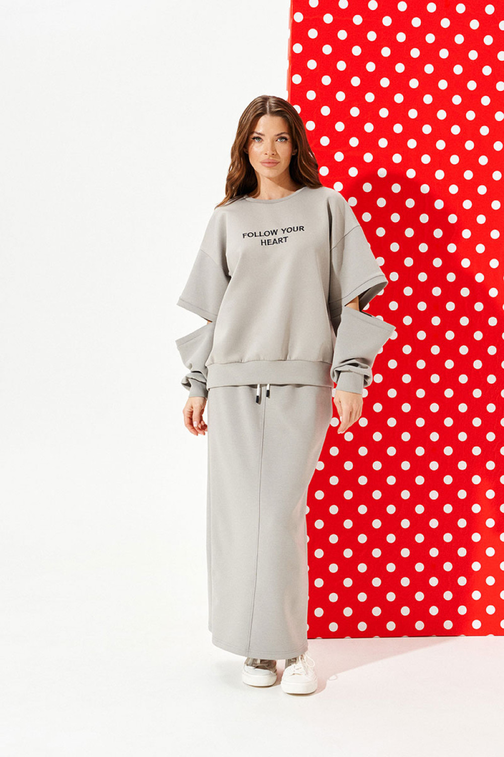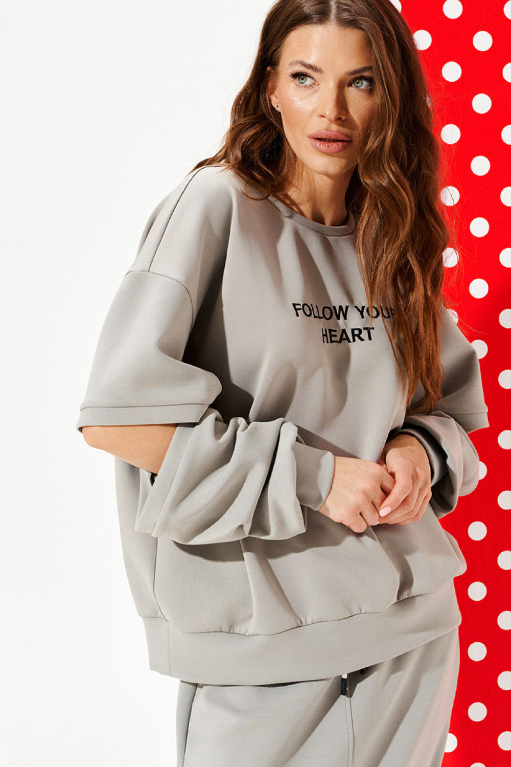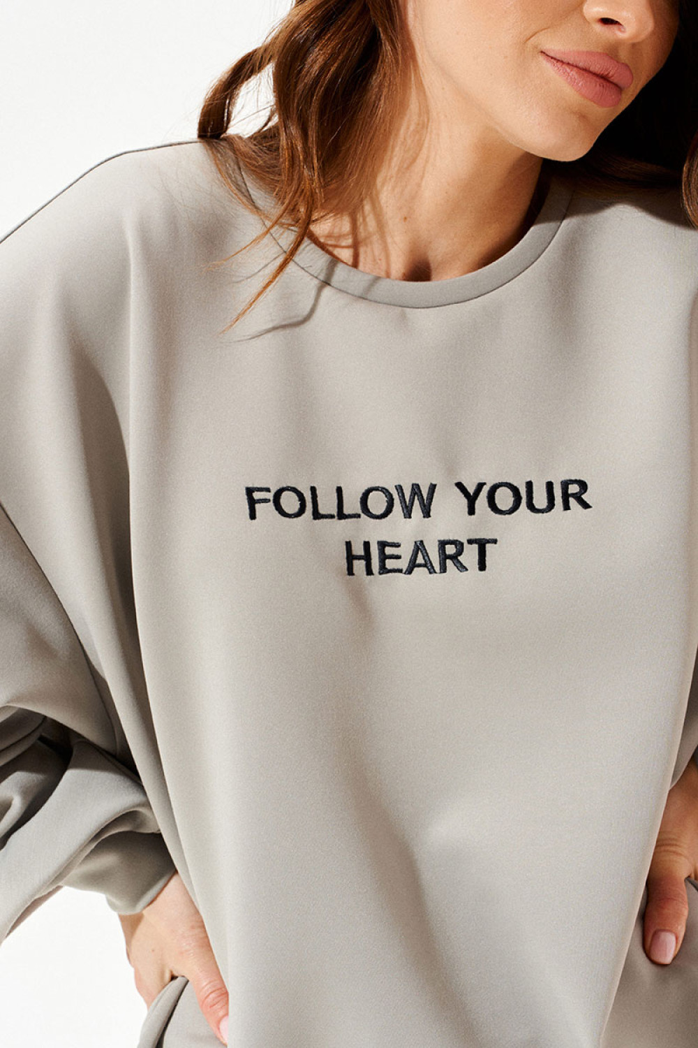 Свитшот свободного объема, прямого силуэта, с круглым вырезом горловины. Перед и спинка цельные. Перед с вышивкой «Follow your heart». Рукав втачной, длинный, с разрезом на уровне локтя, обработанный притачными планками. Нижний срез свитшота и рукава обработаны притачной манжетой.