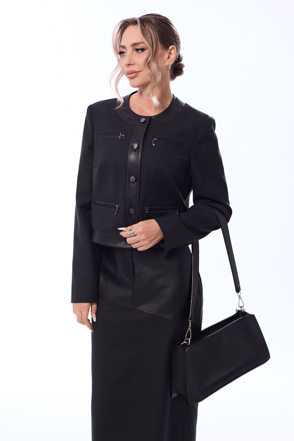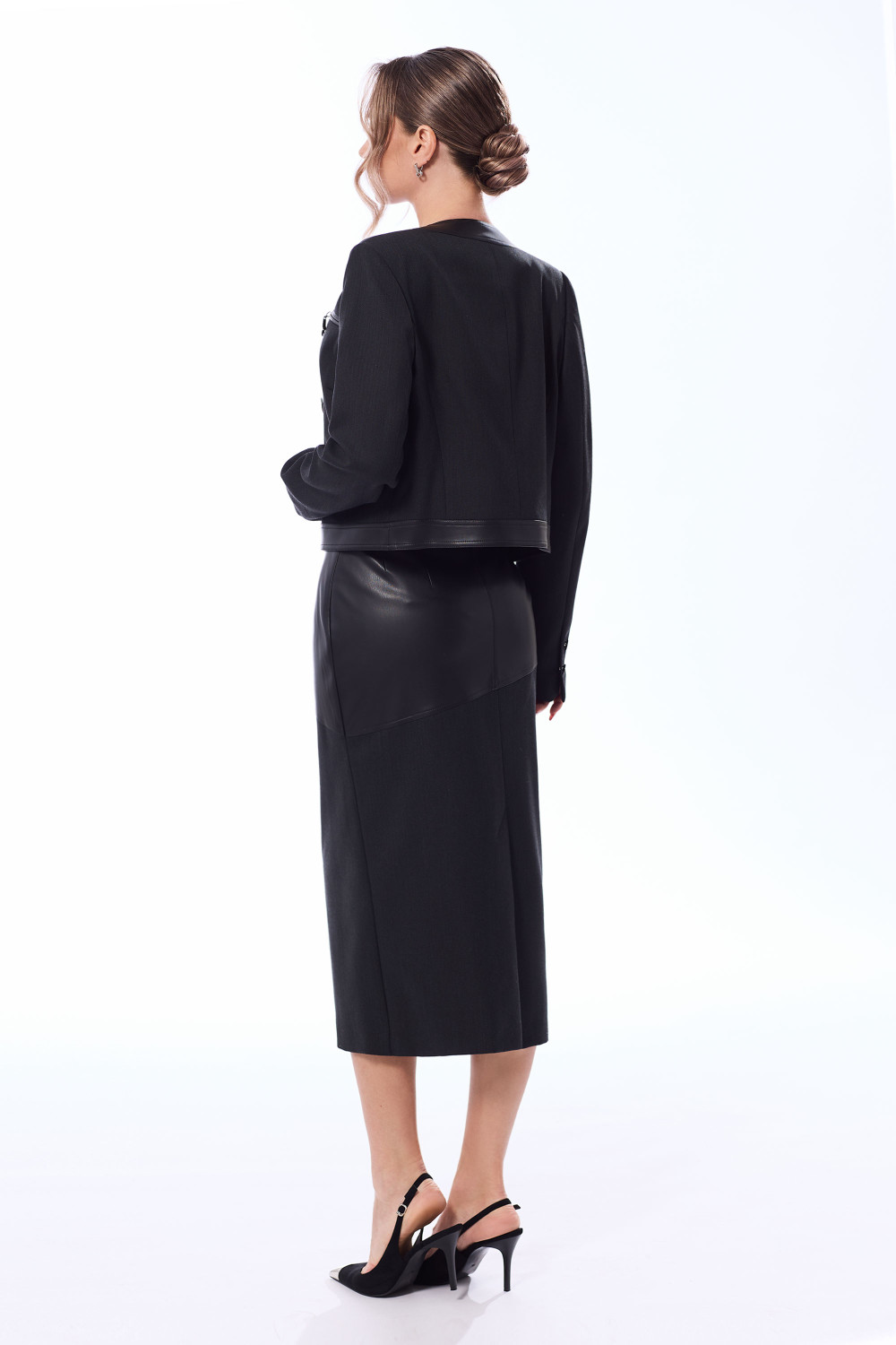 Юбка с отрезным поясом со шлевками. Застежка- гульфик. По переднемуи заднему полотнищу- асимметричный подрез. Заднее полотнище со средним швом, заканчивающимся шлицей. Планки, пояс жакета, верхняя часть юбки- из эко кожи.