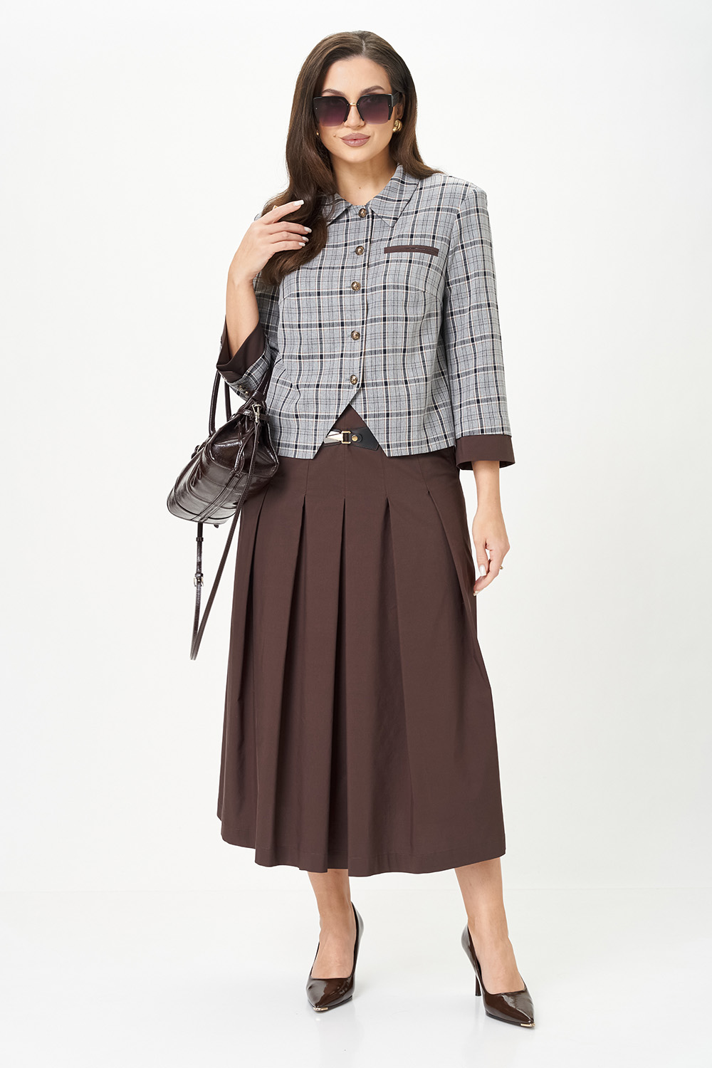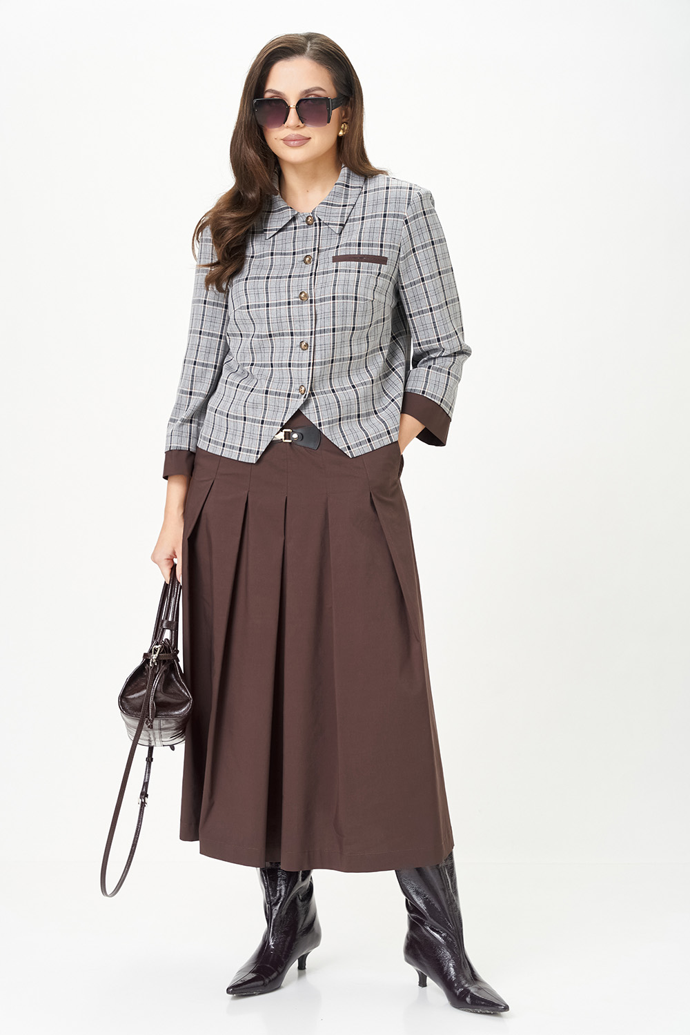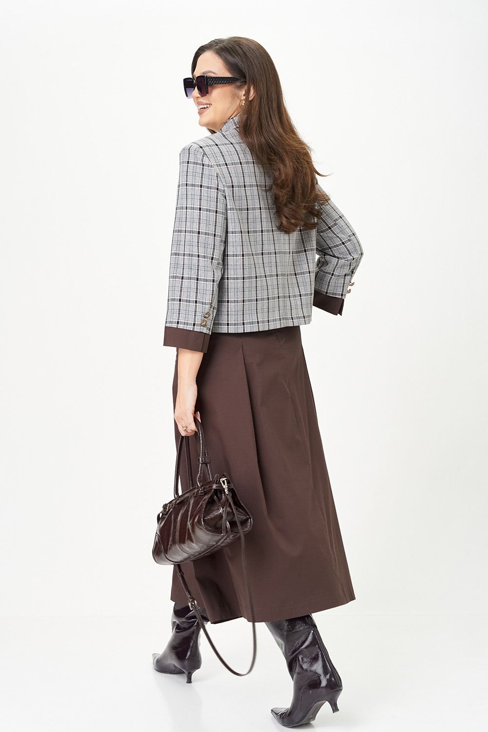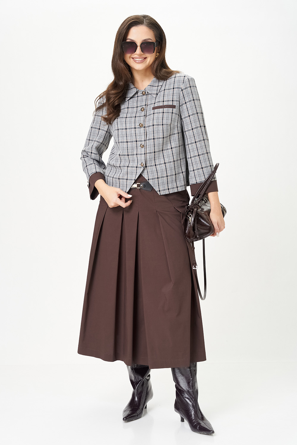 Жакет полуприталенный без подкладки, воротник классический, рукав втачной, внизу притачная манжета. По переду листочка. Юбка на обтачке со складками.