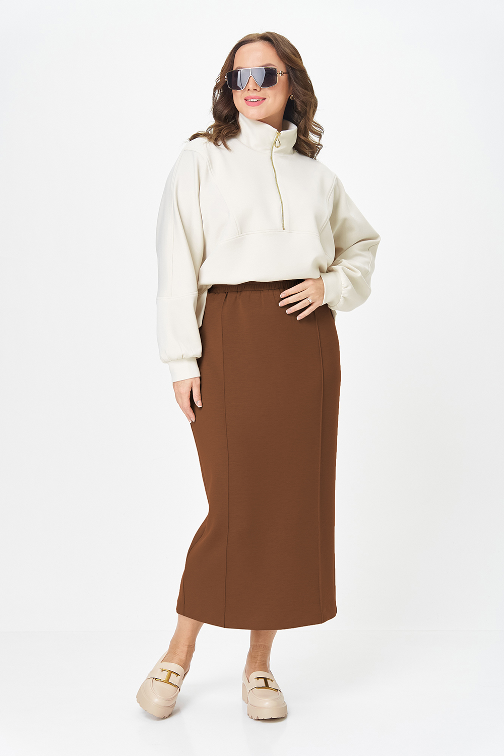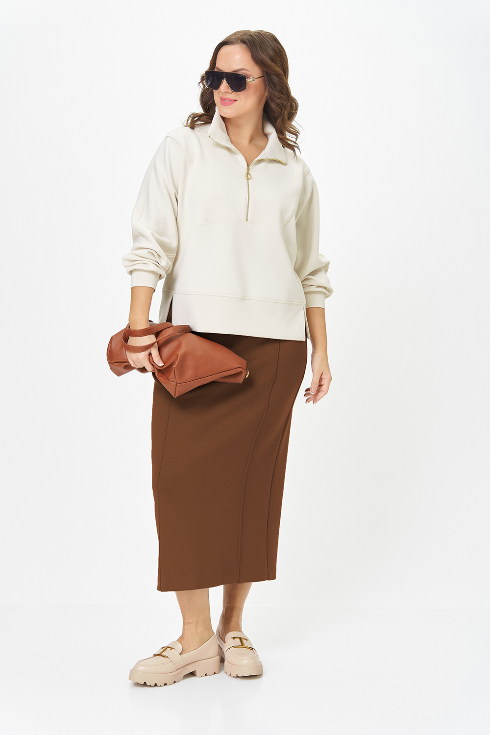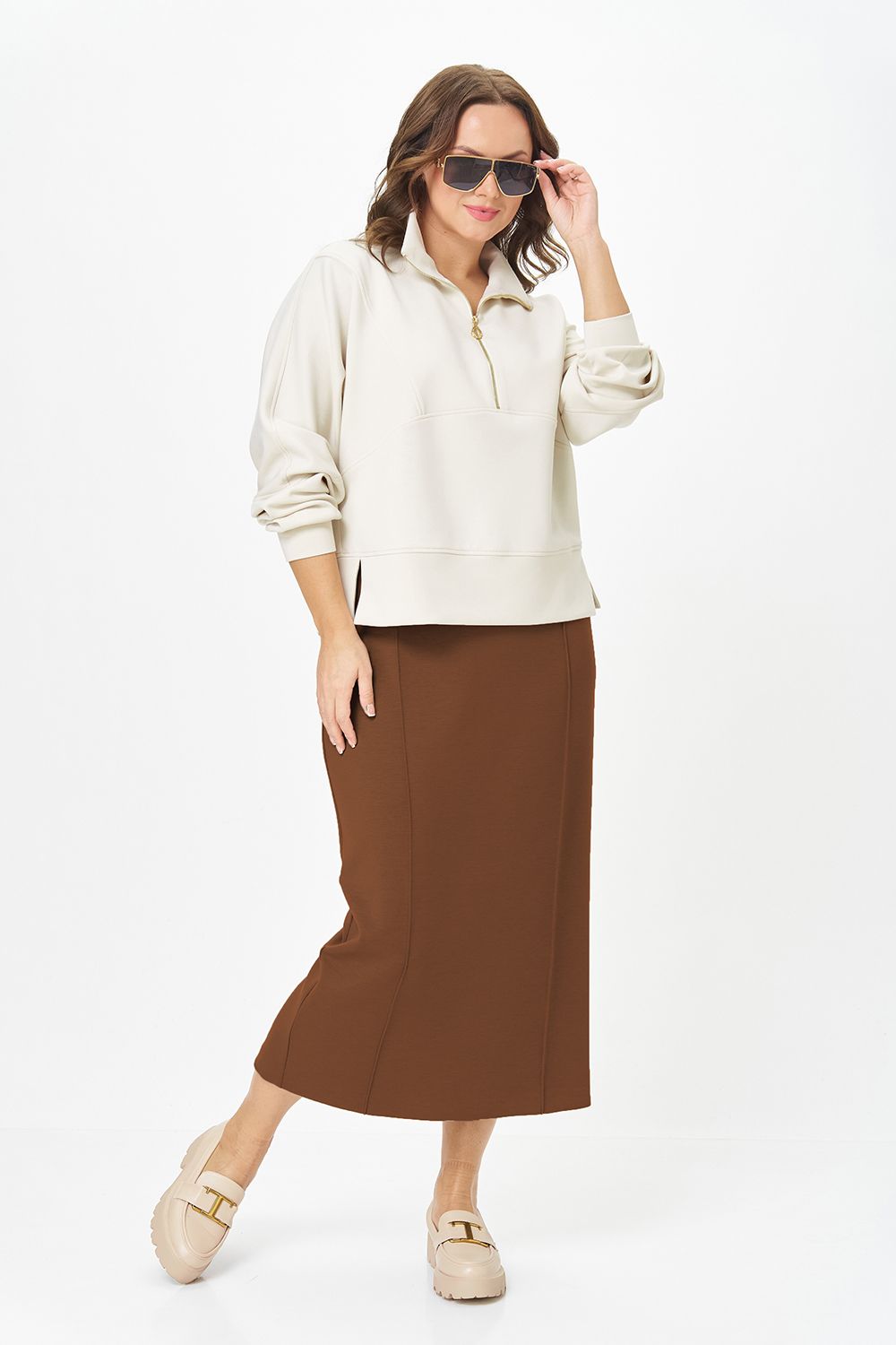 Джемпер: свободного кроя,линия плеча спущена. Воротник мягкий стойка, застёжка на металлическую тесьму молнию. Низ джемпера обработан широкой бейкой с разрезами. Спинка с декоративными подрезами и металлической нашивкой. Юбка выполнена из высококачественного трикотажного полотна чёрного цвета. Силуэт прямой, слегла заужен к низу. Пояс на узкой резинке с декоративной нашивкой по центру спереди. По передней половине юбки застрочены канты. Сзади в среднем шве юбки шлица для хода. Юбка без застёжки, без подкладки.