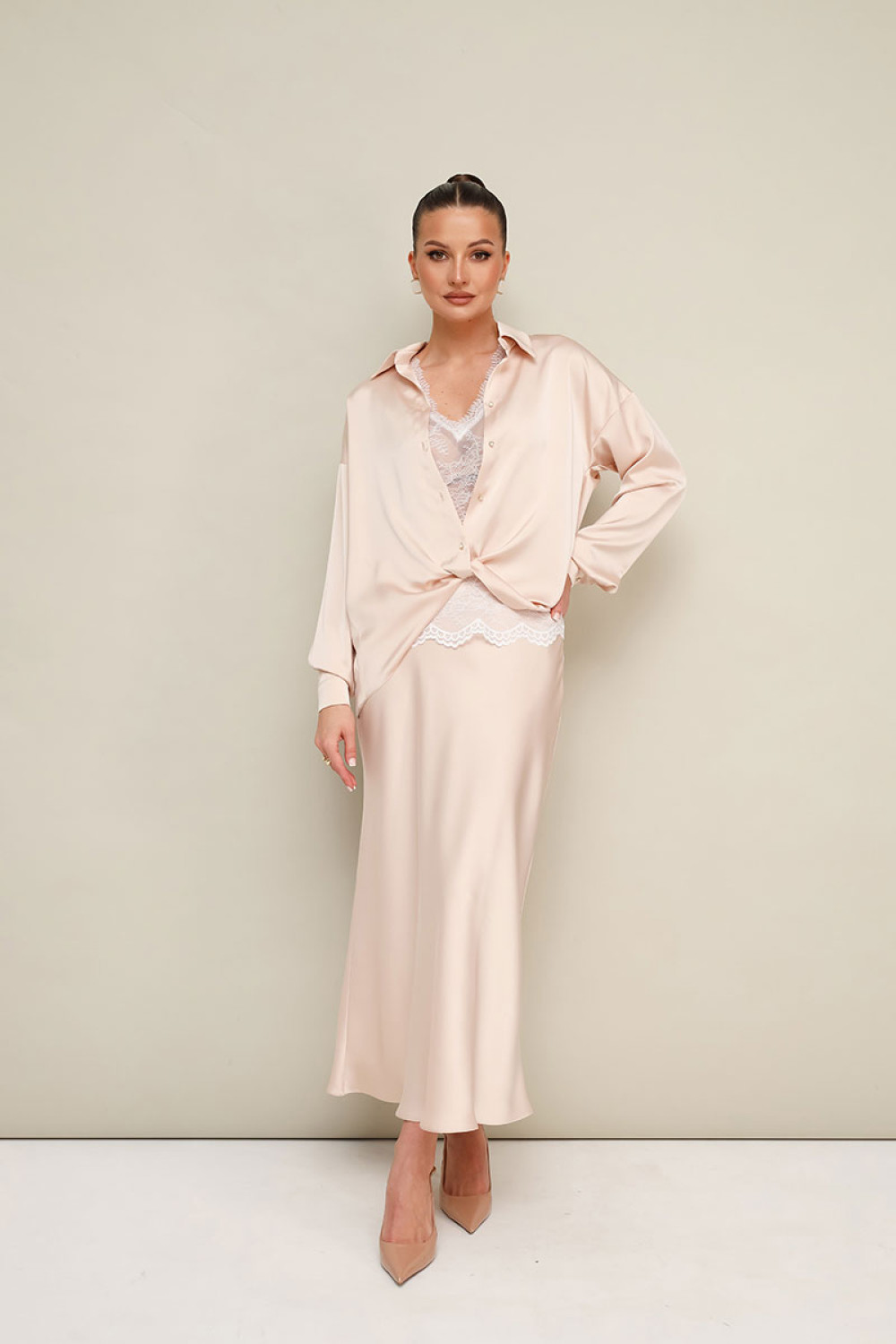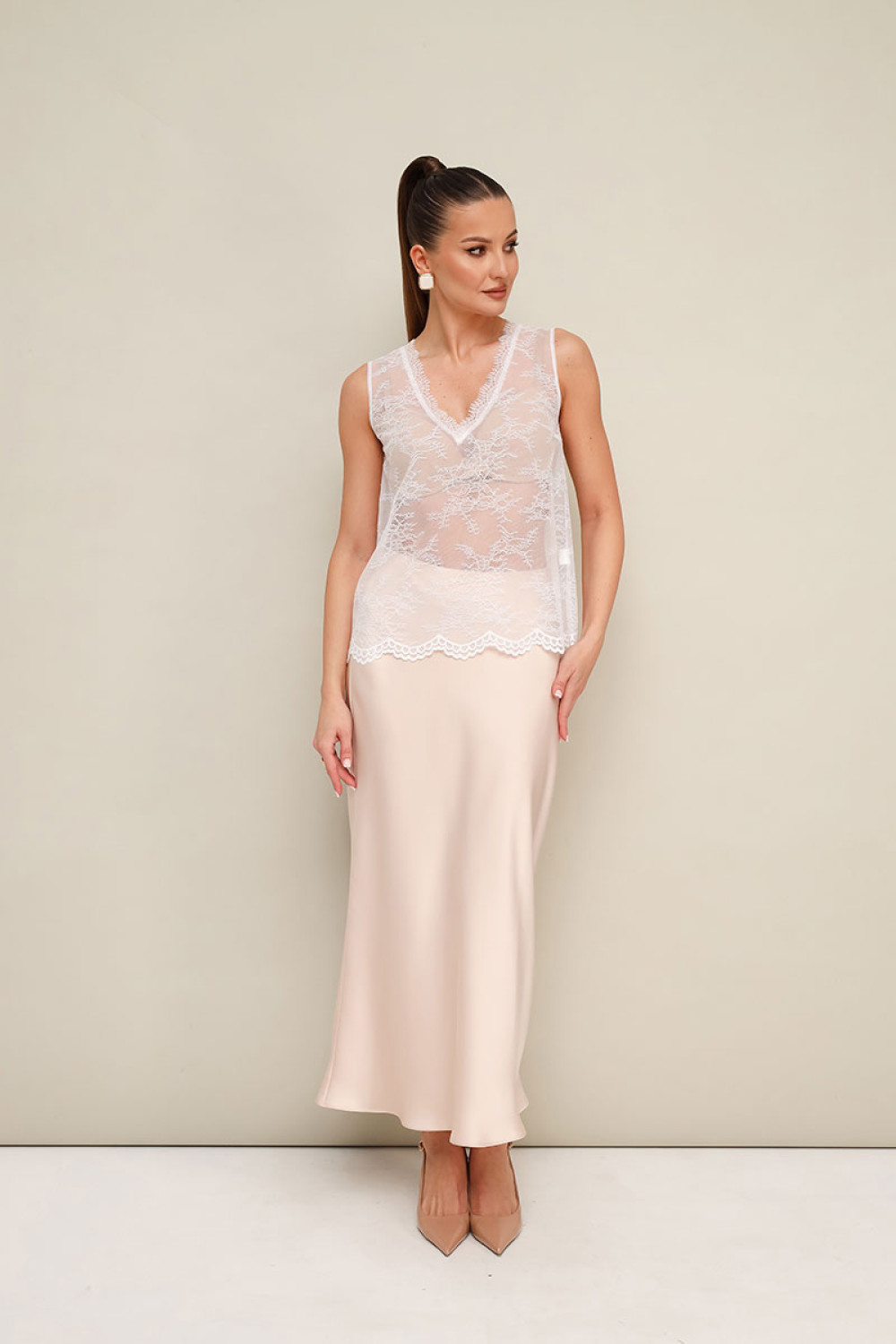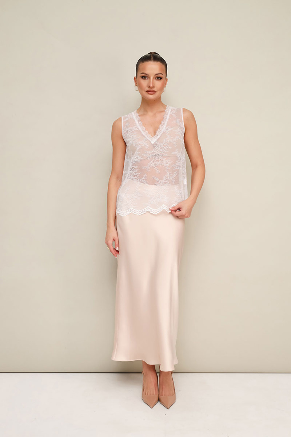 Топ прямого силуэта, выполнен из изысканного французского кружева. V-образный вырез горловины обработан кружевной отделкой.Юбка с кроем «по косой» в длине миди, пояс на обтачке, застежка в боковом шве на потайную тесьму молнию.