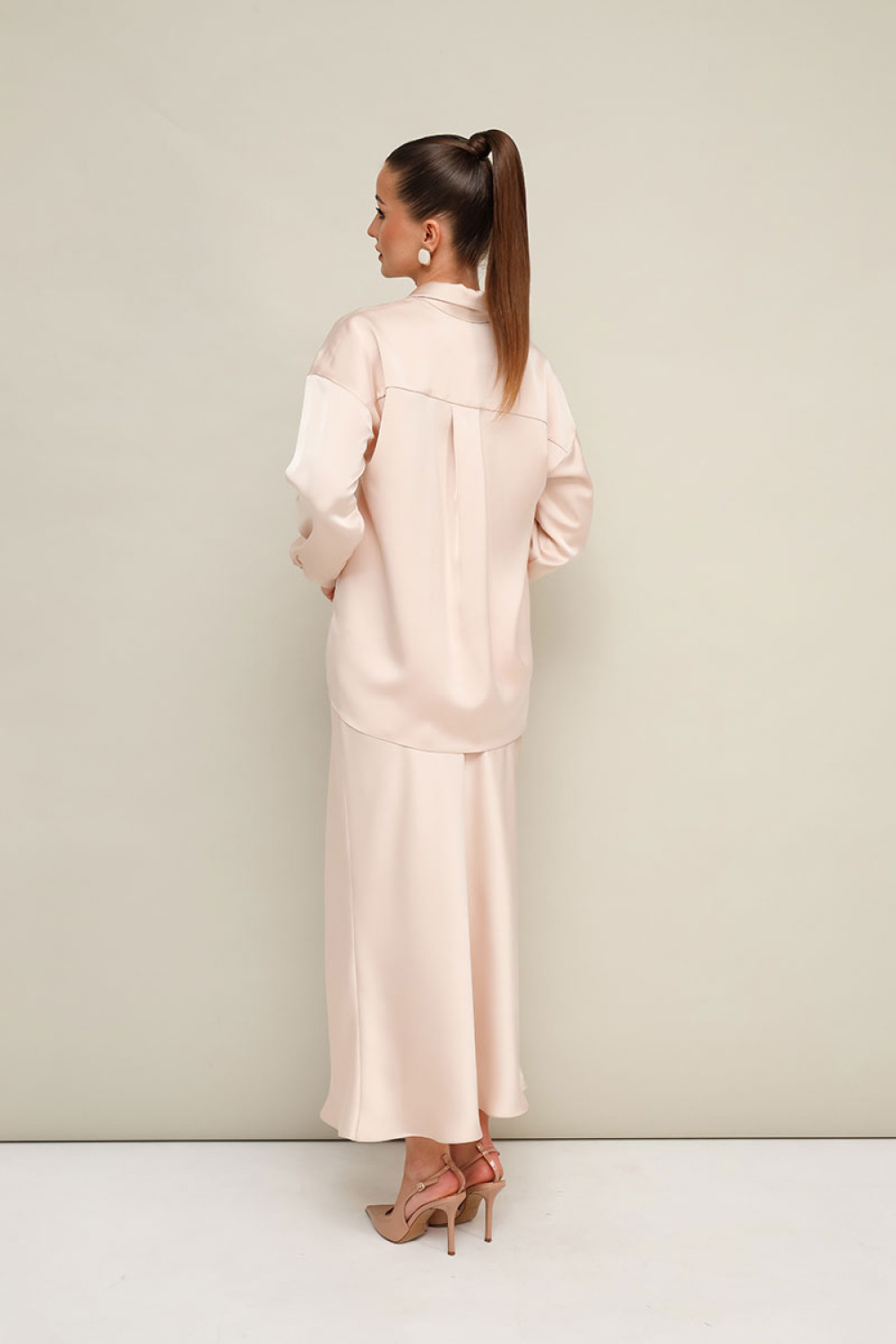 Элегантная блузка прямого кроя, выполнена из струящейся ткани с благородным матовым блеском. Горловина с рубашечным воротником на отрезной стойке, центральная застежка на петли и пуговицы. Перед блузки выполнен с декоративным перекрутом в низжней части застежки. Рукава со спущенной линией втачивания плеча, манжеты с застежкой на петли и пуговицы. Спинка с отрезной кокеткой и бантовой складкой.