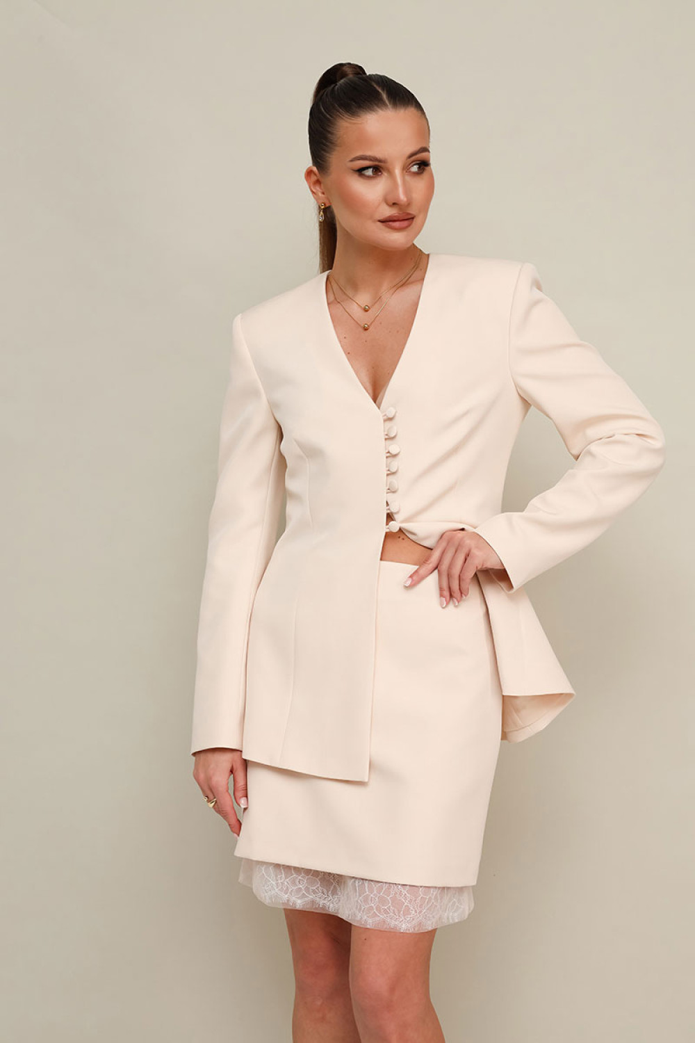 Жакет полуприлегающего силуэта с V-образным вырезом горловины. Центральная застёжка на навесные петли и обтяжные пуговицы. Рукава втачные, двухшовные. Жакет обработан подкладкой.Юбка прямого силуэта в длине мини. Верхняя юбка выполнена из костюмно-плательной ткани, пояс на обтачке, застёжка на потайную молнию в среднем шве по спинке. Нижняя юбка на резинке по поясу, низ обработан кружевной отделкой с сеткой.