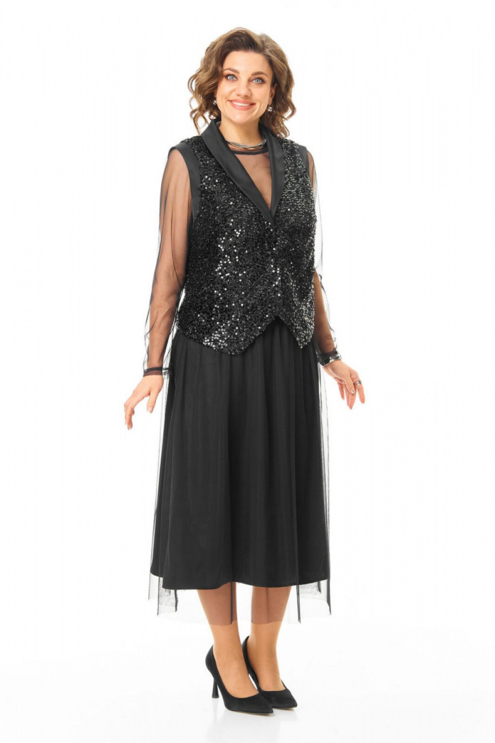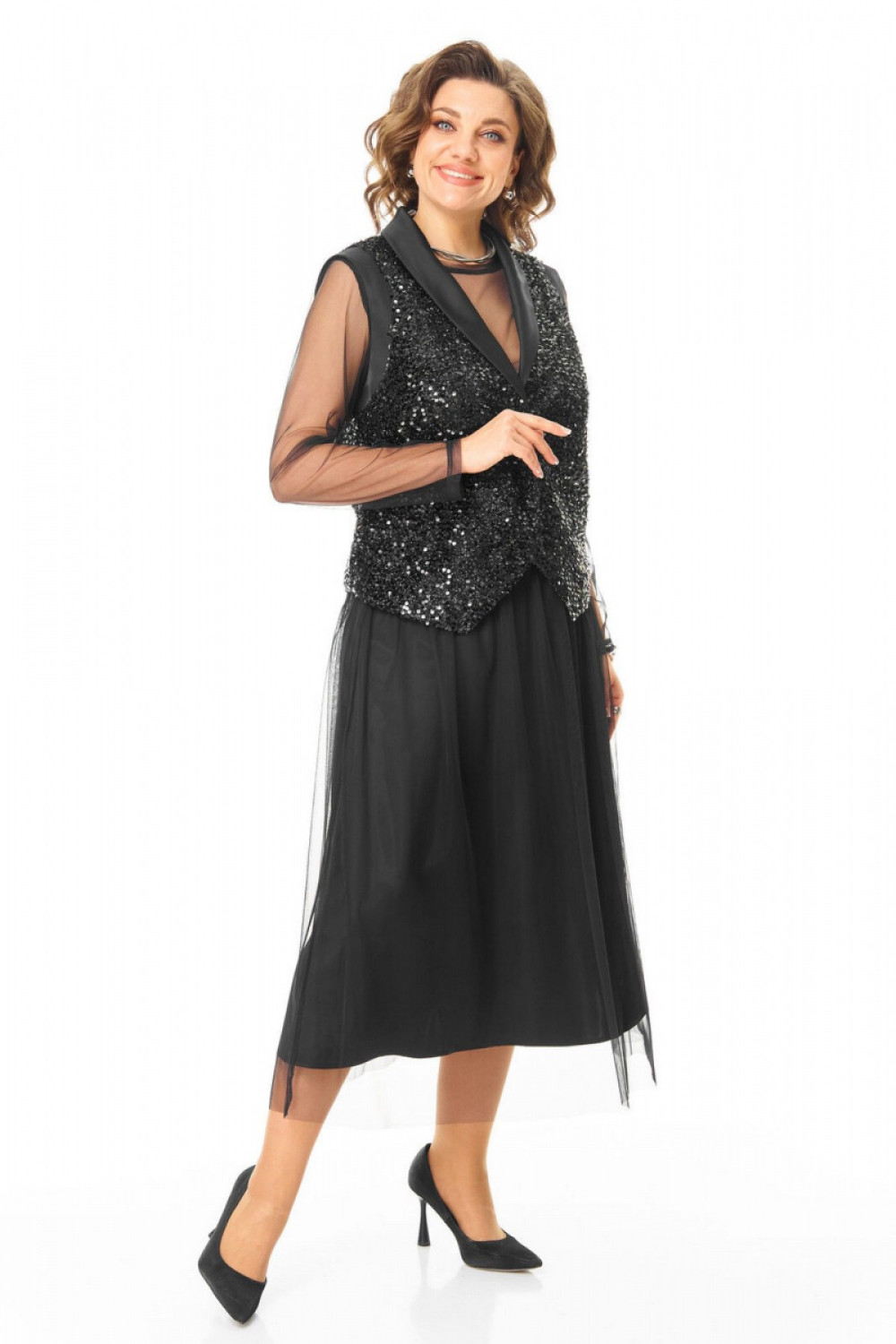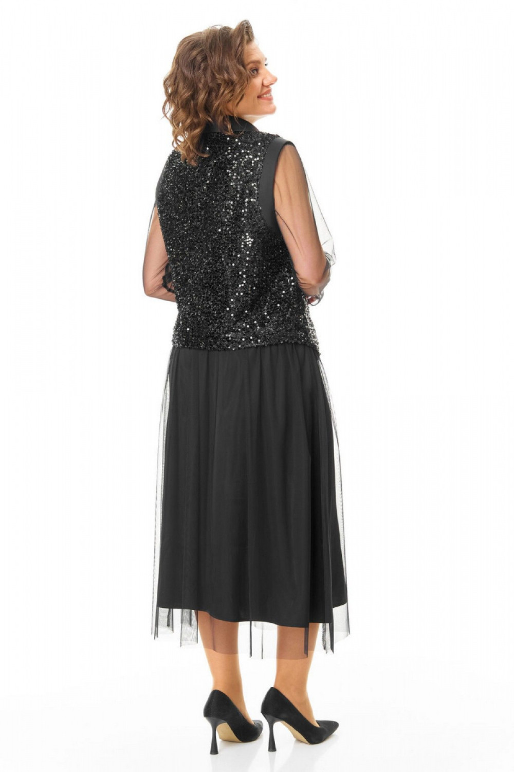 Комплект женский состоит из жилета, топа и юбки. Жилет полуприлегающего покроя на подкладке из шелковой атласной ткани. Пред и спинка выполнены из полотна с пайетками. По проймам выполнены бейки из атласной ткани. Низ жилета фигурной формы .Застёжка однобортная на потайные кнопки. Воротник отложной типа "шаль" из атласной ткани. Топ свободного покроя из полотна сетка. Горловина округлой формы, окантована. Рукав длинный. Юбка расширенная к низу длинной миди, двух слойная и двух уровневая. Нижний слой из шелковой атласной ткани, верхний из полотна сетка. Для удобства и свободы движения пояс на круговой резинке.