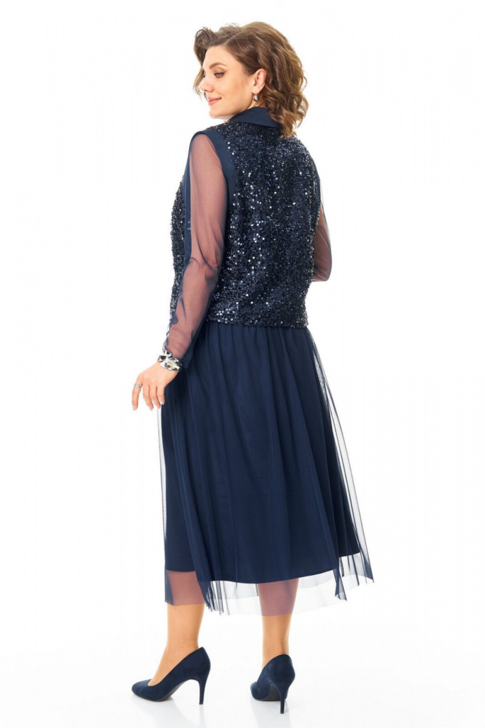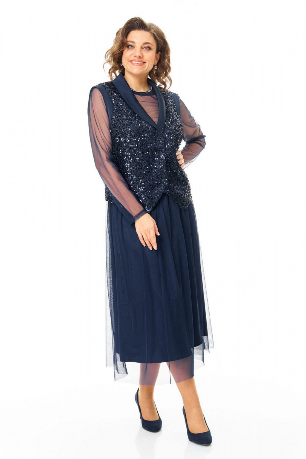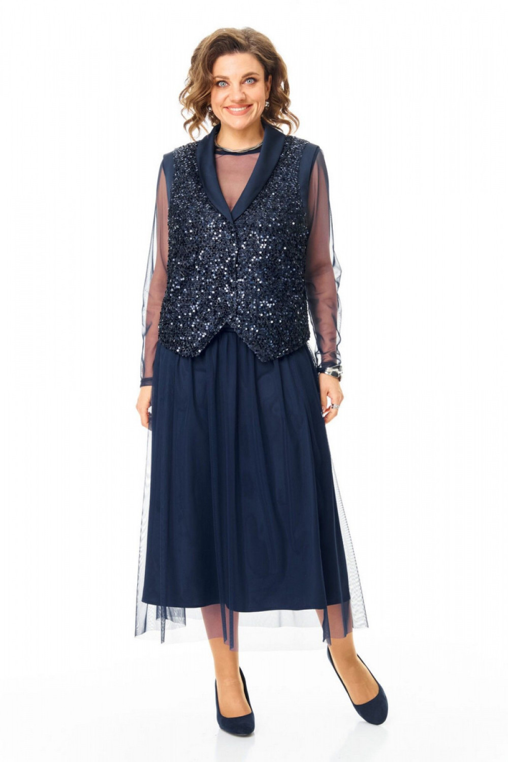Комплект женский состоит из жилета, топа и юбки. Жилет полуприлегающего покроя на подкладке из шелковой атласной ткани. Пред и спинка выполнены из полотна с пайетками. По проймам выполнены бейки из атласной ткани. Низ жилета фигурной формы .Застёжка однобортная на потайные кнопки. Воротник отложной типа "шаль" из атласной ткани. Топ свободного покроя из полотна сетка. Горловина округлой формы, окантована. Рукав длинный. Юбка расширенная к низу длинной миди, двух слойная и двух уровневая. Нижний слой из шелковой атласной ткани, верхний из полотна сетка. Для удобства и свободы движения пояс на круговой резинке.