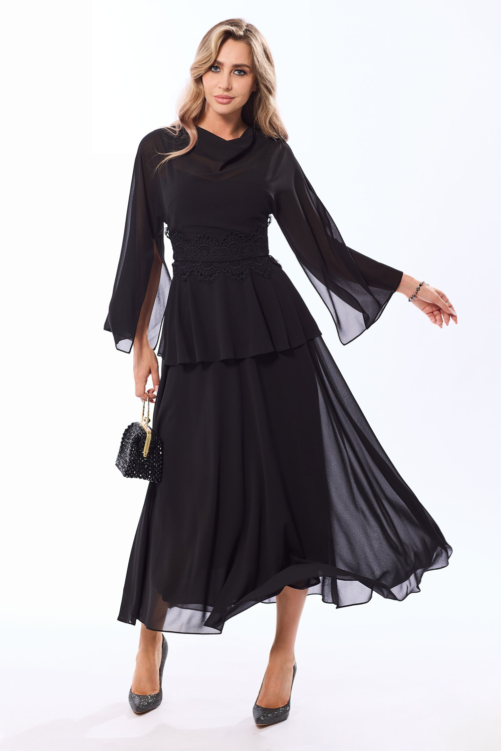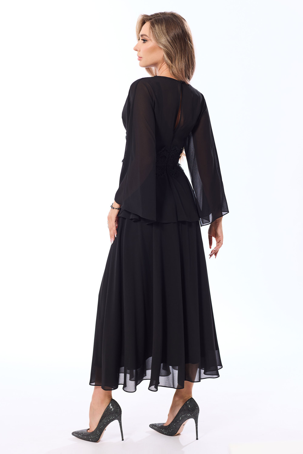 Блузка, без воротника, по переду драпировка- качель, застежкой на навесную петлю и пуговицу по горловине спинки и на потайную молнию по среднему шву спинки. Блузка с отрезной баской, декорированной по талии кружевом. Кружево в тон основной ткани. Рукав цельнокроенный, длинный, с разрезом по нижнему шву. Спинка со средним швом.