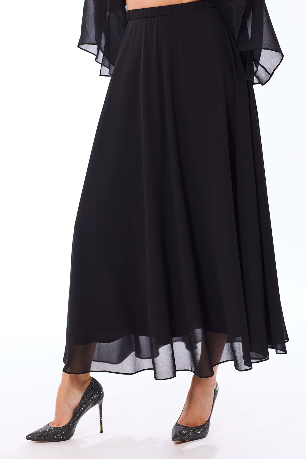 Юбка с отрезным поясом, присборенным на резинку, застежкой на потайную молнию по среднему шву заднего полотнища, расширенная к низу.