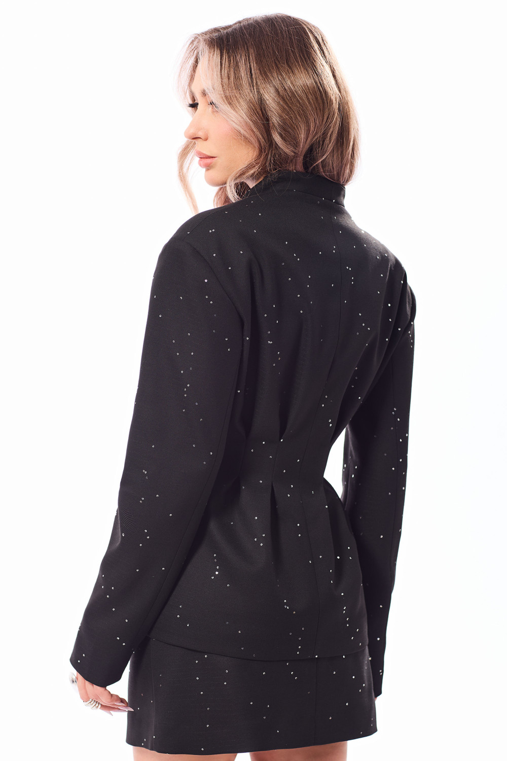 Жакет с центральной застежкой на петли и пуговицы, без воротника, с V-образным вырезом горловины. По переду с двумя встречными складками, расположенными на уровне линии талии. По спинке со средним швом и четырьмя встречными складками, расположенными на уровне линии талии. Рукав втачной, длинный, плечо спущенное. Горловина спинки с втачной стойкой. Силуэт: полуприлегающий.