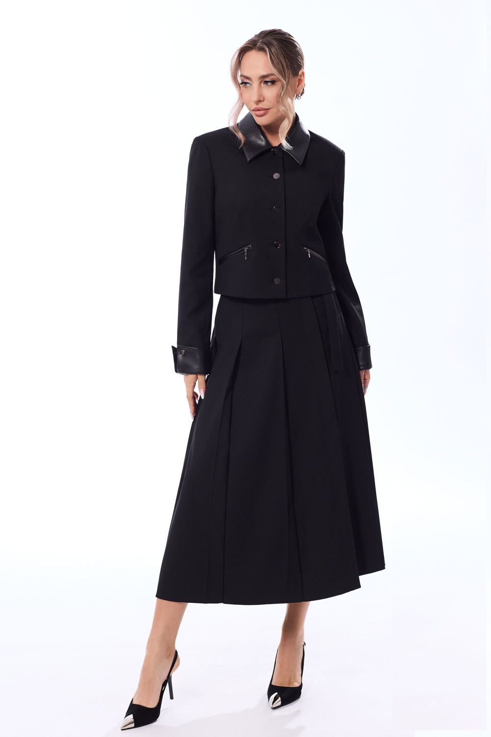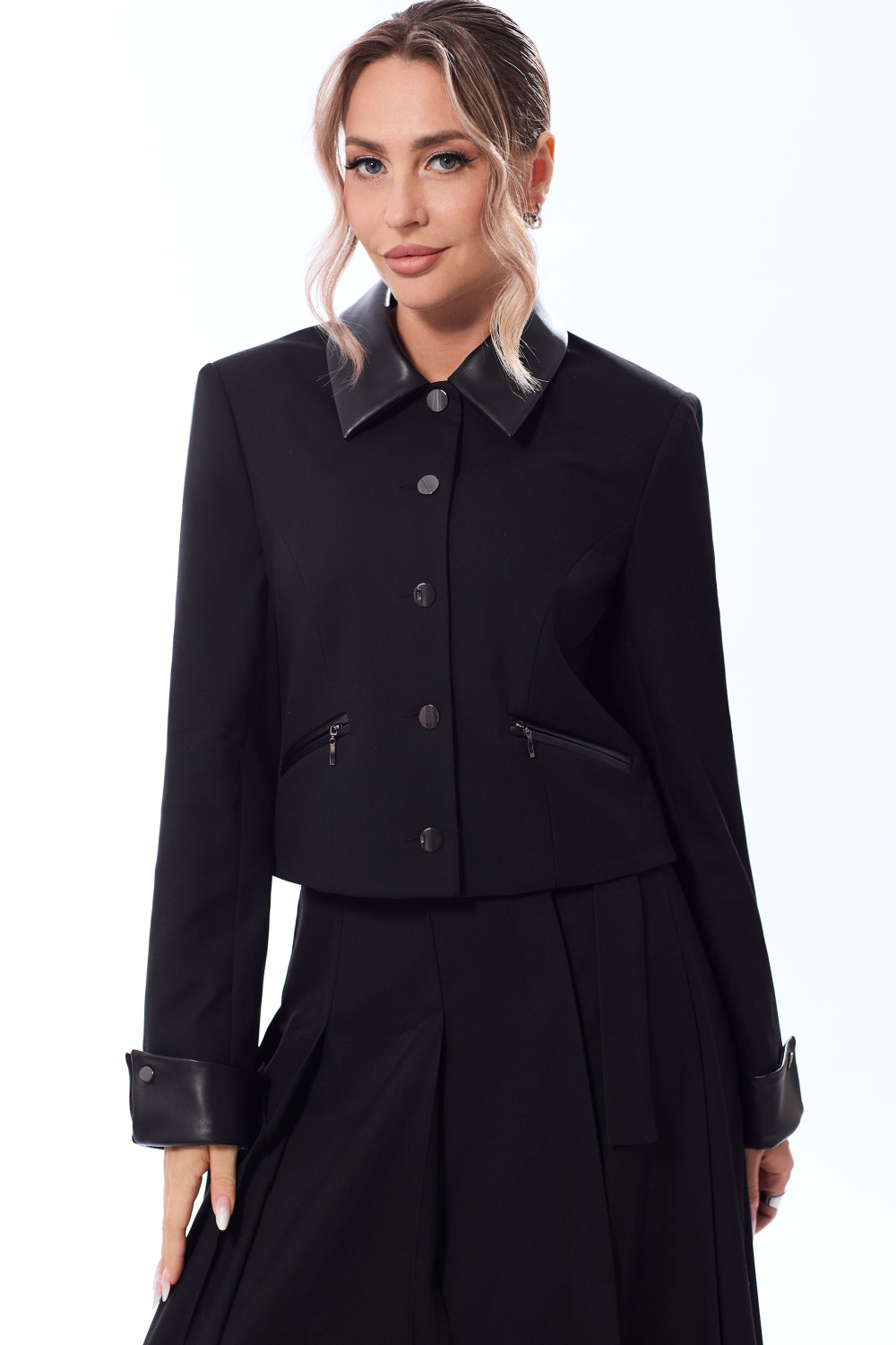 Жакет с центральной застежкой на петли и пуговицы, втачным воротником. По переду с рельефами, выходящими из проймы, на уровне линии талии расположены прорезные карманы в рамку с молниями. По спинке со средним швом и рельефами, выходящими из проймы. Рукав втачной, длинный, с отложной манжетой. Манжета закреплена к рукаву петлями и пуговицами. Воротник, манжеты, рамки кармана- из кож зама в тон основной ткани. жакет на подкладке.