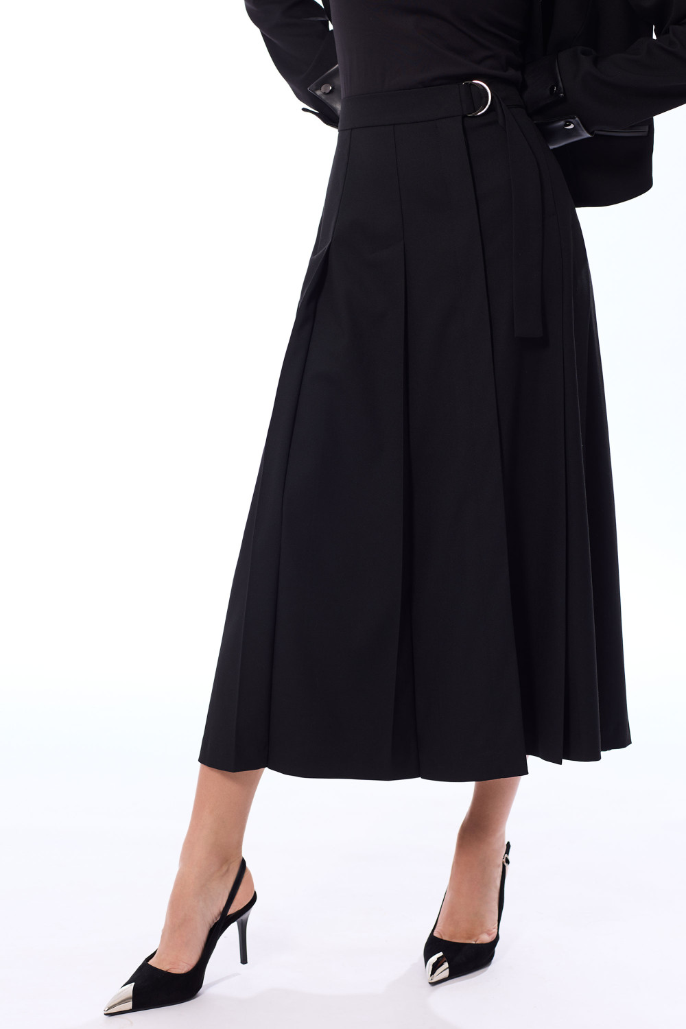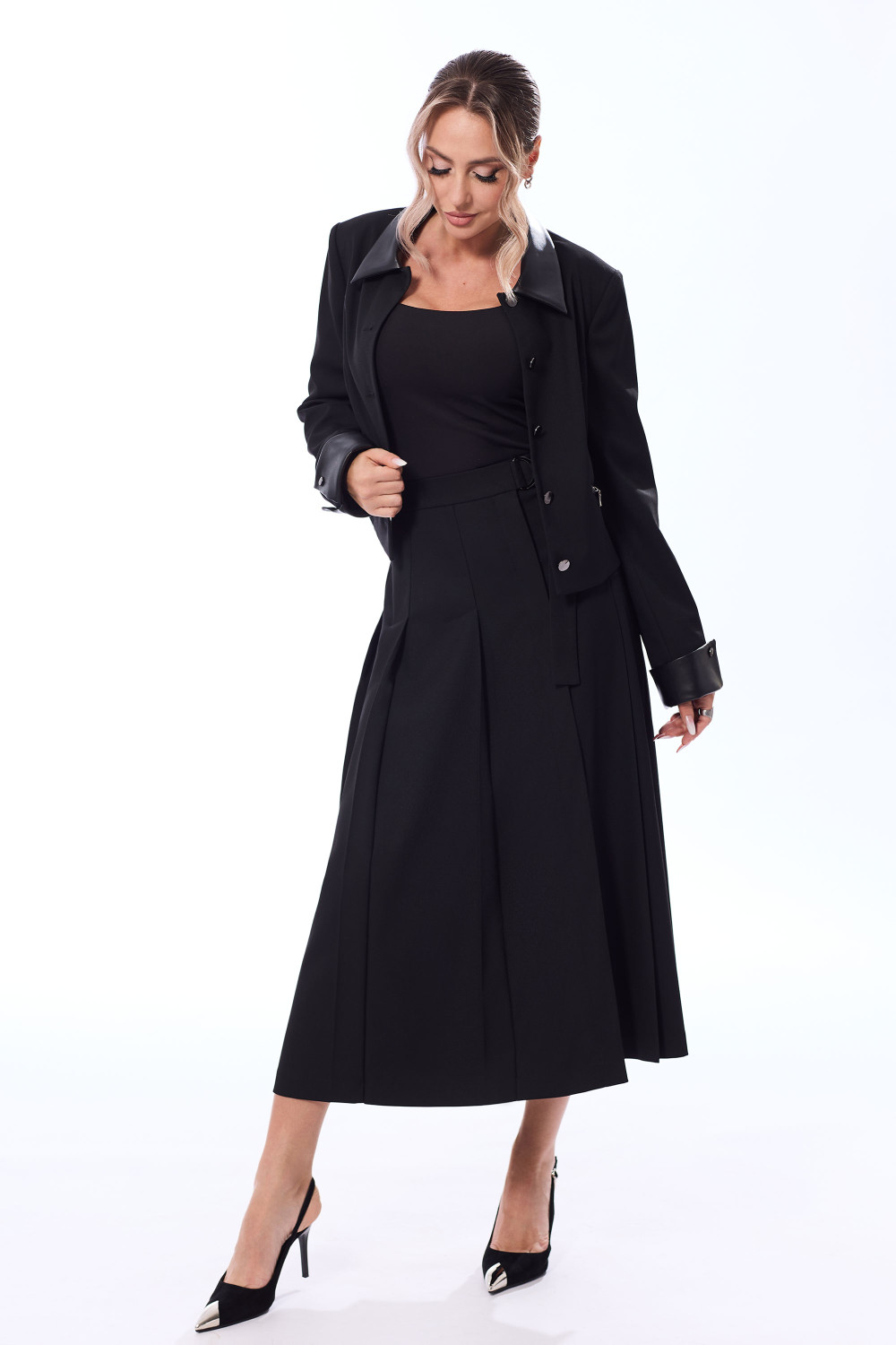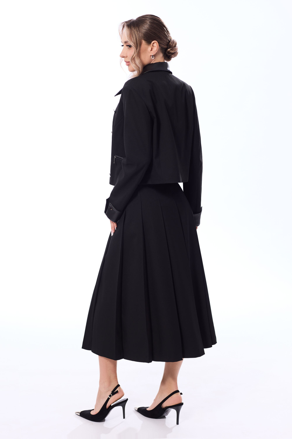 Юбка с отрезным поясом, односторонними складками по передней и задней половинке. На поясе- декоративная завязка, закрепленная полукольцами. На переднем полотнище- асимметричный разрез с застежкой на петли и пуговицы. Юбка расклешенная.