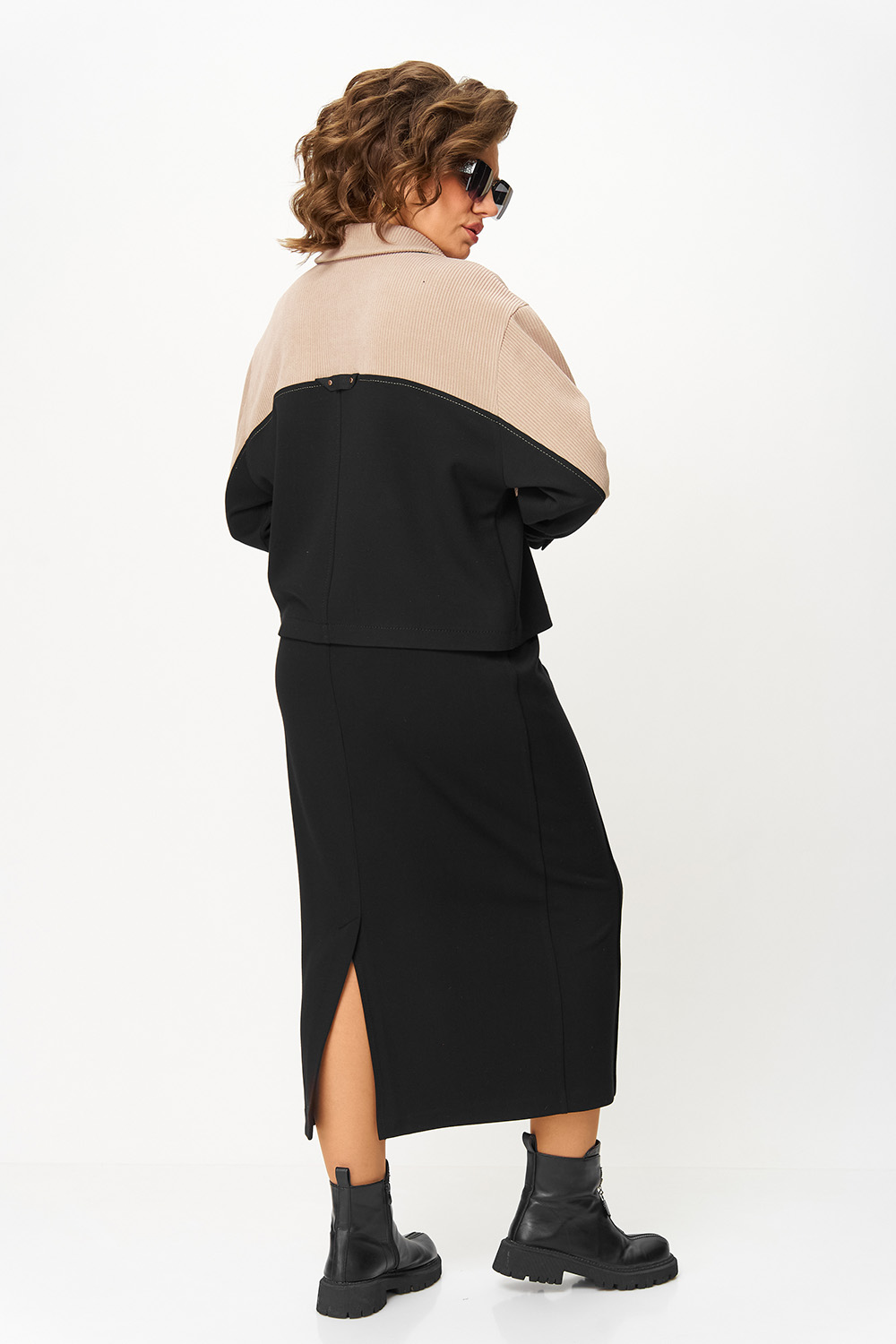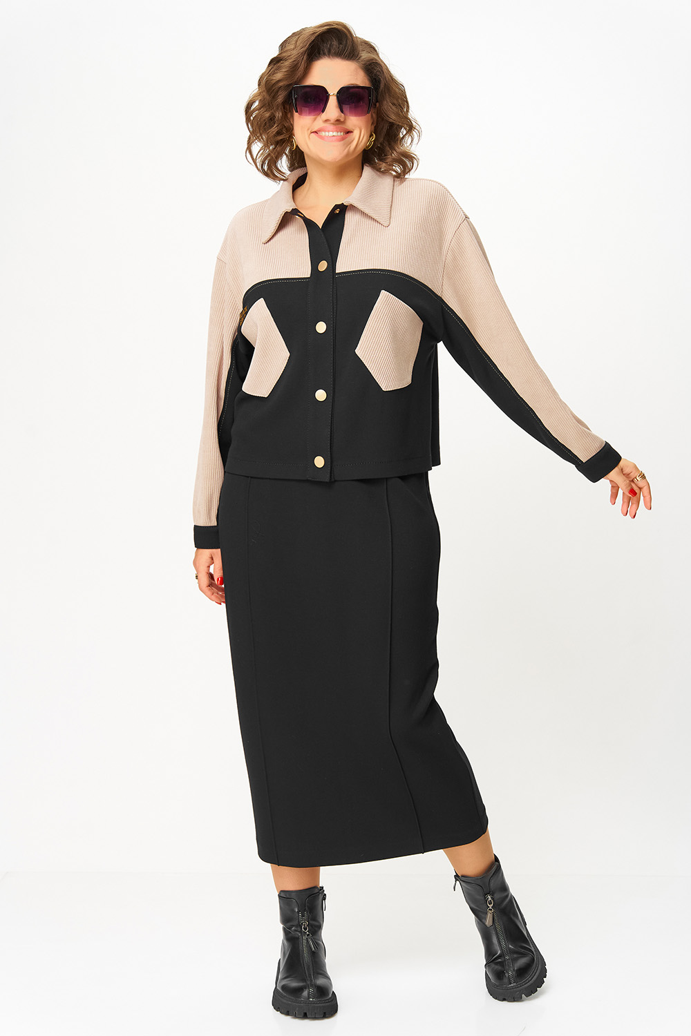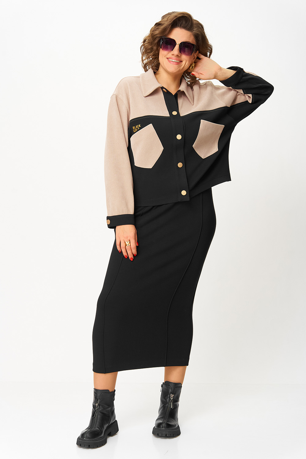 Костюм женский: жакет и юбка. Жакет выполнен из комбинации двух трикотажных полотен контрастных цветов. Жакет без подкладки, воротник рубашечного типа, застежка на кнопки. Юбка без застёжки, без подкладки на резинке.