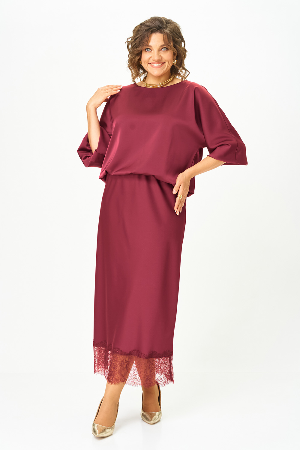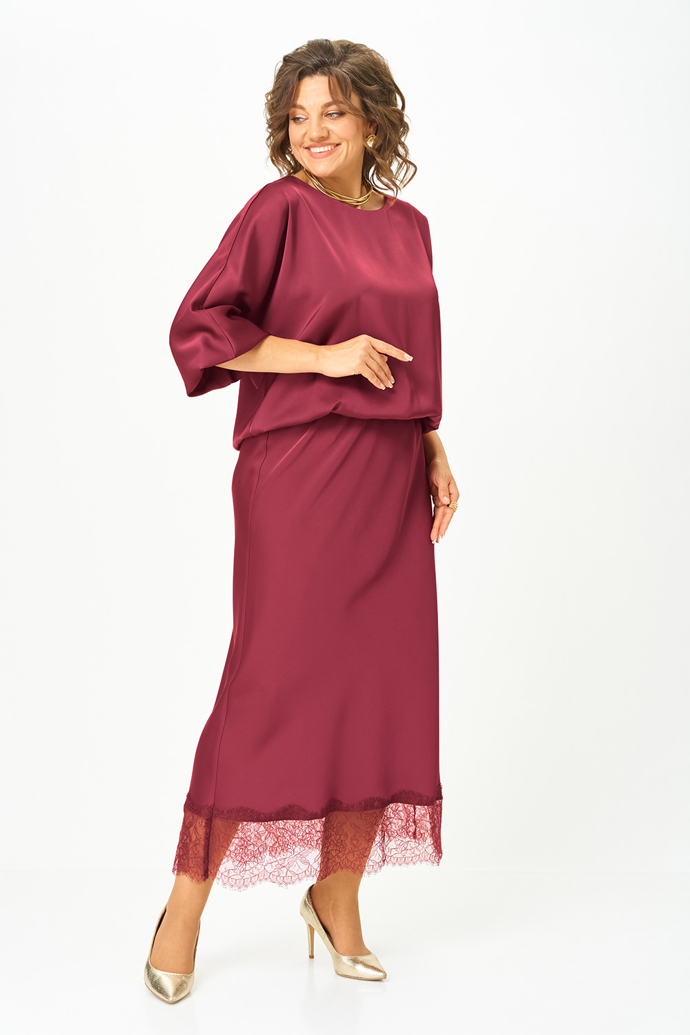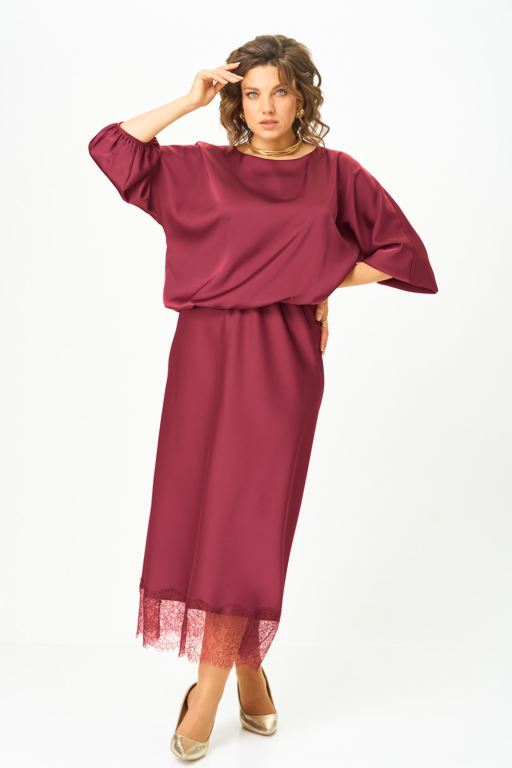 Костюм двойка, состоящий из блузы и юбки. Блуза с округлым вырезом горловины, рукав цельнокроеный. Низ блузы собран на резинке. Юбка расширенная к низу на резинке. По низу декор в виде кружева.