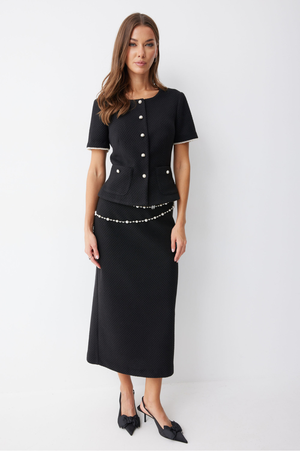 Жакет полуприлегающего силуэта из трикотажного полотна. Горловина округлая по центру застежка на петли и пуговицы. Рукав втачной короткий. По переду талиевые вытачки и накладные карманы, на спинке – талиевые вытачки. Жакет на подкладке. Обращаем ваше внимание, что фурнитура может отличаться от фото.
