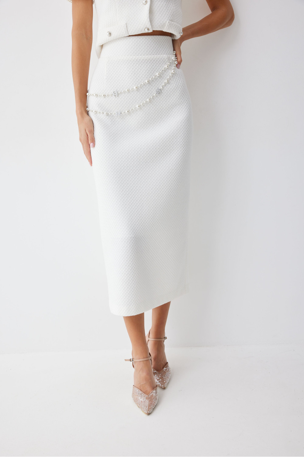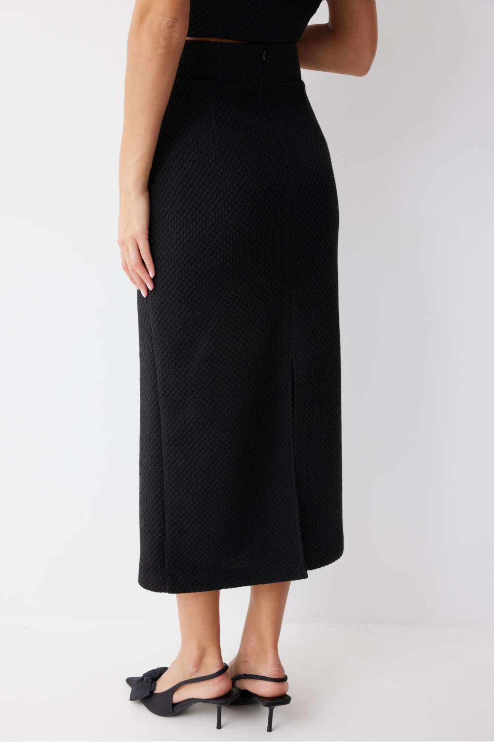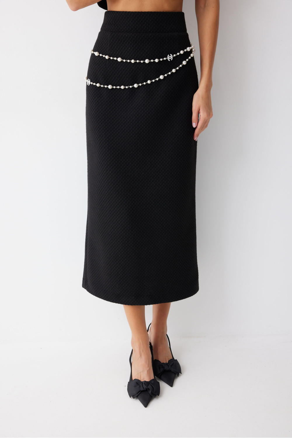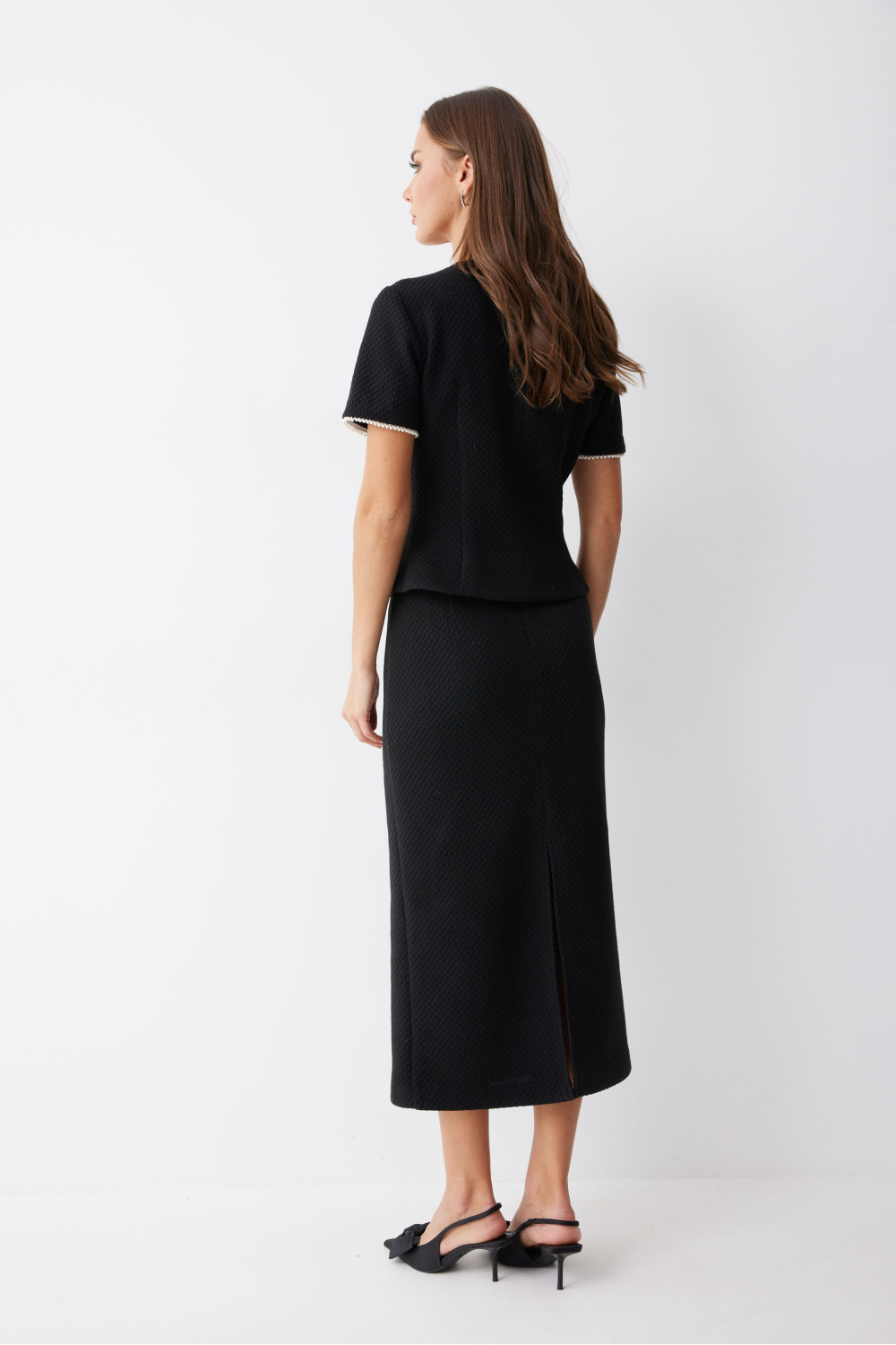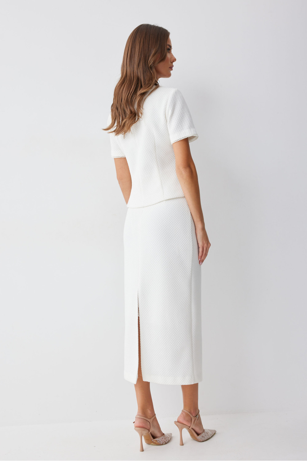 Юбка прямого силуэта из трикотажного полотна. По верху юбки притачной пояс. На спинке юбки в центральном шве застежка на потайную молнию, по низу разрез. Юбка на подкладке.Длина жакета (44-48р - 53см)(50-54р - 55см).