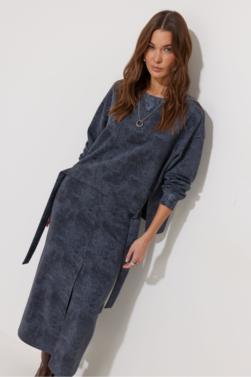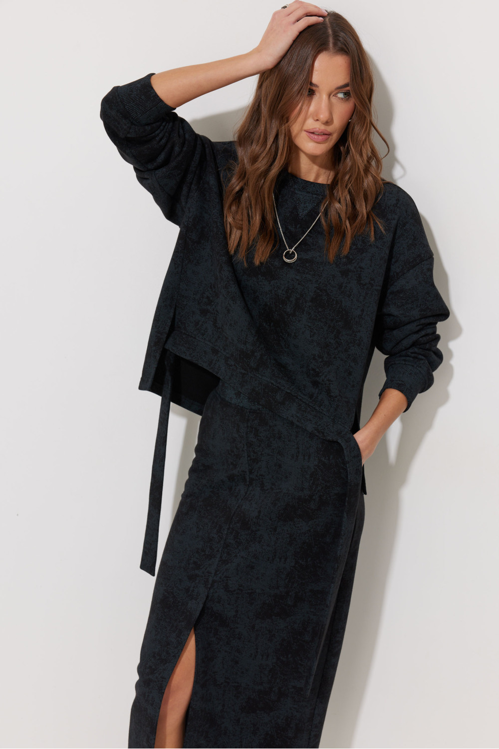 Джемпер прямого силуэта с фигурным низом из трикотажного полотна. Горловина округлая. Рукав со спущенной линией плеча, по низу на манжете. Джемпер со смещенным боковым швом.