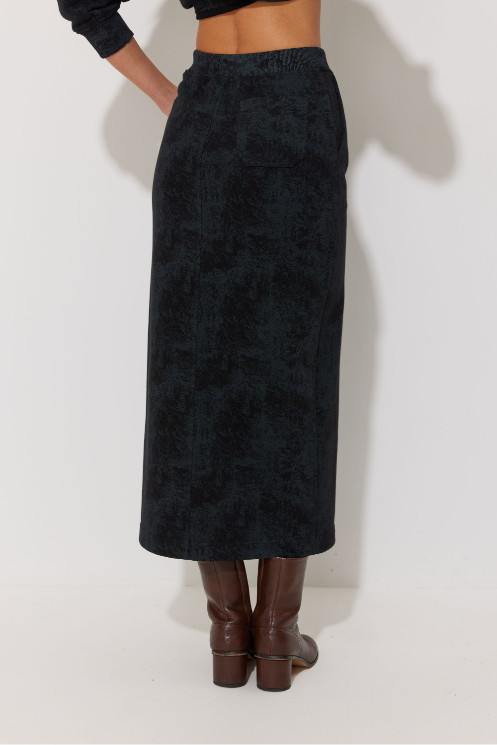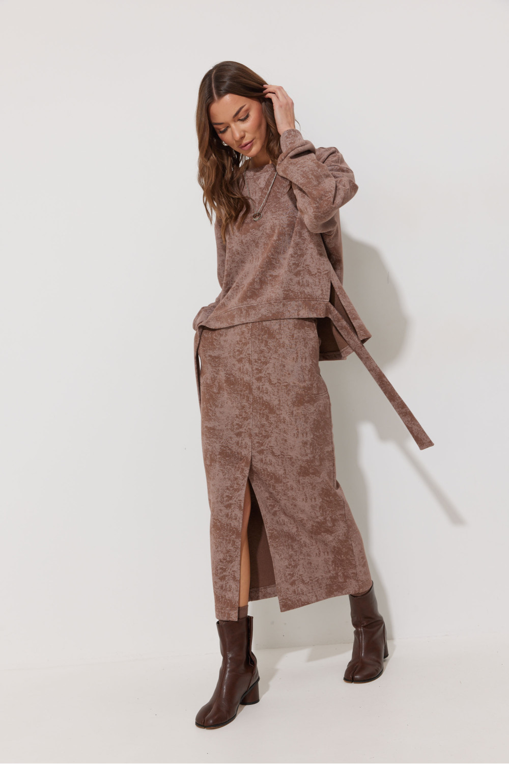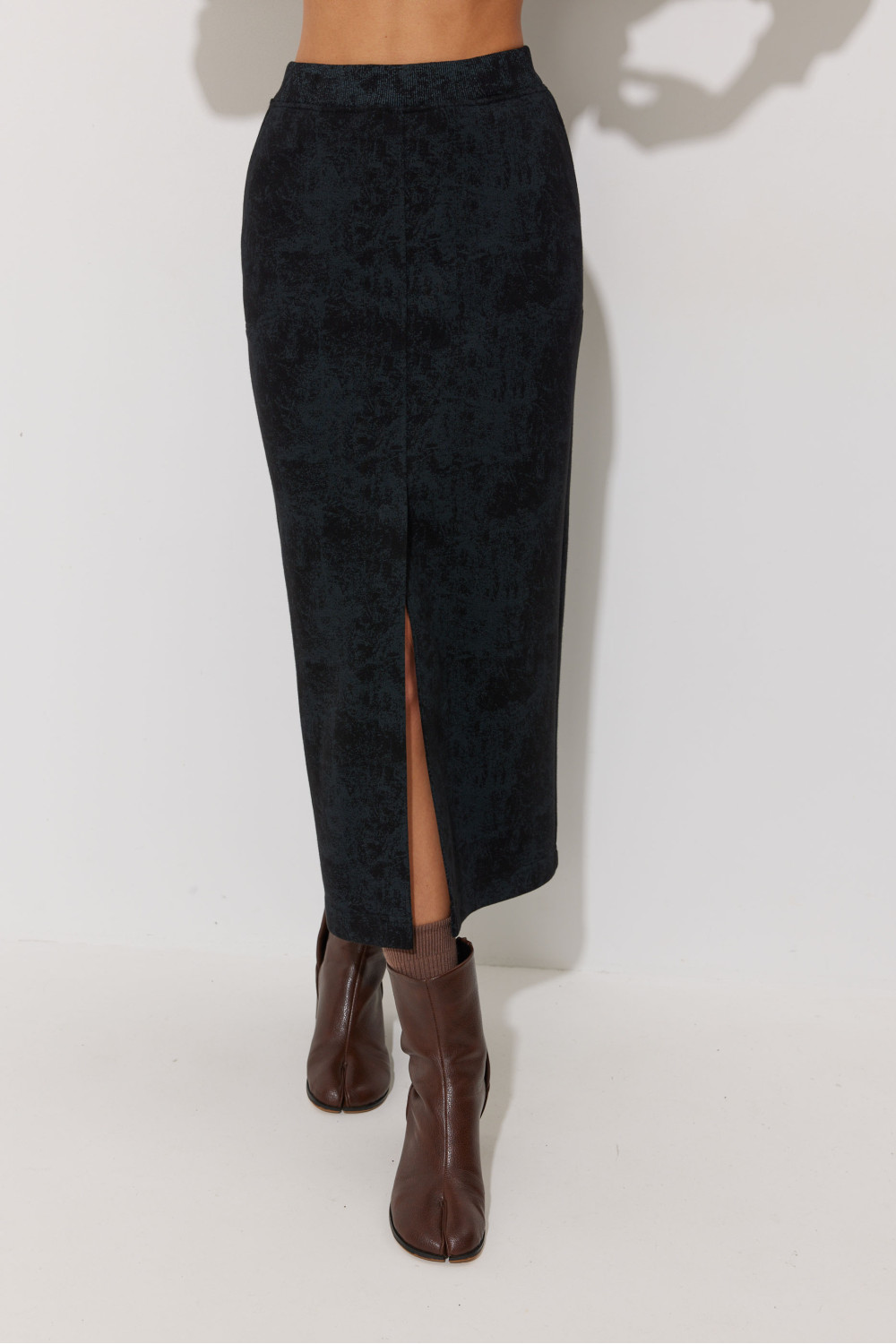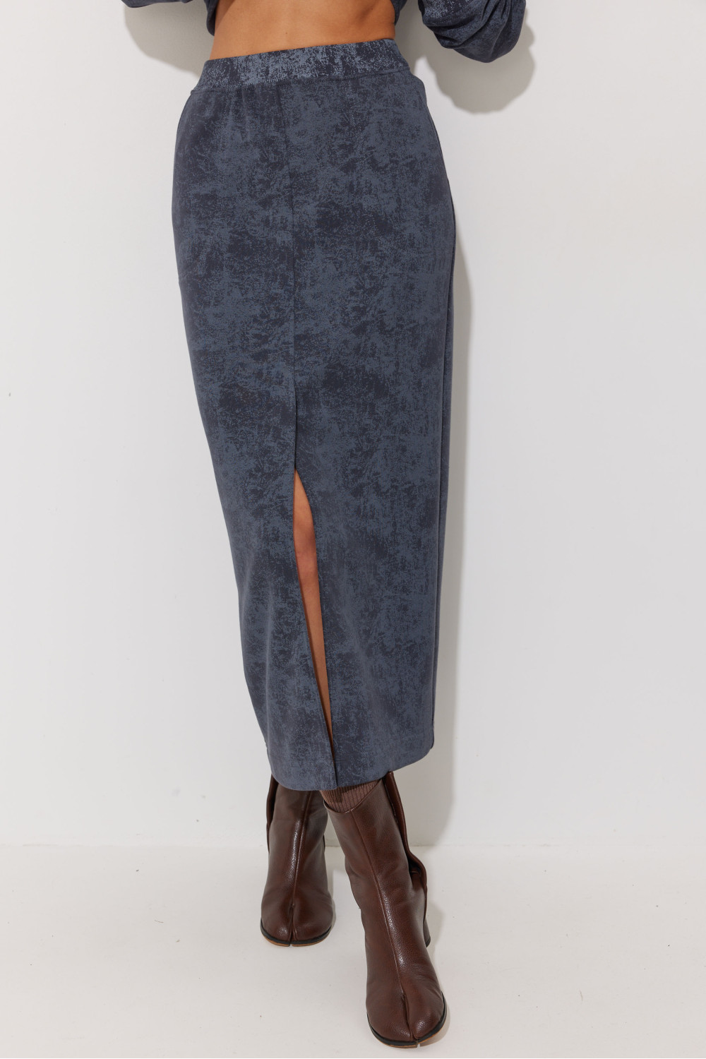 Юбка полуприлегающего силуэта из трикотажного полотна. По верху юбки притачной пояс с резинкой. По переду средний шов со шлицей и карманы. На заднем полотнище юбки накладные карманы.Подходит на рост 164-170 см.