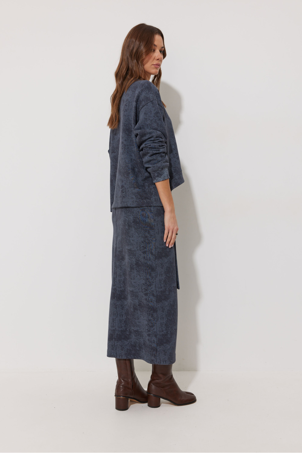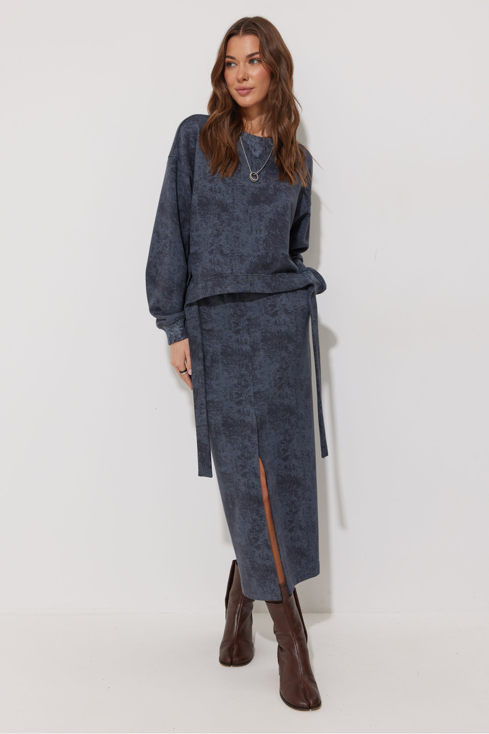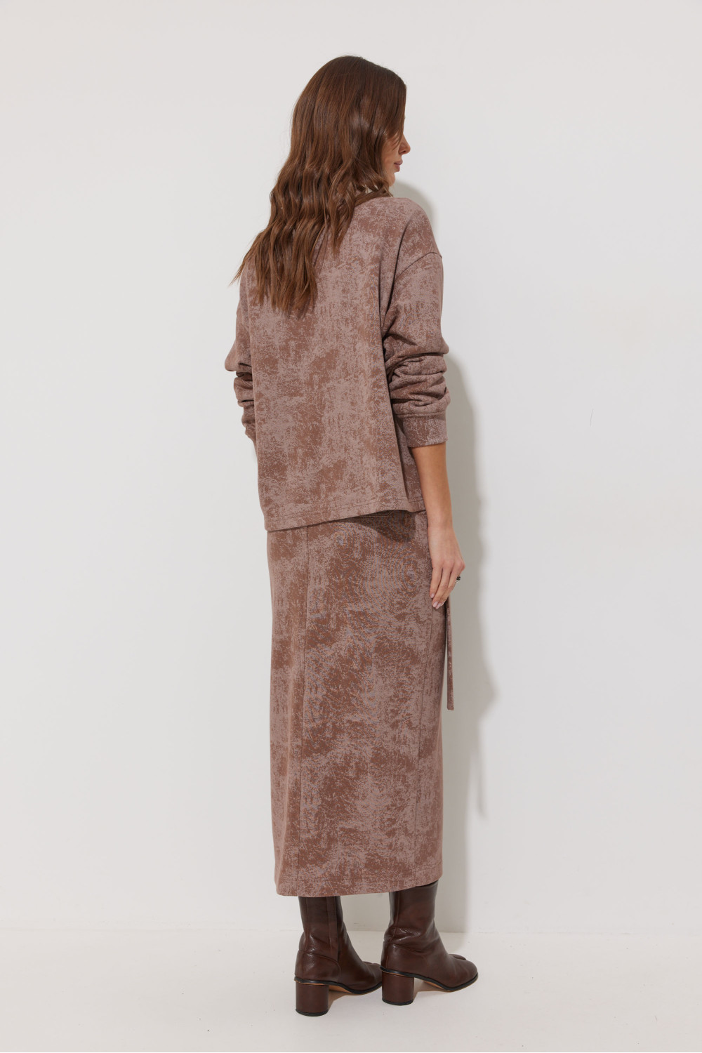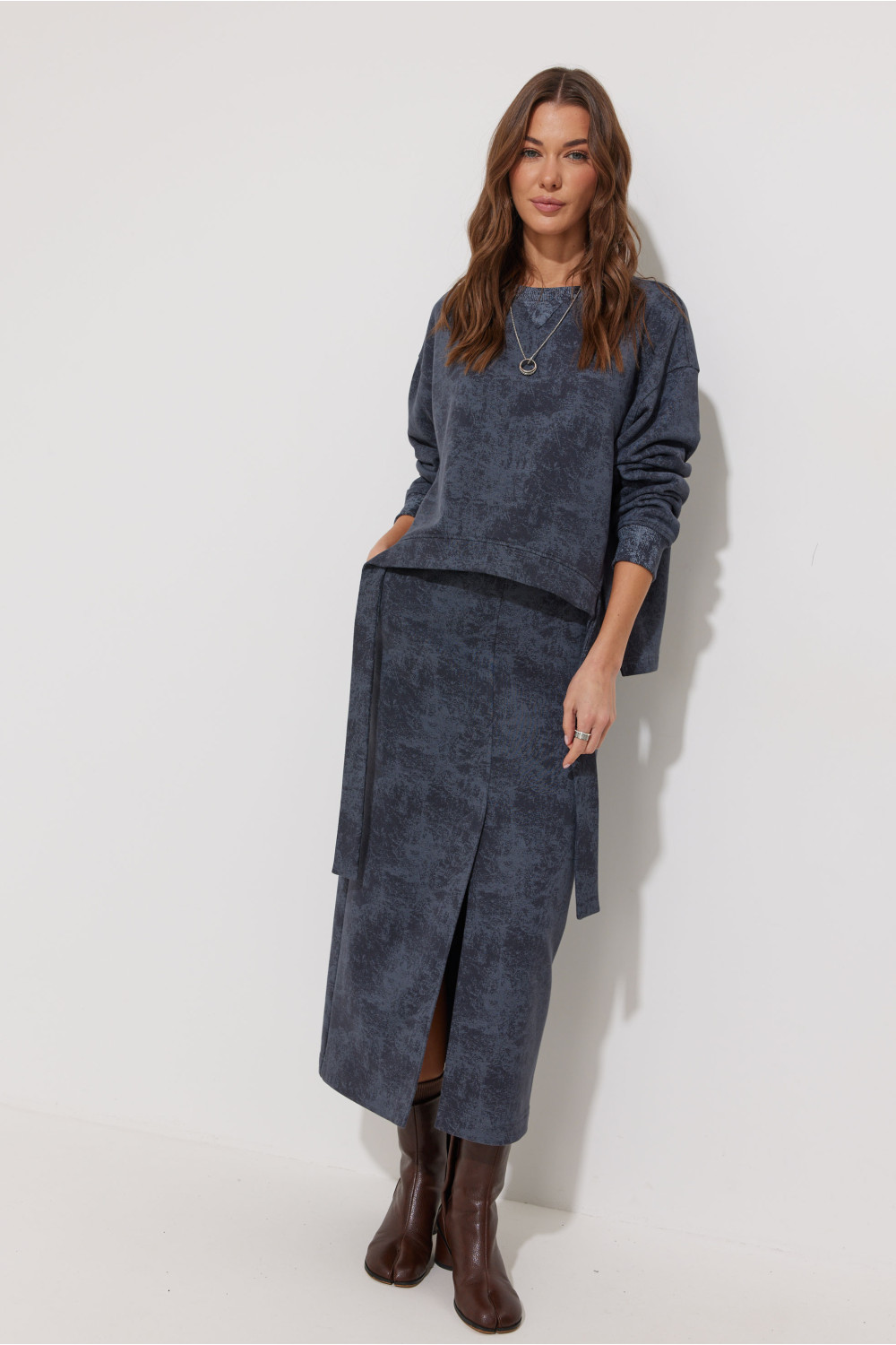 Юбка полуприлегающего силуэта из трикотажного полотна. По верху юбки притачной пояс с резинкой. По переду средний шов со шлицей и карманы. На заднем полотнище юбки накладные карманы.Подходит на рост 164-170 см.