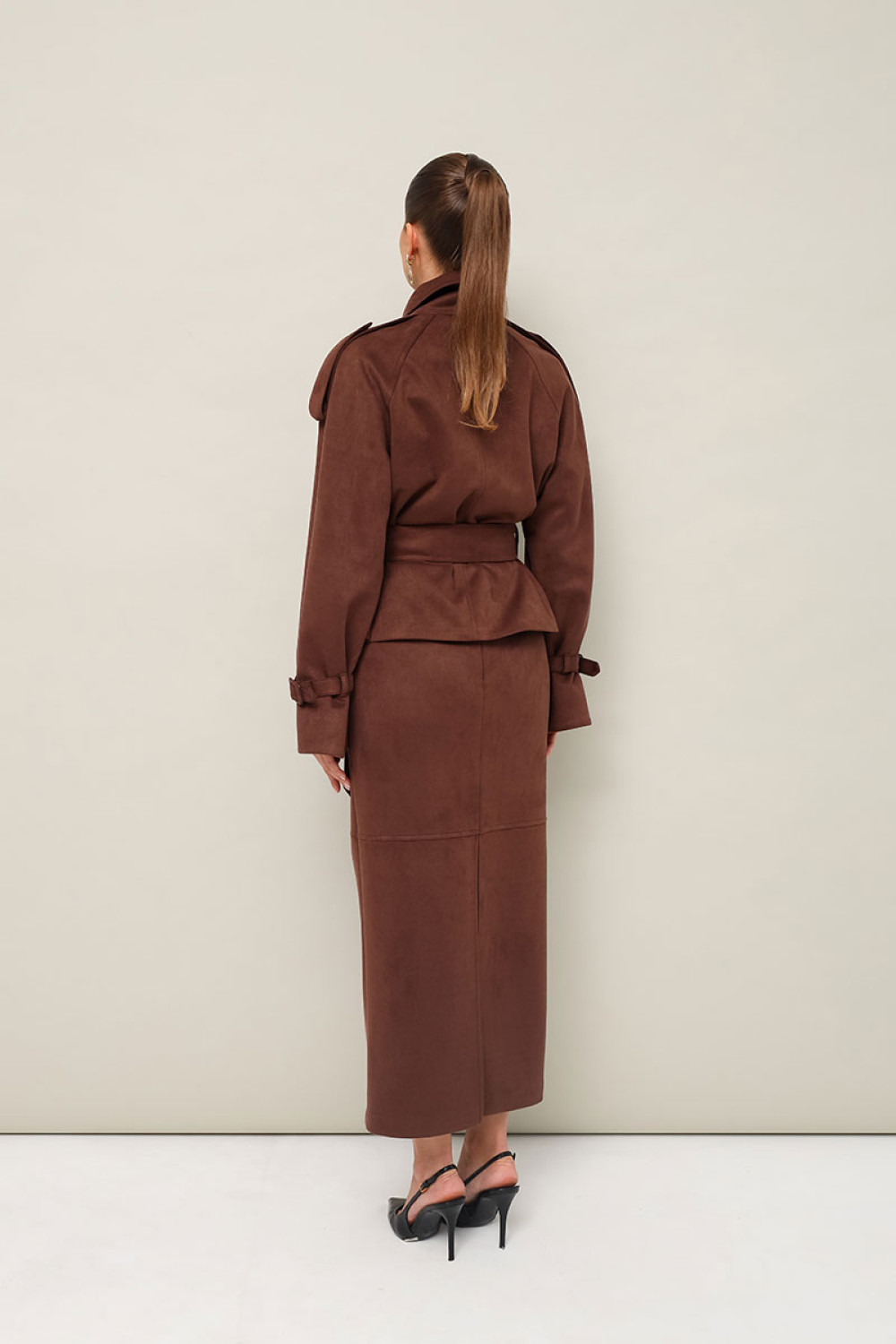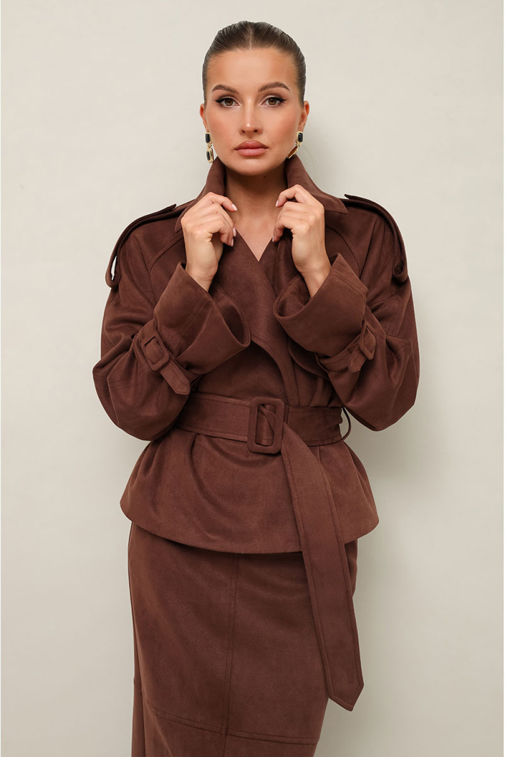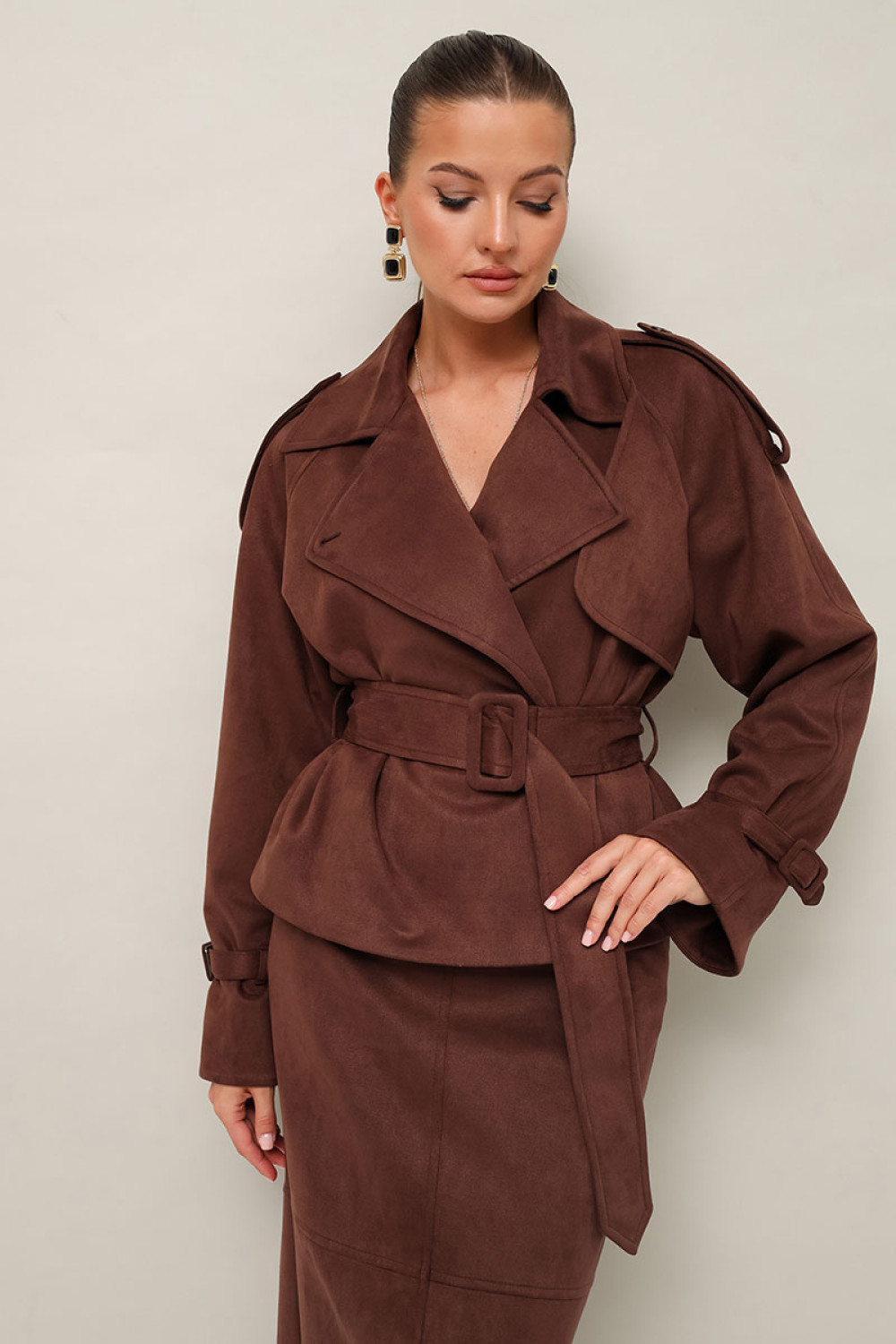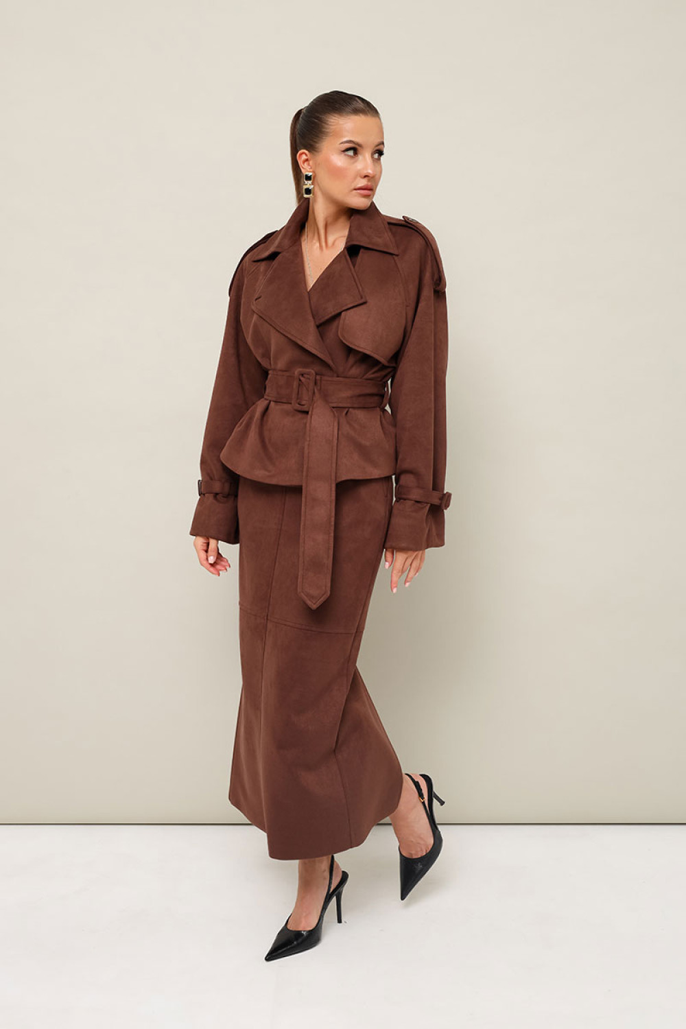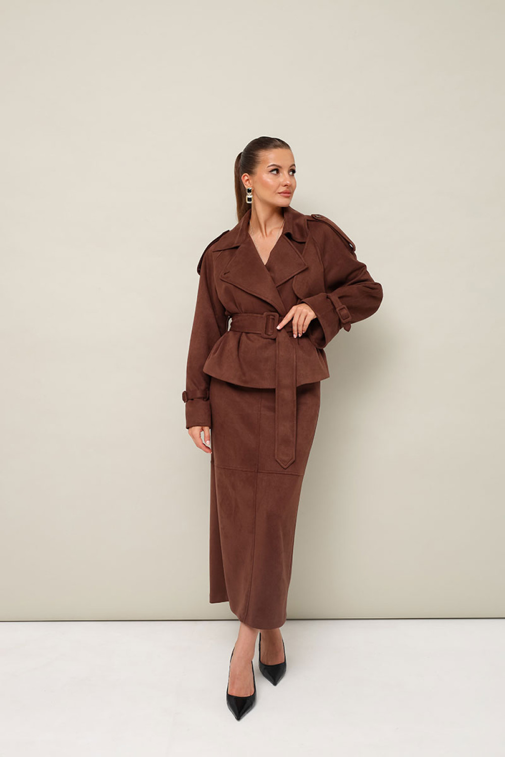 Стильный 2-предметный комплект, состоящий из жакета и юбки, выполненный из эко замши.