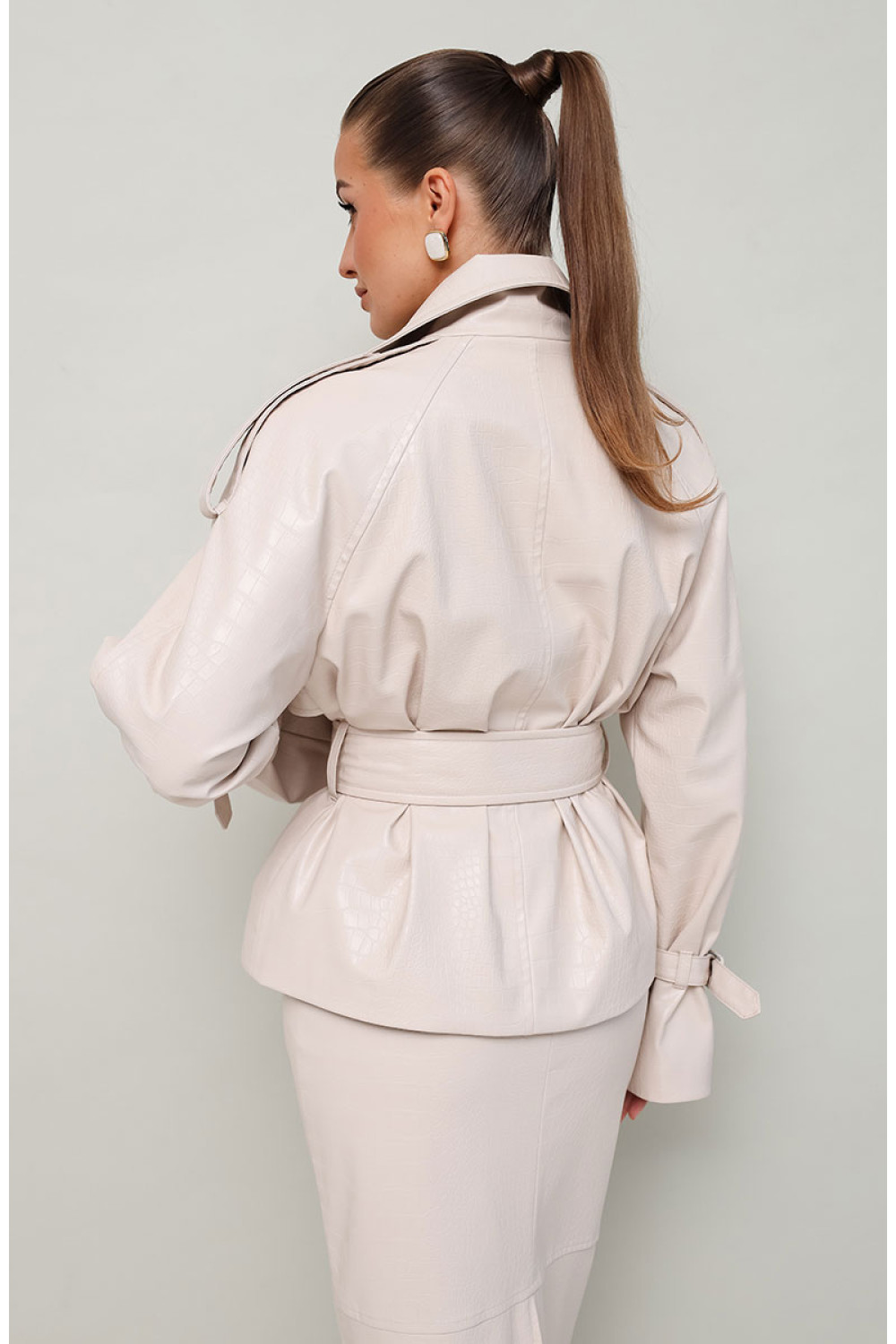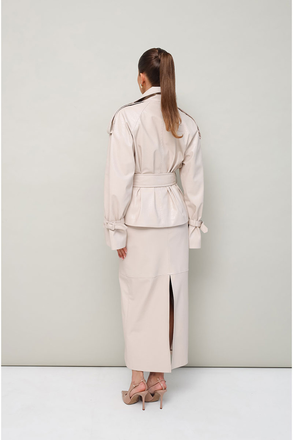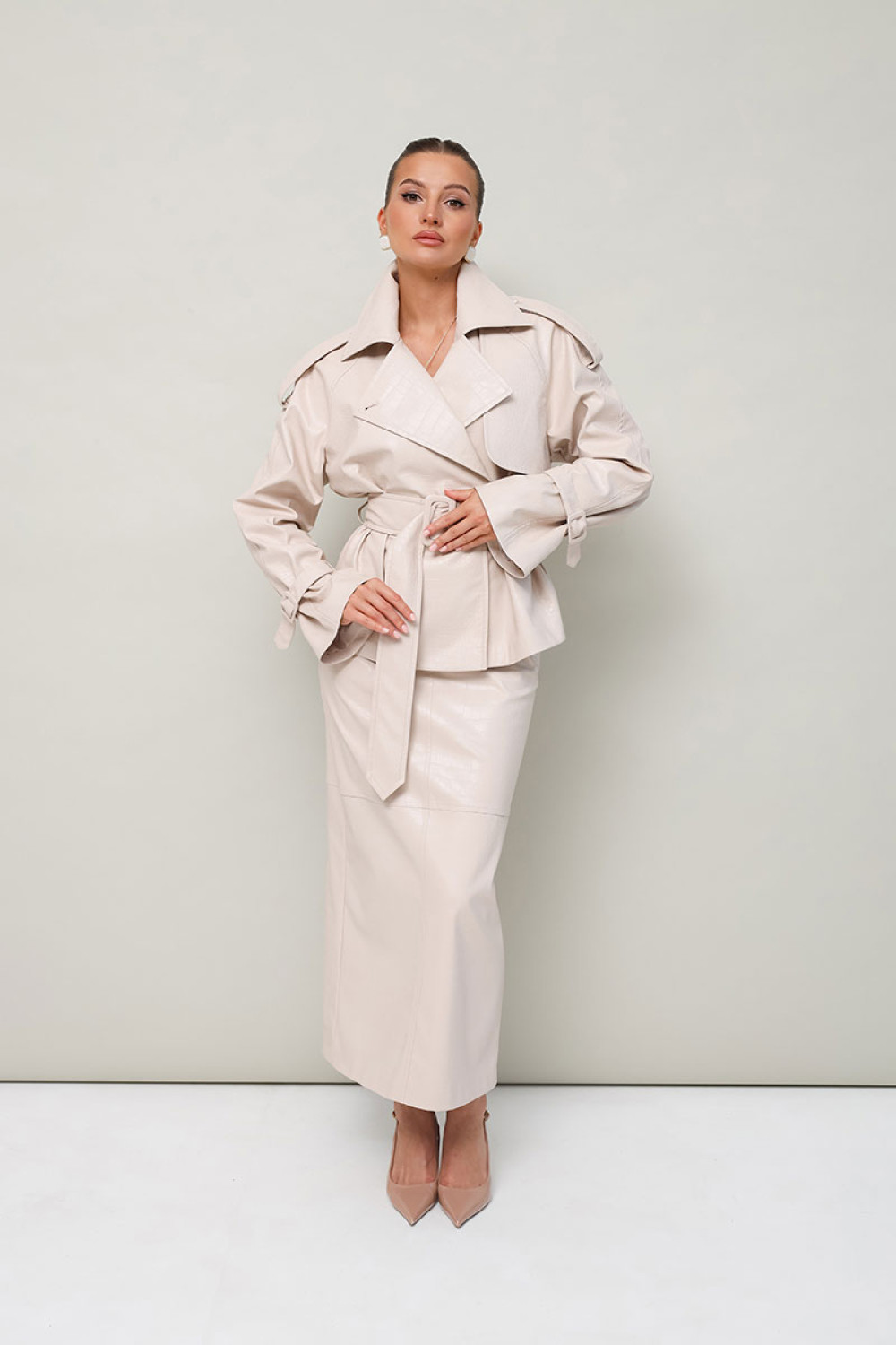 Стильный 2-предметный комплект, состоящий из жакета и юбки, выполненный из экокожи.