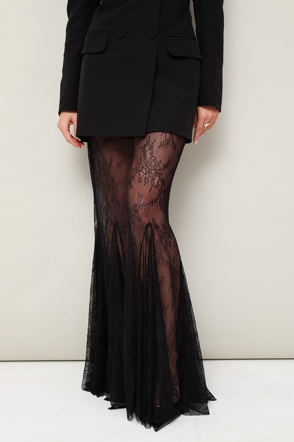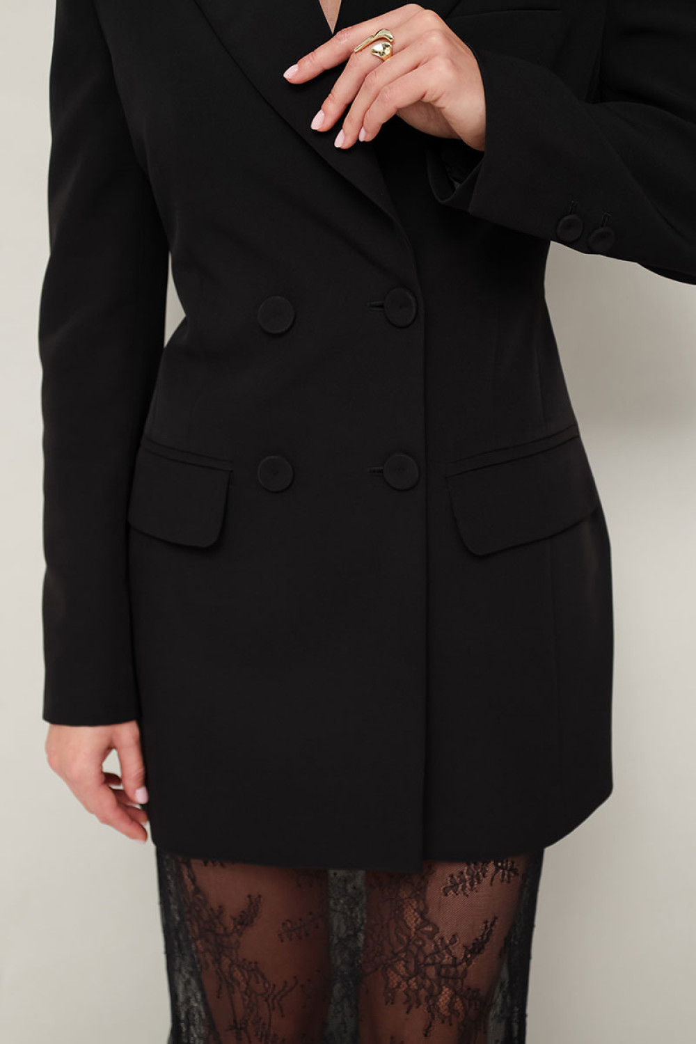 Силуэтное платье-жакет прилегающего кроя, выполнено из качественной костюмной ткани. Воротник пиджачного типа с отложными лацканами. Двубортная застежка на петли и обтяжные пуговицы. Спереди обработаны прорезные карманы в рамку с клапанами и нагрудный прорезной карман с листочкой. Рукава втачные, двухшовные с отлетными шлицами и обтяжными пуговицами. Спинка с рельефами и средним швом. Платье-жакет на подкладке.Силуэтная юбка годе с расклешением от линии колен с втачными клиньями. Юбка выполнена из изысканного кружевного полотна. Пояс обработан резинкой для комфорта и регуляции размера.