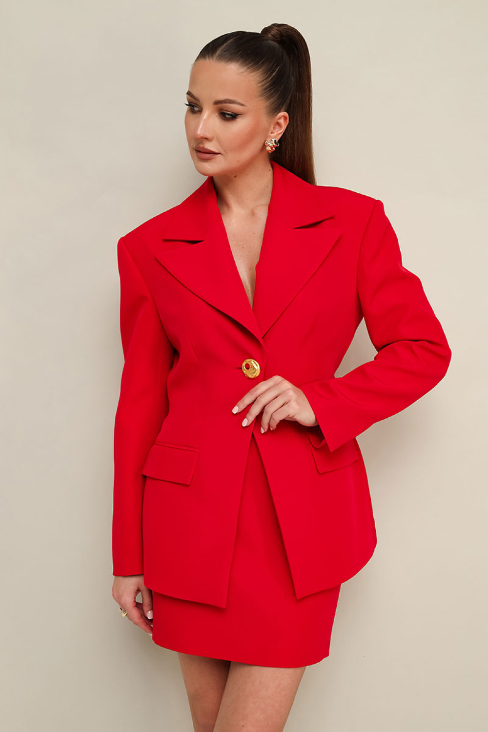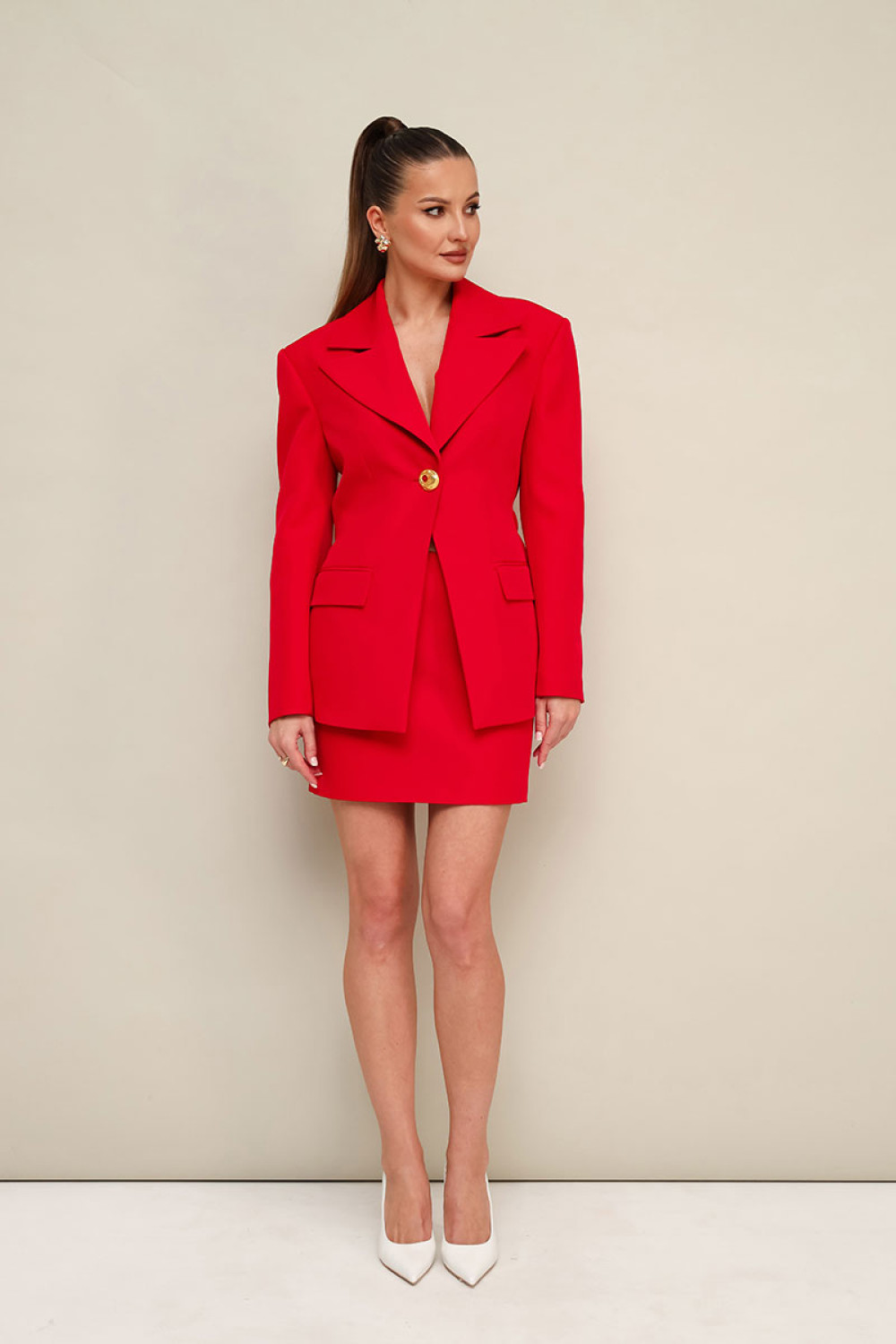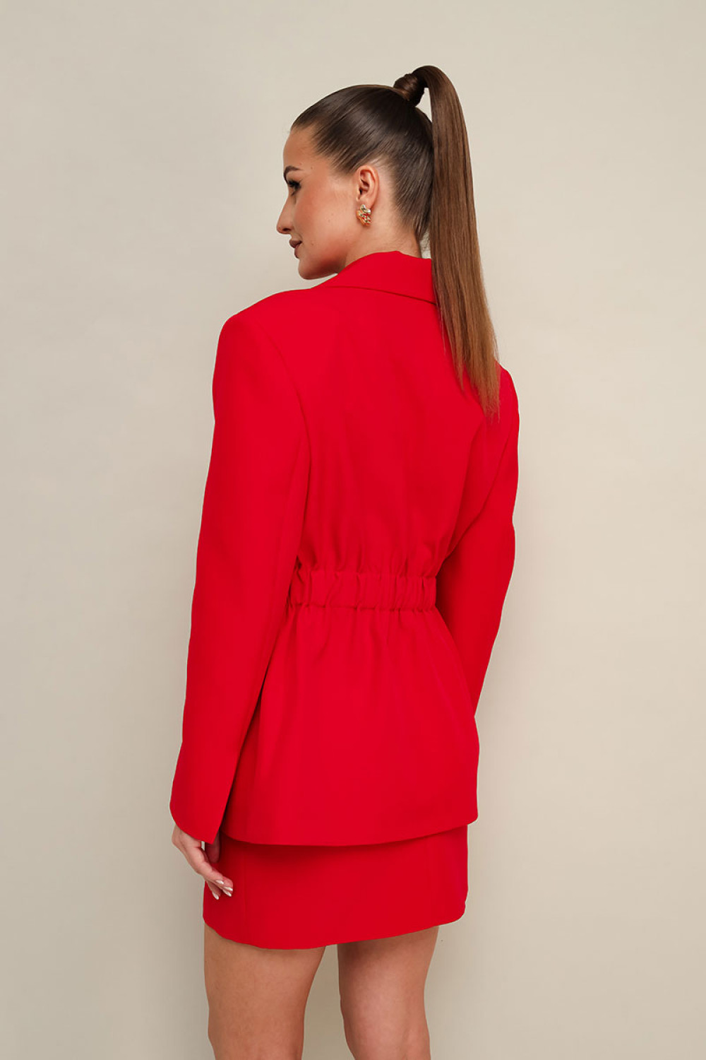 Юбка в длине мини, на обтачке по поясу. Спереди обработаны карманы в рамку. Застежка на потайную молнию в среднем шве спинки. Жакет и юбка на подкладке.ПЭ 97%, спандекс 3%