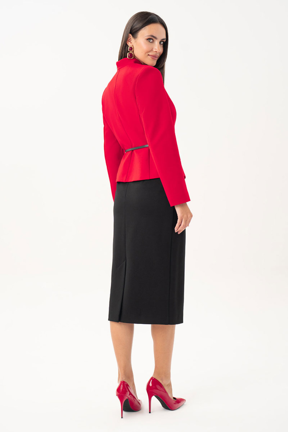Жакет Длина по среднему шву спинки - 55,5 см (±2,0 см), Ширина спинки (между швами втачивания рукавов, в самом узком месте) - 37,0 см (±0,5 см), Ширина на уровне глубины проймы - 49,5 см (±1,0 см), Ширина на уровне линии талии - 43,0 см (±1,0 см), Ширина жакета по линии низа - 54,0 см (±1,0 см), Длина рукава - 61,5 см (±1,0 см), Ширина рукава вверху - 18,0 см (±0,5 см), Ширина рукава по низу - 13,0 см (±0,5 см), Длина плеча - 11,7 см (±0,5 см). Юбка Длина юбки по среднему шву заднего полотнища с поясом - 78,0 см (±3,0 см), Ширина на уровне линии талии (по поясу) - 38,0 см (±1,0 см), Ширина на уровне линии бедер - 50,0 см (±1,0 см), Ширина по низу юбки - 46,0 см (±1,0 см), Ширина пояса - 3,5 см.