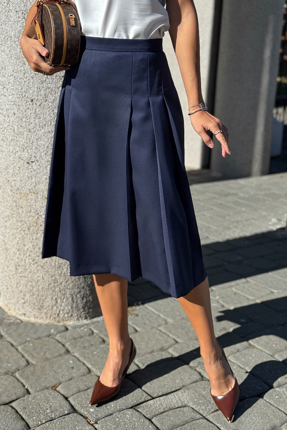 Юбка расклешенная к низу, на отлетной подкладке, на притачном поясе, застегивающимся на 1 петлю и пуговицу. Переднее полотнище с тремя парами складок. Складки частично застрочены от пояса и заутюжены до низа. Заднее полотнище с талиевыми вытачками, со средним швом, в верхней части которого обработана застежка на потайную тесьму-молнию. В 50,52,54 размерах в поясе предусмотрены резинки для лучшего прилегания по талии.44 размер