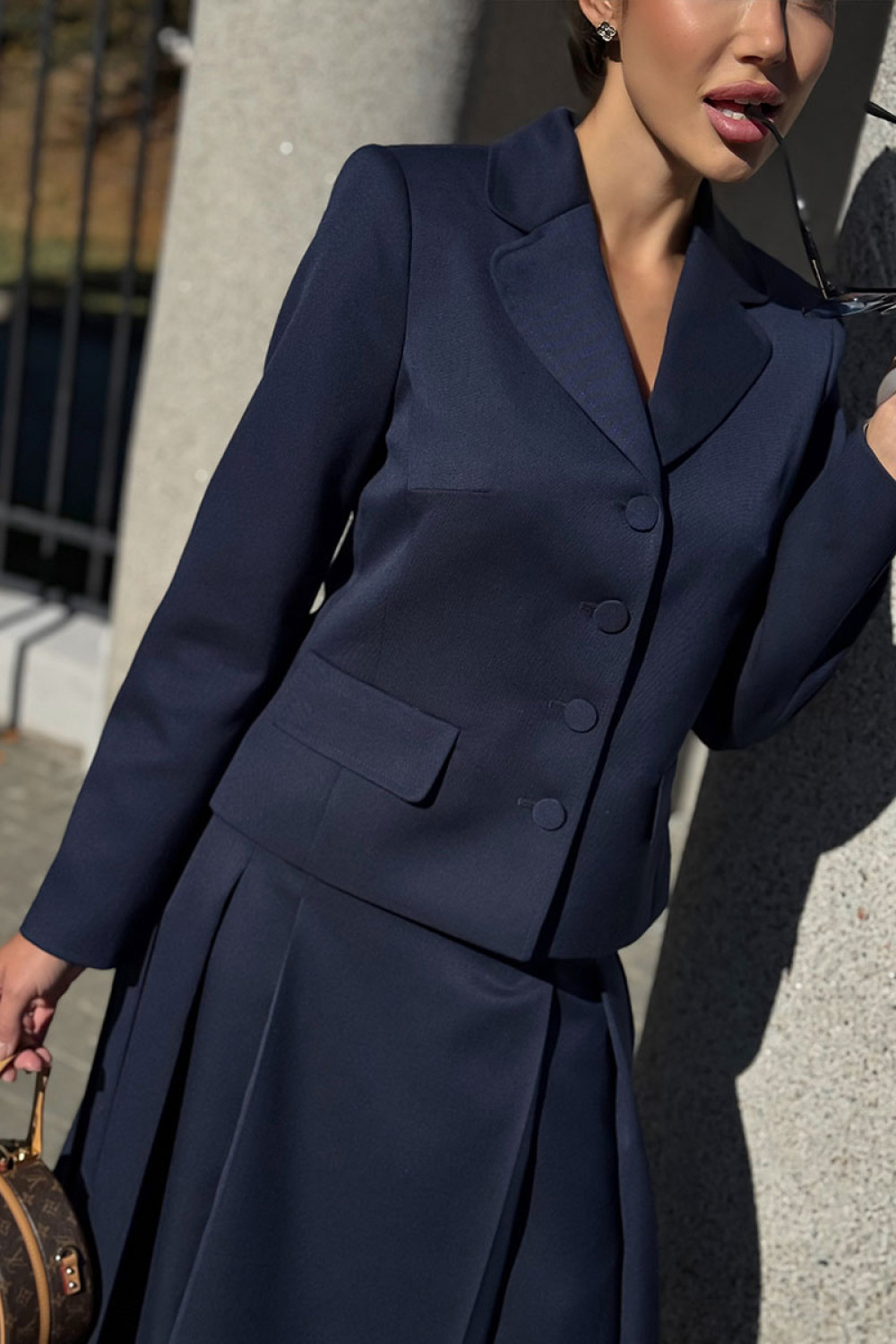 Жакет полуприлегающего силуэта, на подкладке, с центральной бортовой застежкой на 4 петли и 4 пуговицы (размер и цвет фурнитуры может незначительно отличаться от фото). Перед со смещенными рельефными швами, идущими из пройм вниз, с нагрудными вытачками, выходящими из рельефных швов к центрам, в нижних частях с прорезными карманами с клапанами. Спинка с рельефными швами и средним швом. Рукава втачные, двухшовные, длинные. Горловина оформлена воротником пиджачного типа. Концы воротника и лацканов закруглены. По воротнику, лацканам, бортам, клапанам прострочена отделочная строчка ш. 0,7 см.